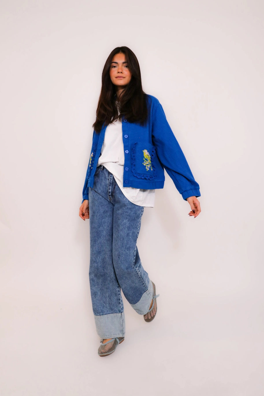 Os bordados em ponto cruz nos bolsos e o motivo floral nas costas acrescentam um toque artesanal e delicado, tornando esta peça especial e cheia de personalidade.