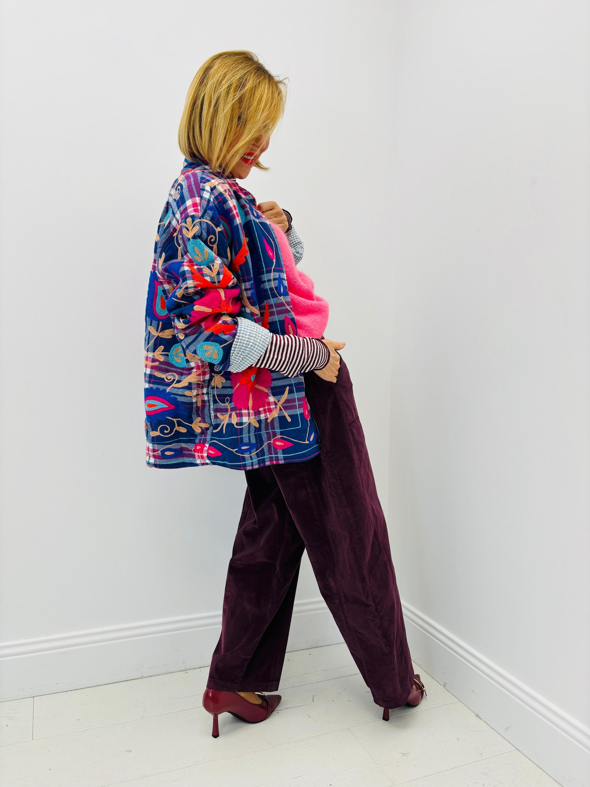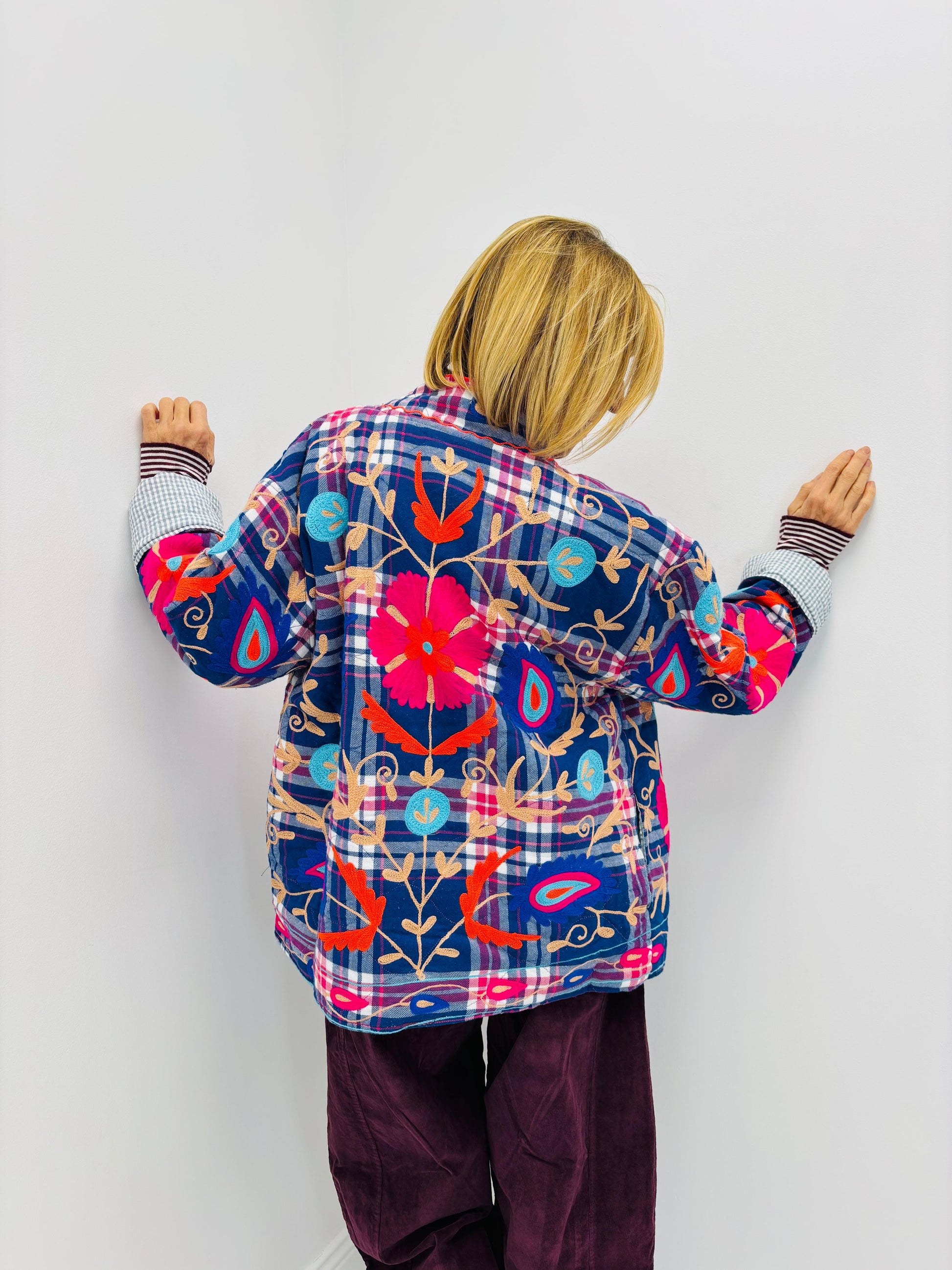 Um casaco que é pura expressão artística — vibrante, original e impossível de passar despercebido. O Casaco Funky Flora combina padrão xadrez com bordados florais intensos, criando uma peça única que transforma qualquer look numa afirmação de estilo.