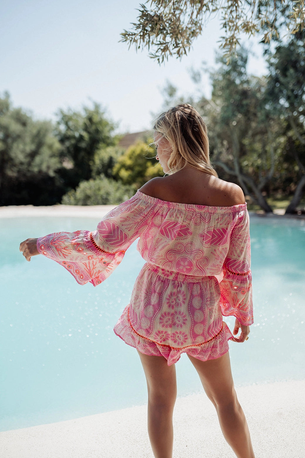 Conjunto de duas peças em tecido leve com estampado integral em tons rosa.