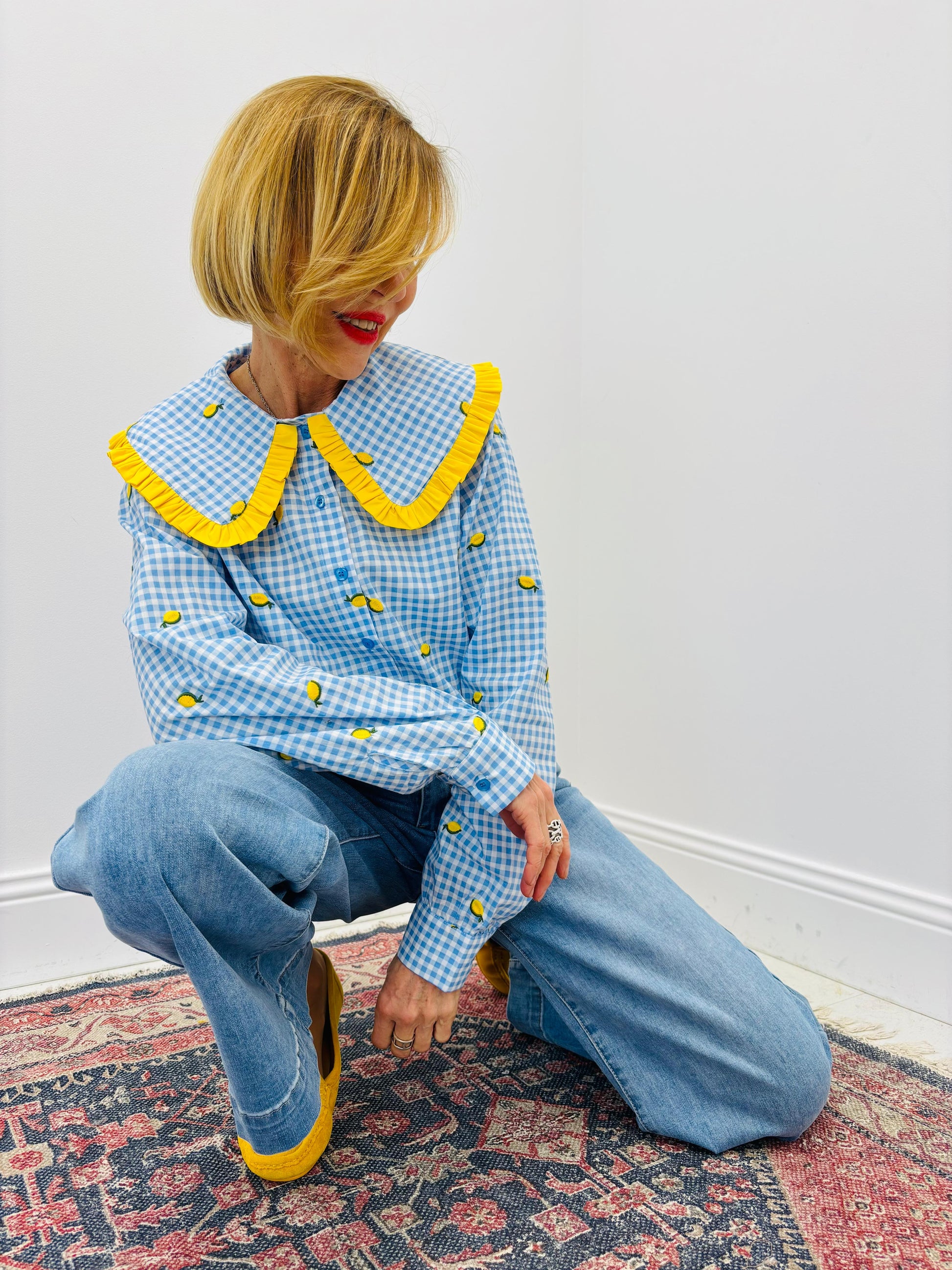 Uma camisa que é pura alegria em forma de tecido. A Lemon Sky Blouse combina o clássico padrão vichy azul com delicados limões bordados e um colar oversized com folho amarelo que faz toda a diferença.