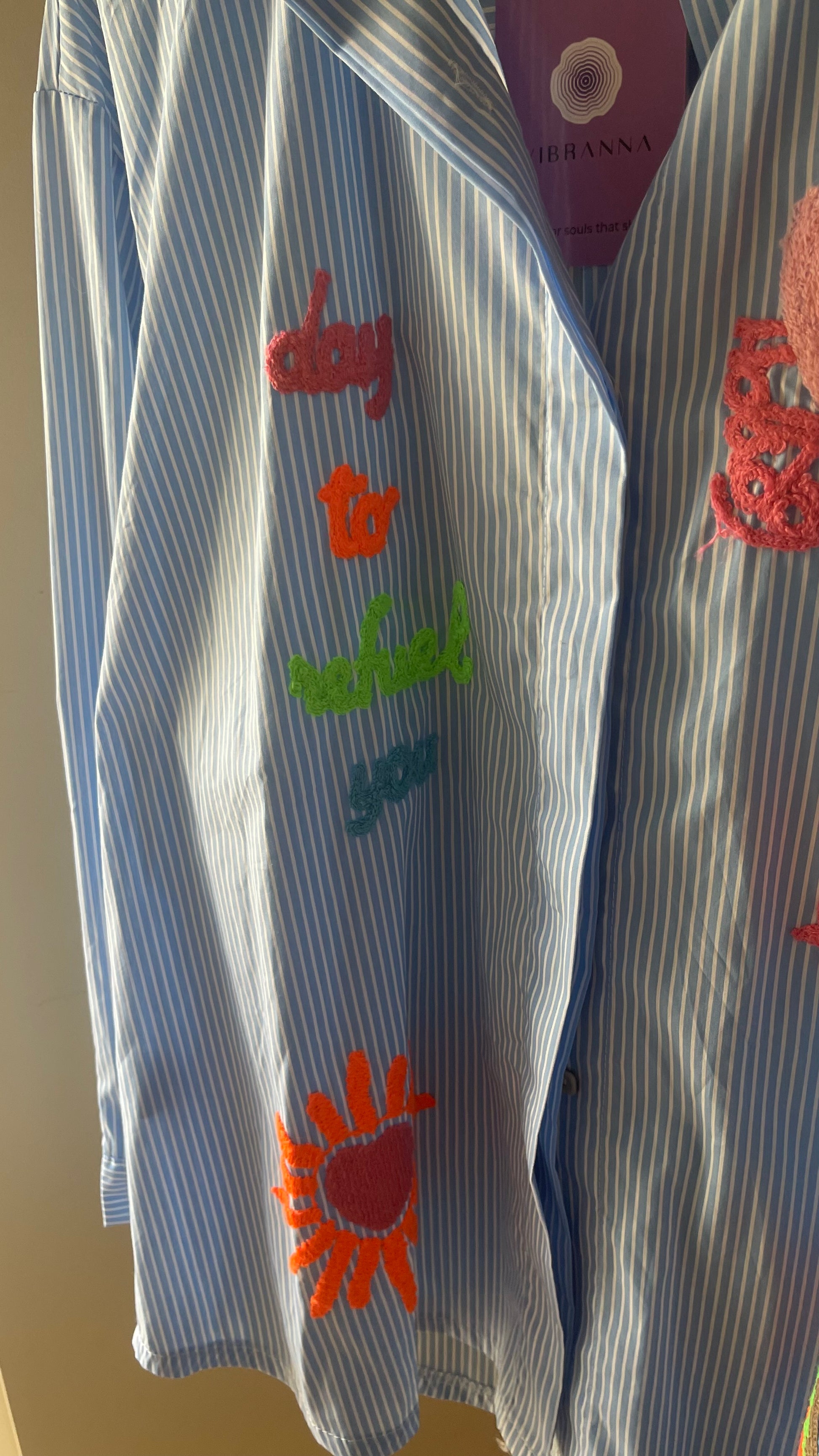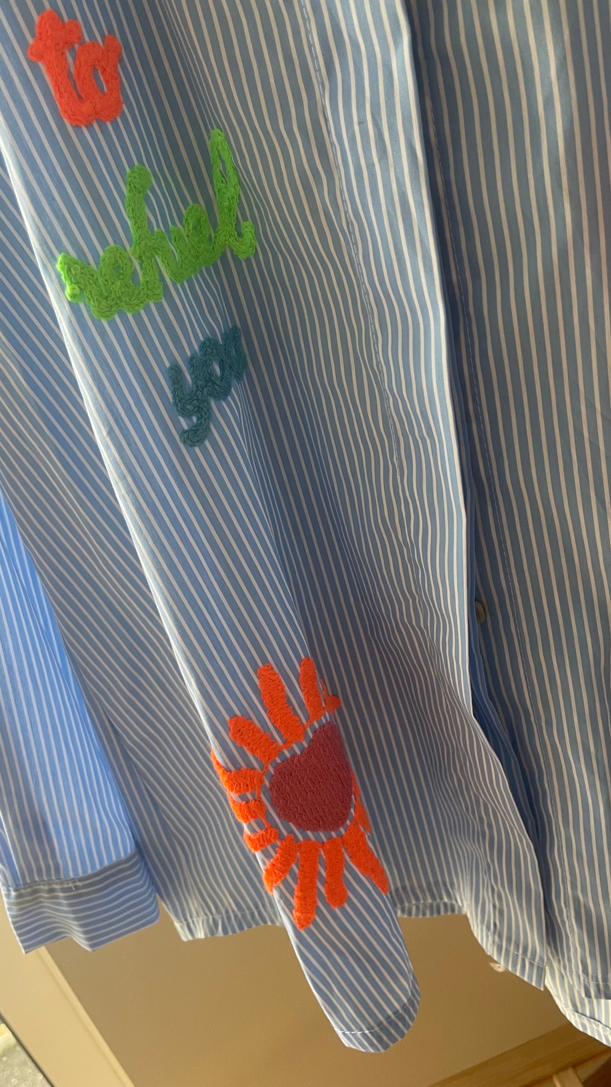 Uma camisa que celebra a alegria, a criatividade e a liberdade de ser. A Rainbow Love Blue combina o clássico riscado azul com bordados coloridos cheios de personalidade — corações, estrelas, sol e arco-íris que transformam esta peça num verdadeiro manifesto de boa energia.