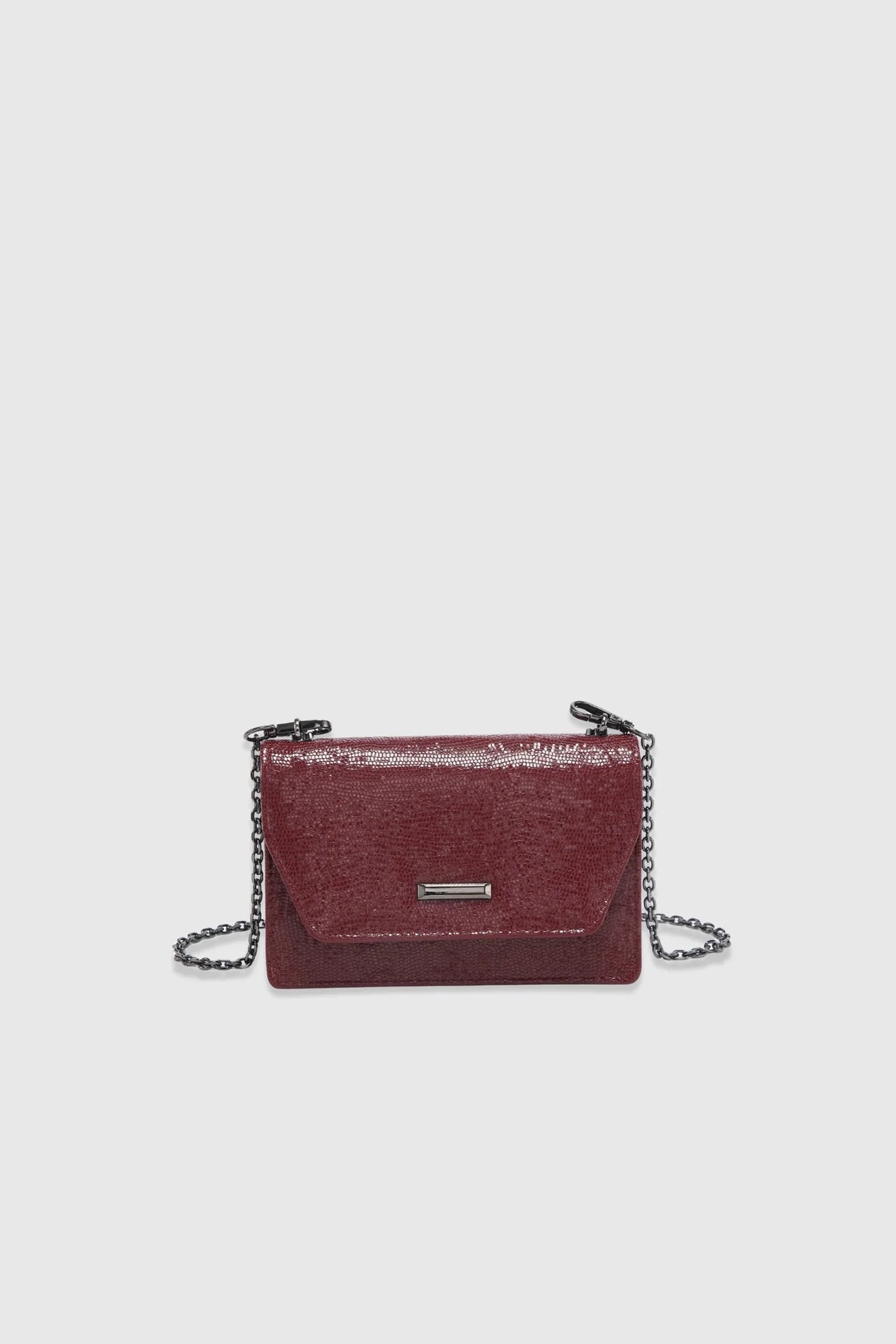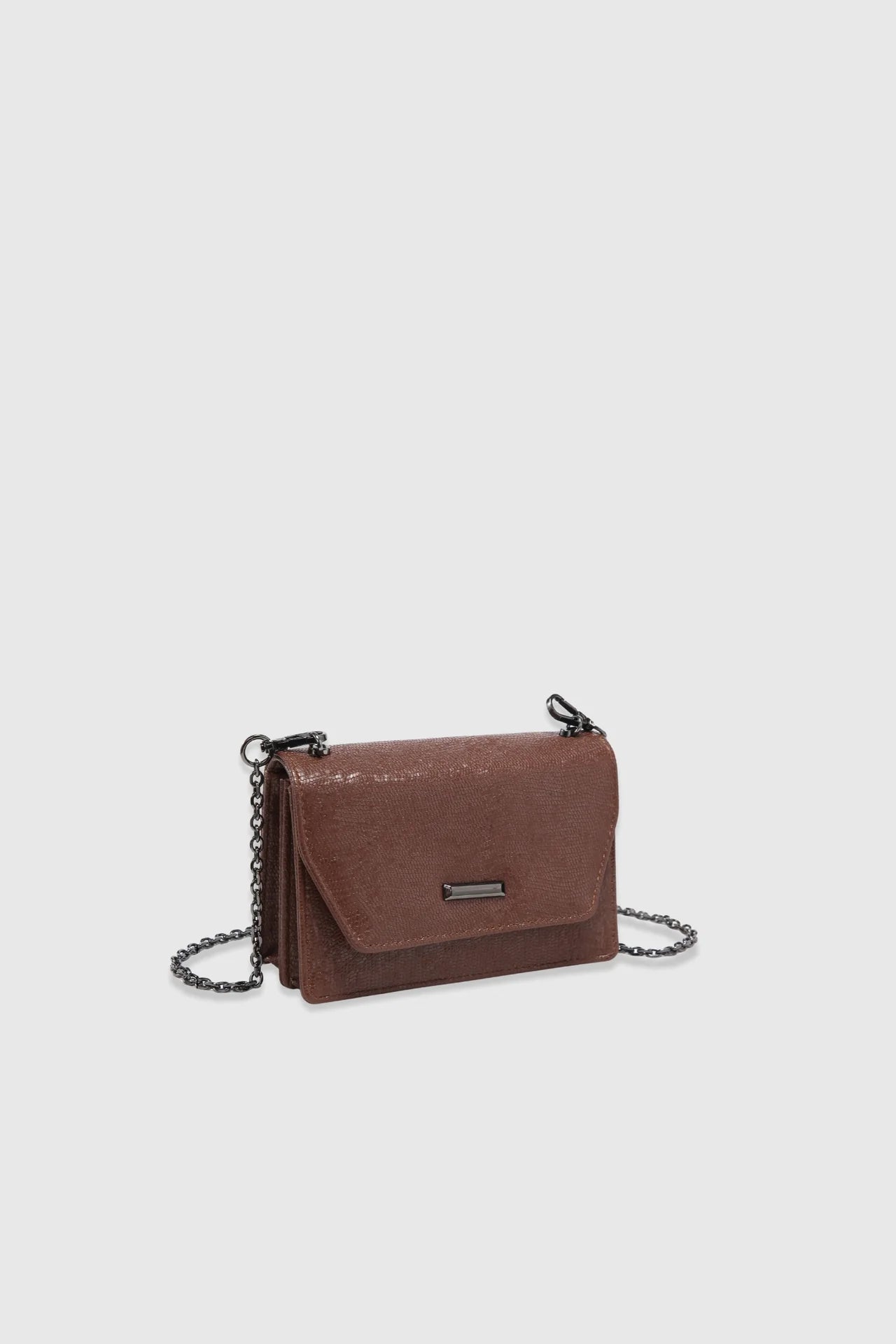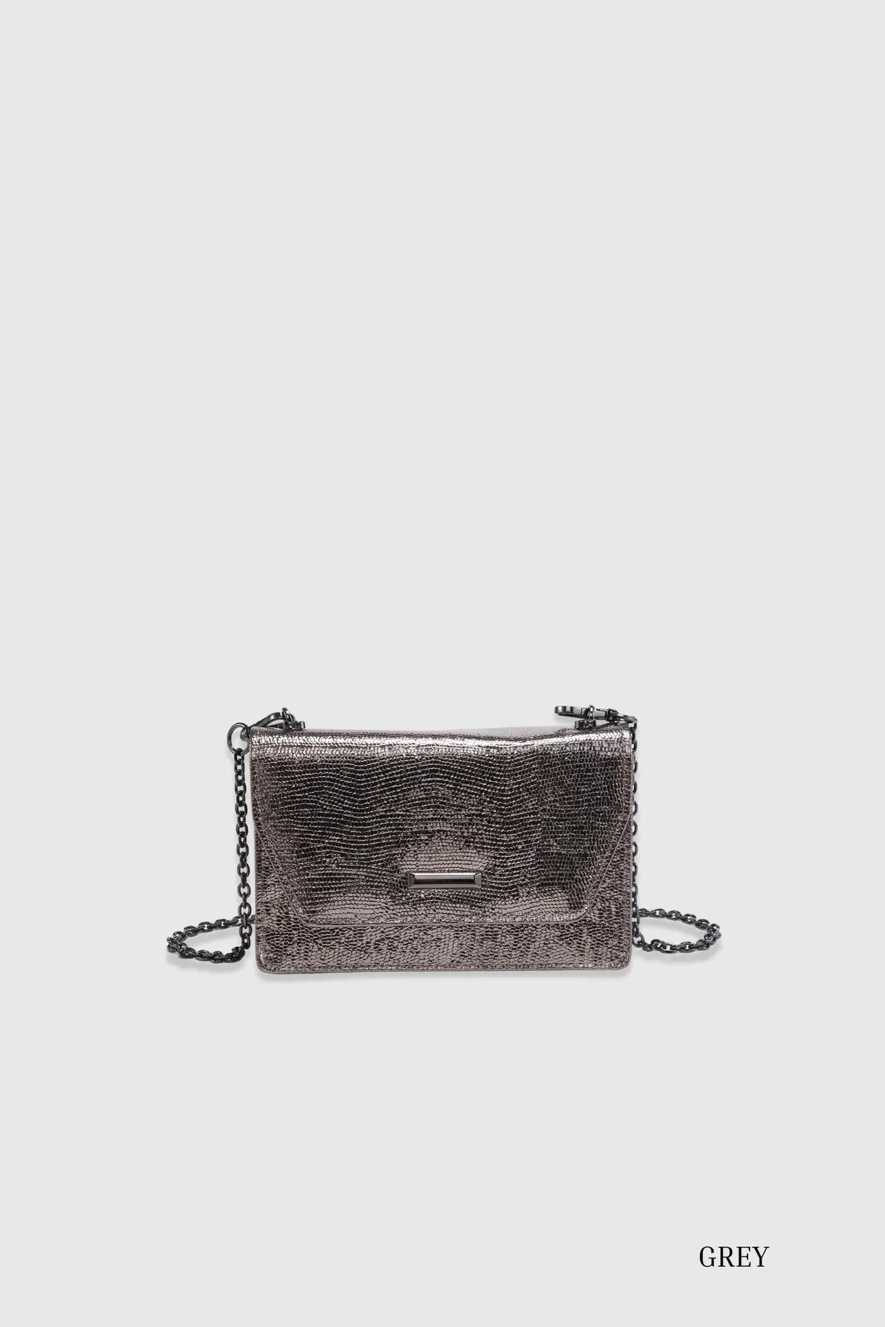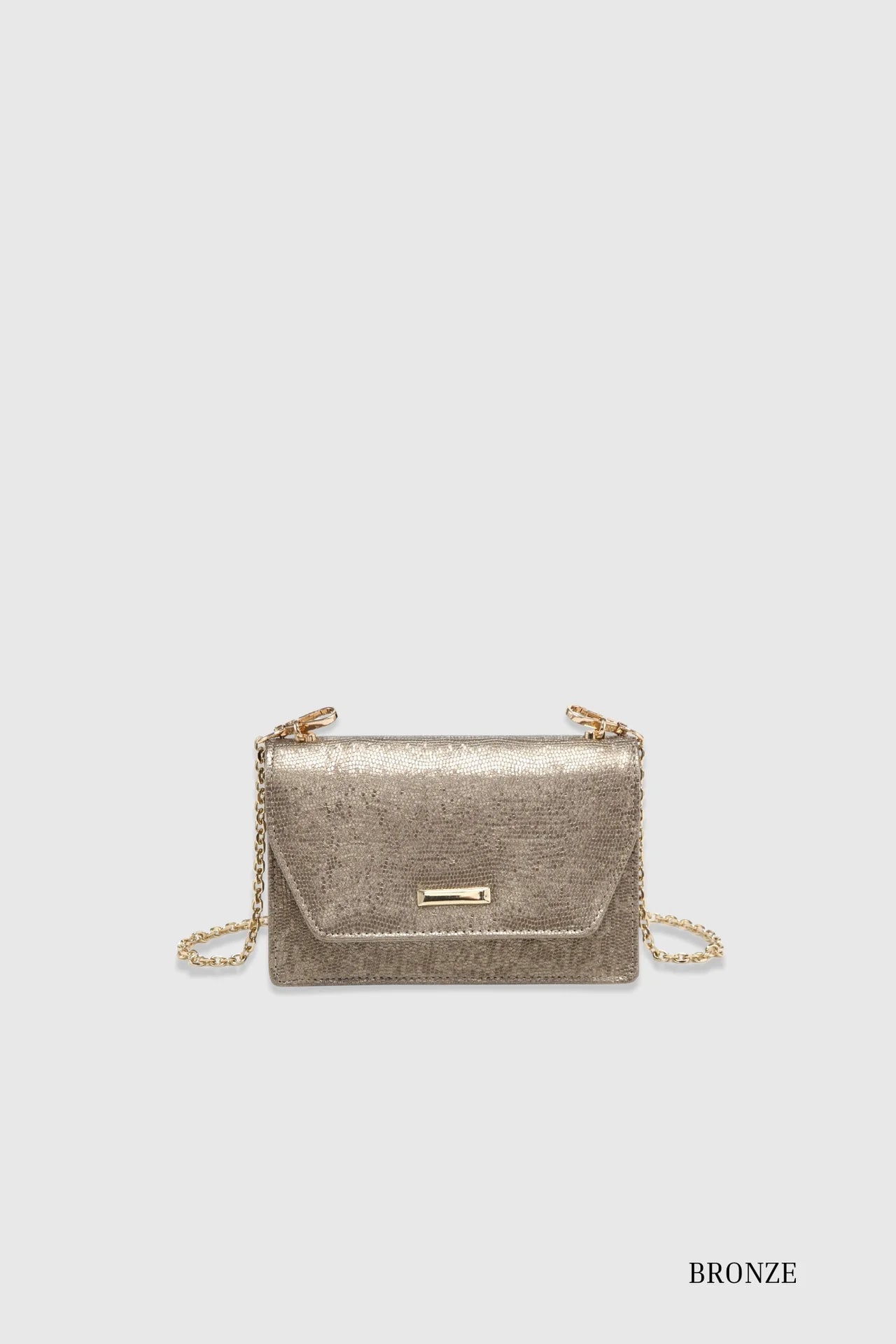 Bolsa Alessia, prática e elegante, perfeita para o dia-a-dia ou para ocasiões especiais. Apresenta um design compacto em acabamento texturizado, com aba frontal e fecho de botão de pressão. Inclui alça em corrente metálica amovível, permitindo usá-la ao ombro ou a tiracolo, de acordo com a ocasião.