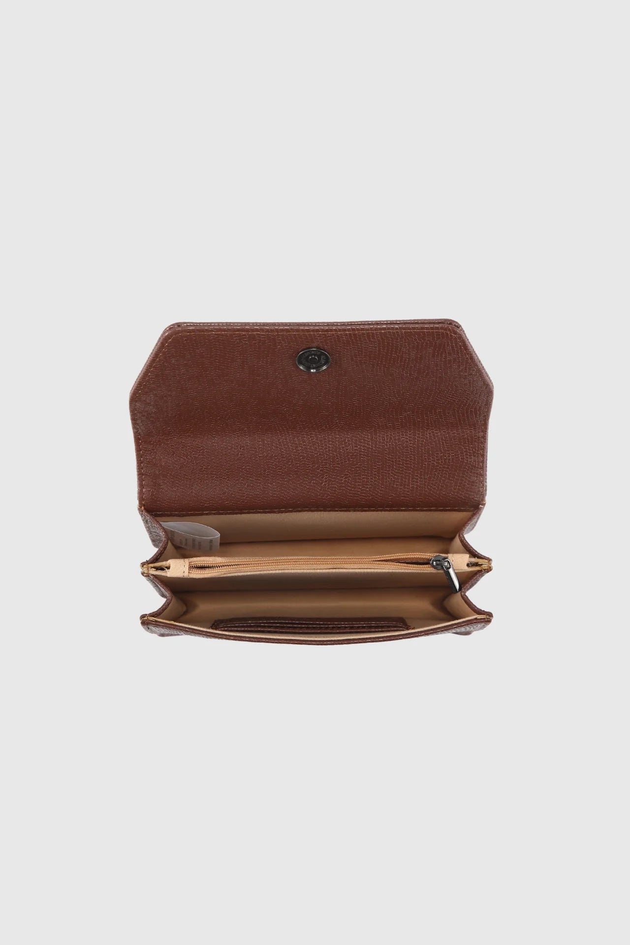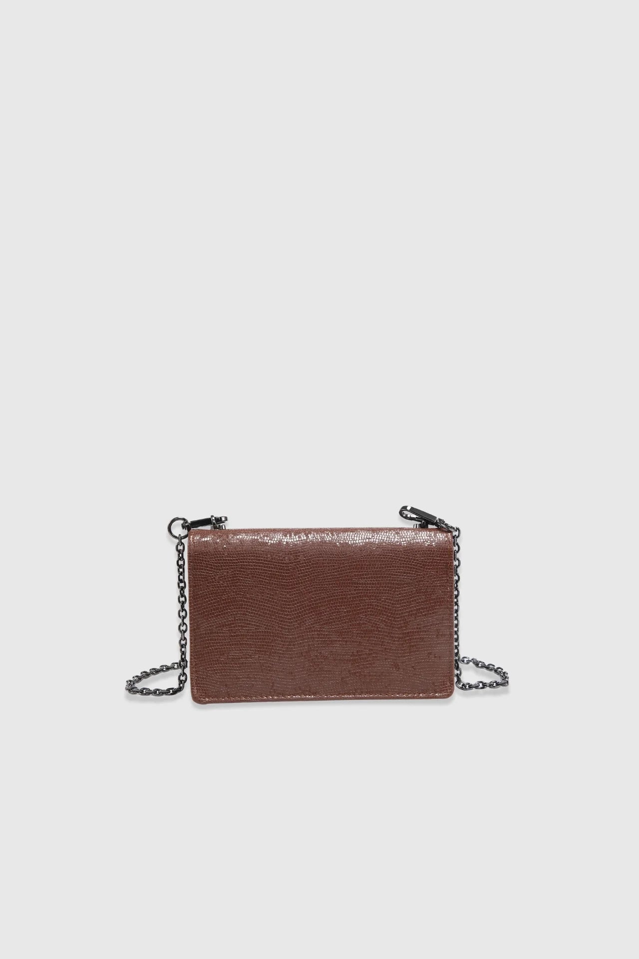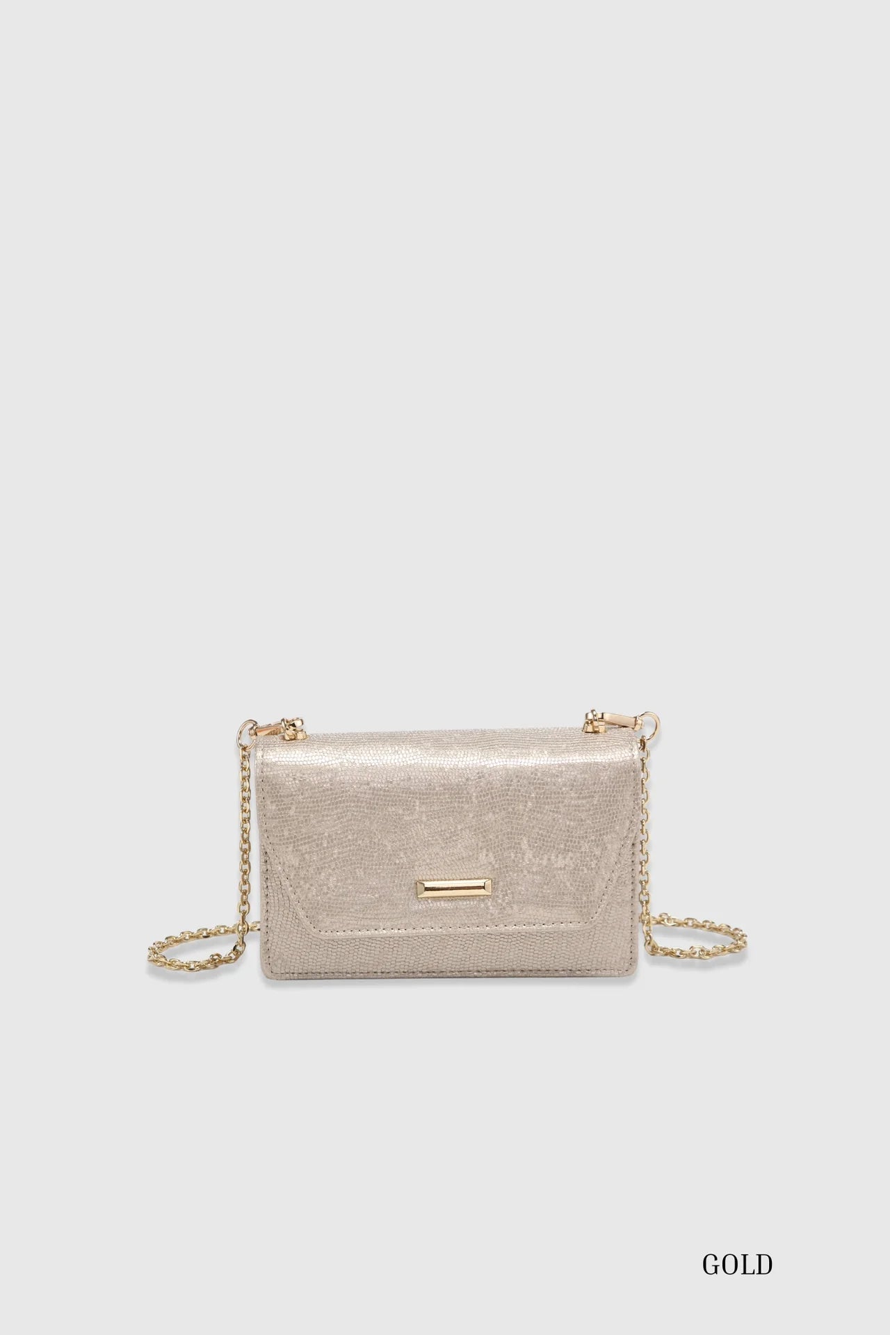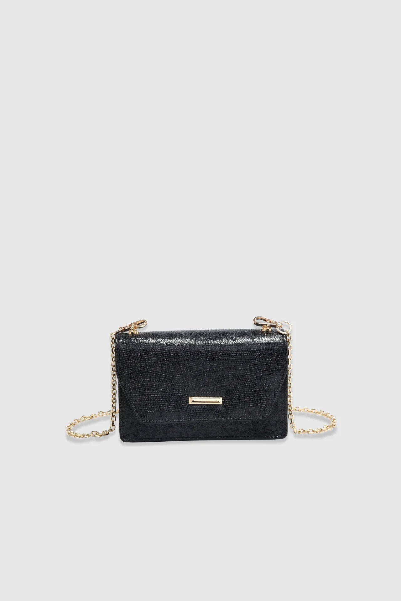 Bolsa Alessia, prática e elegante, perfeita para o dia-a-dia ou para ocasiões especiais. Apresenta um design compacto em acabamento texturizado, com aba frontal e fecho de botão de pressão. Inclui alça em corrente metálica amovível, permitindo usá-la ao ombro ou a tiracolo, de acordo com a ocasião.
