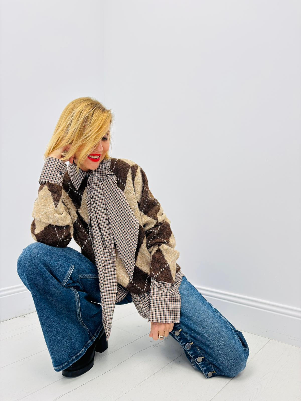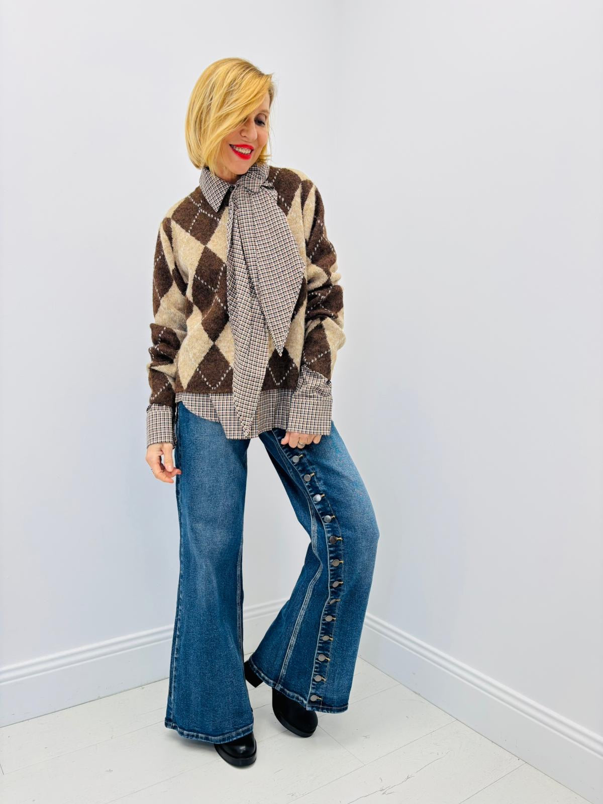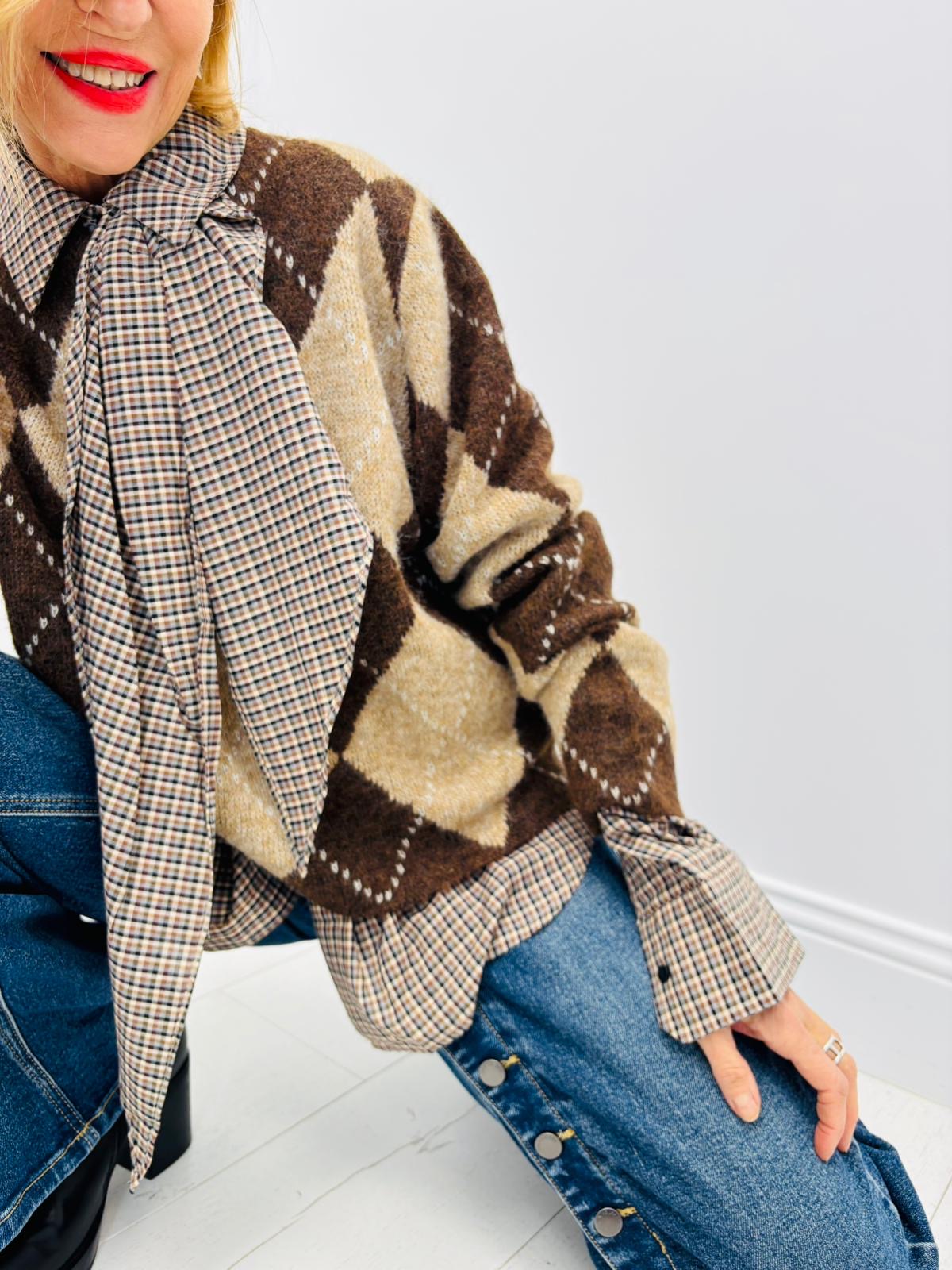 Camisola em malha suave com padrão argyle em tons de castanho, bege e creme, uma combinação clássica e elegante que traz um toque retro-chic ao visual. O tecido quente e confortável, com 7% de lã, garante aconchego e suavidade, ideal para os dias frios de outono e inverno.
