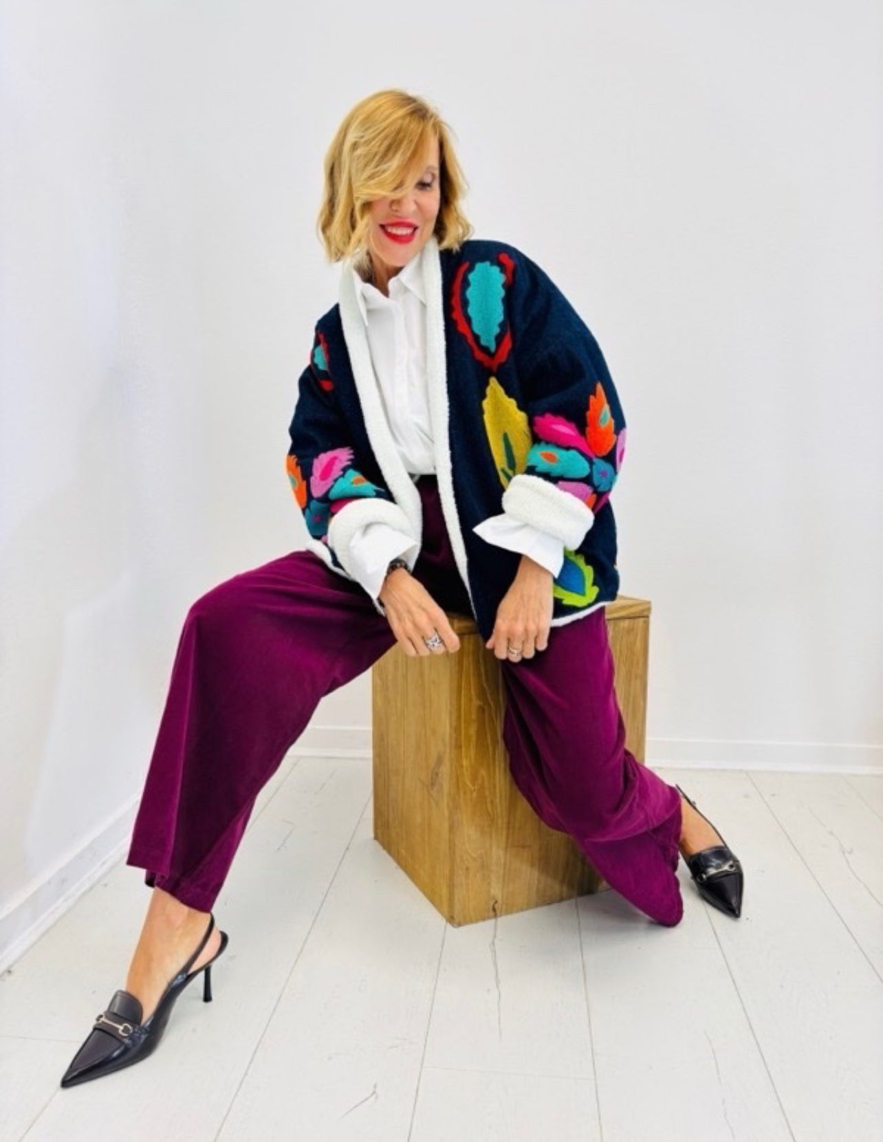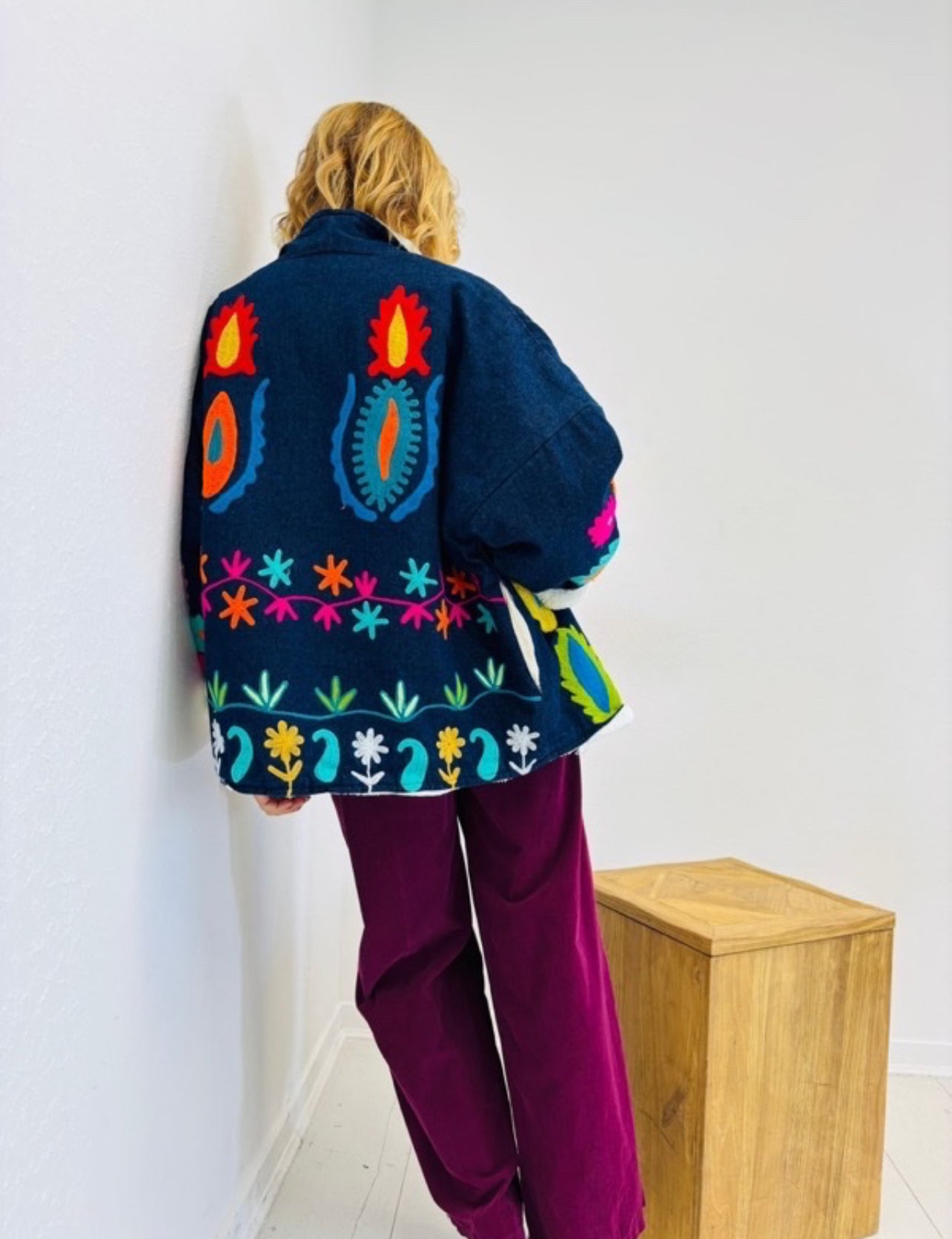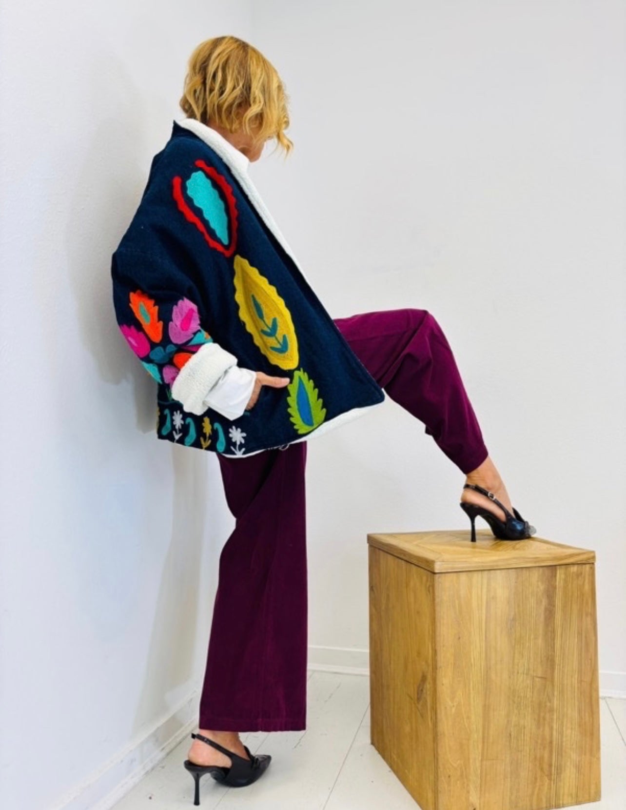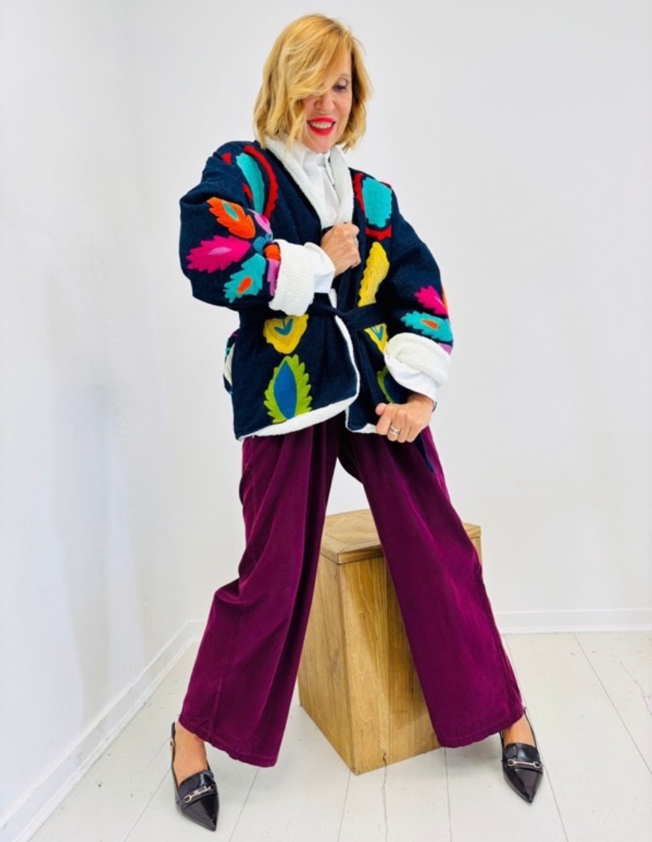 A sua corte oversize inspirado no kimono confere liberdade de movimento e uma silhueta descontraída, enquanto as bordaduras multicoloridas transformam-na numa verdadeira peça de destaque.