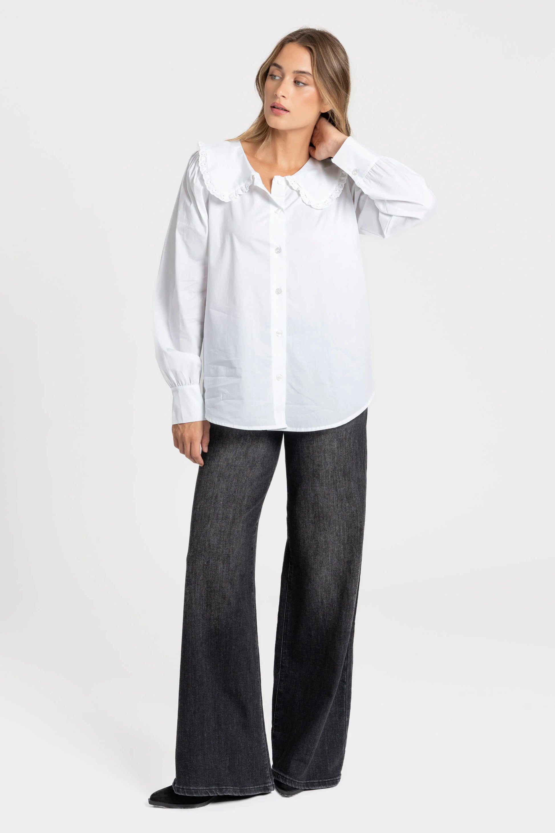 Esta camisa em tecido de algodão distingue-se pelo seu design delicado e intemporal. Apresenta mangas compridas com punhos ajustados e um elegante colarinho bobo em estilo romântico, decorado com detalhe rendado, que acrescenta um toque feminino e sofisticado ao visual. O fecho frontal com botões permite um ajuste prático e confortável, tornando-a ideal tanto para coordenados casuais como para looks mais clássicos.