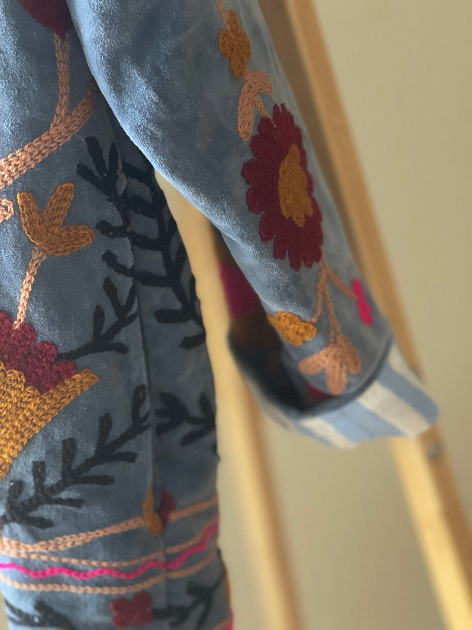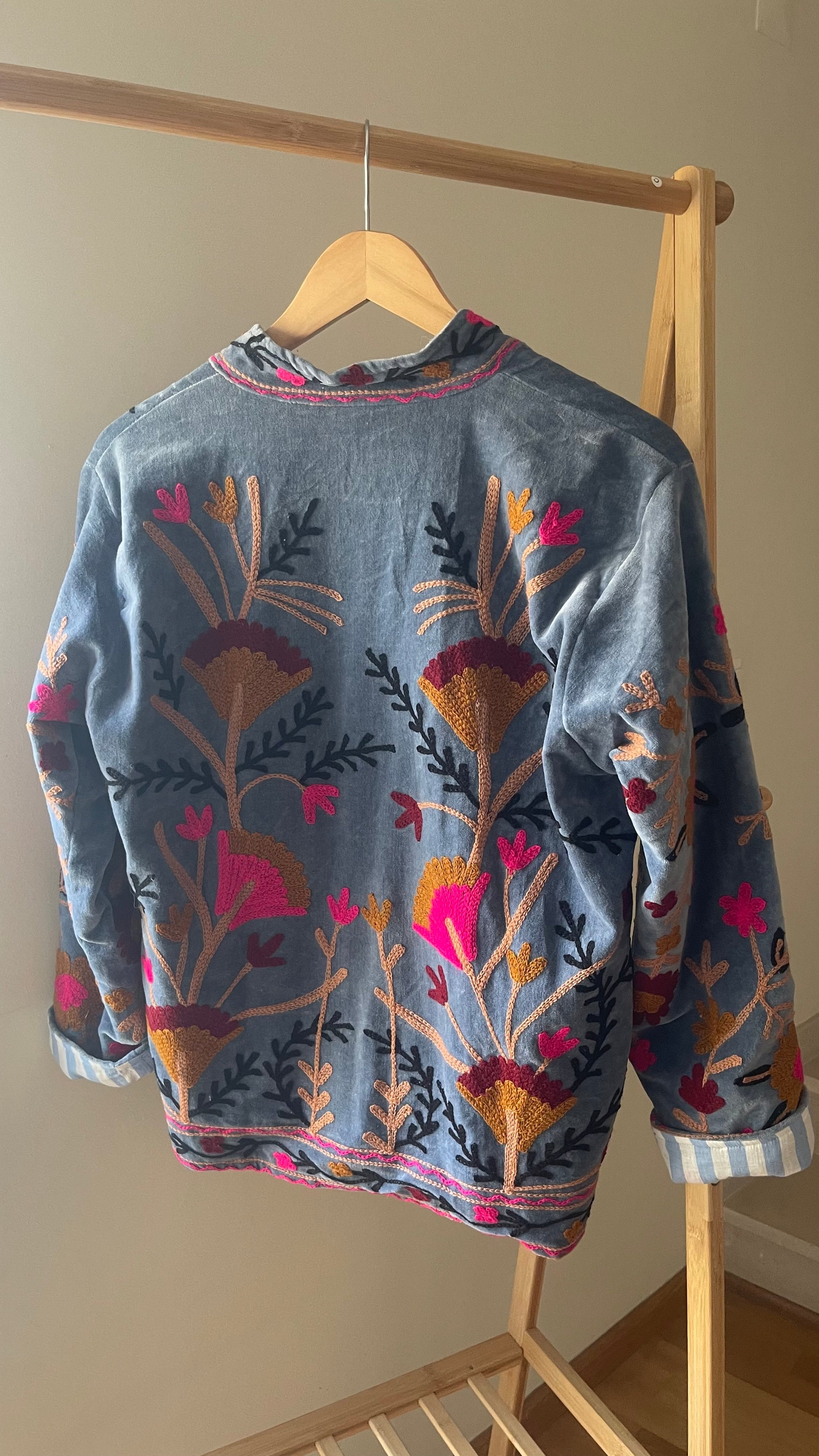 Sobre um fundo azul suave, nascem flores em tons vibrantes de rosa, mostarda e coral, criando um contraste irresistível que transforma qualquer look num verdadeiro statement. Cada bordado conta uma história — artesanal, autêntica e cheia de alma.