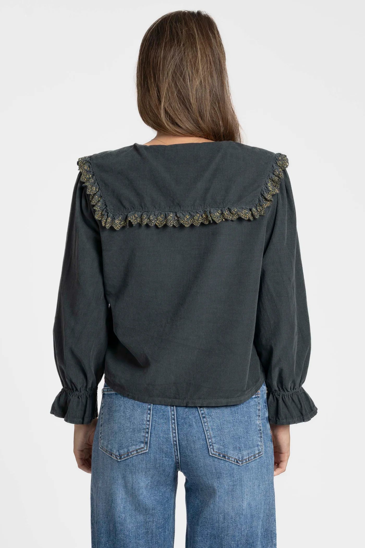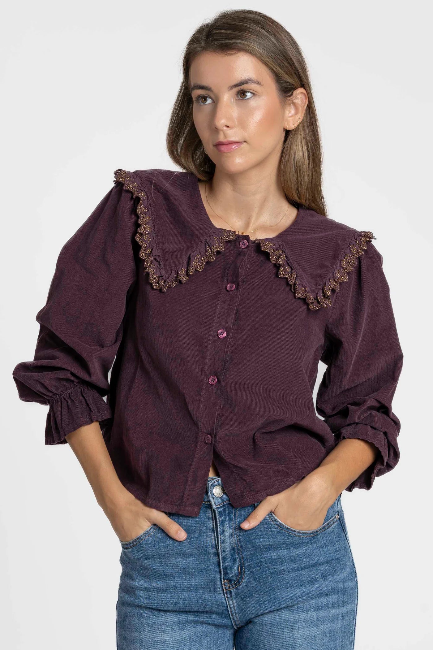 Camisa em tecido de bombazina macia, com um toque delicado e textura elegante. Apresenta gola bobo ampla, adornada com renda decorativa em contraste, que acrescenta um toque romântico e sofisticado ao visual.