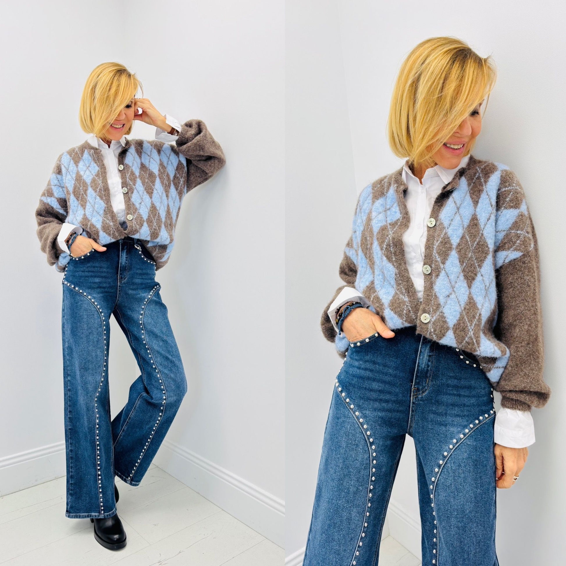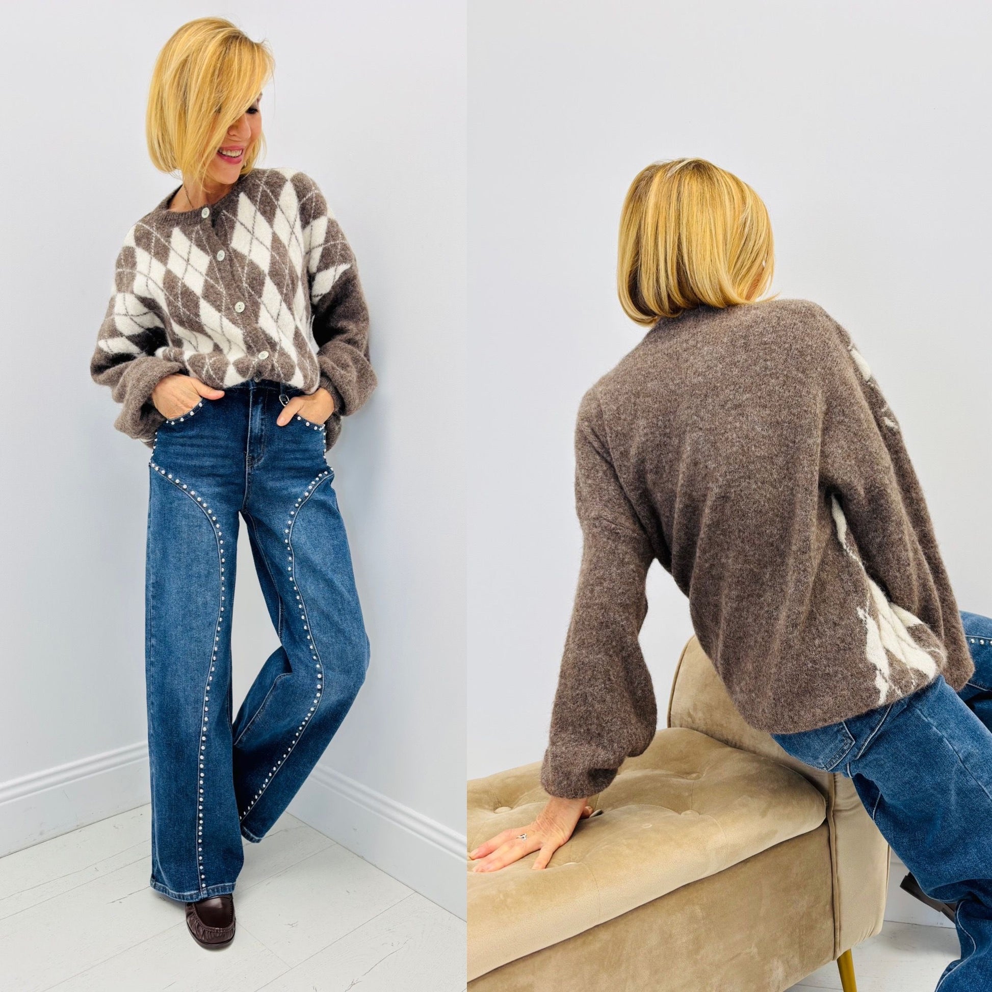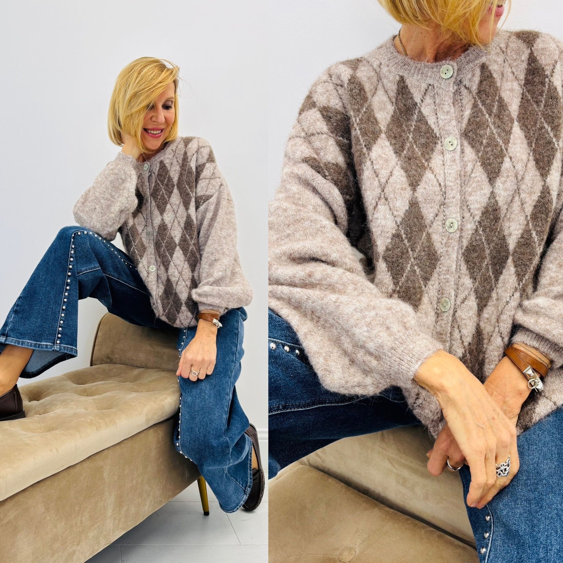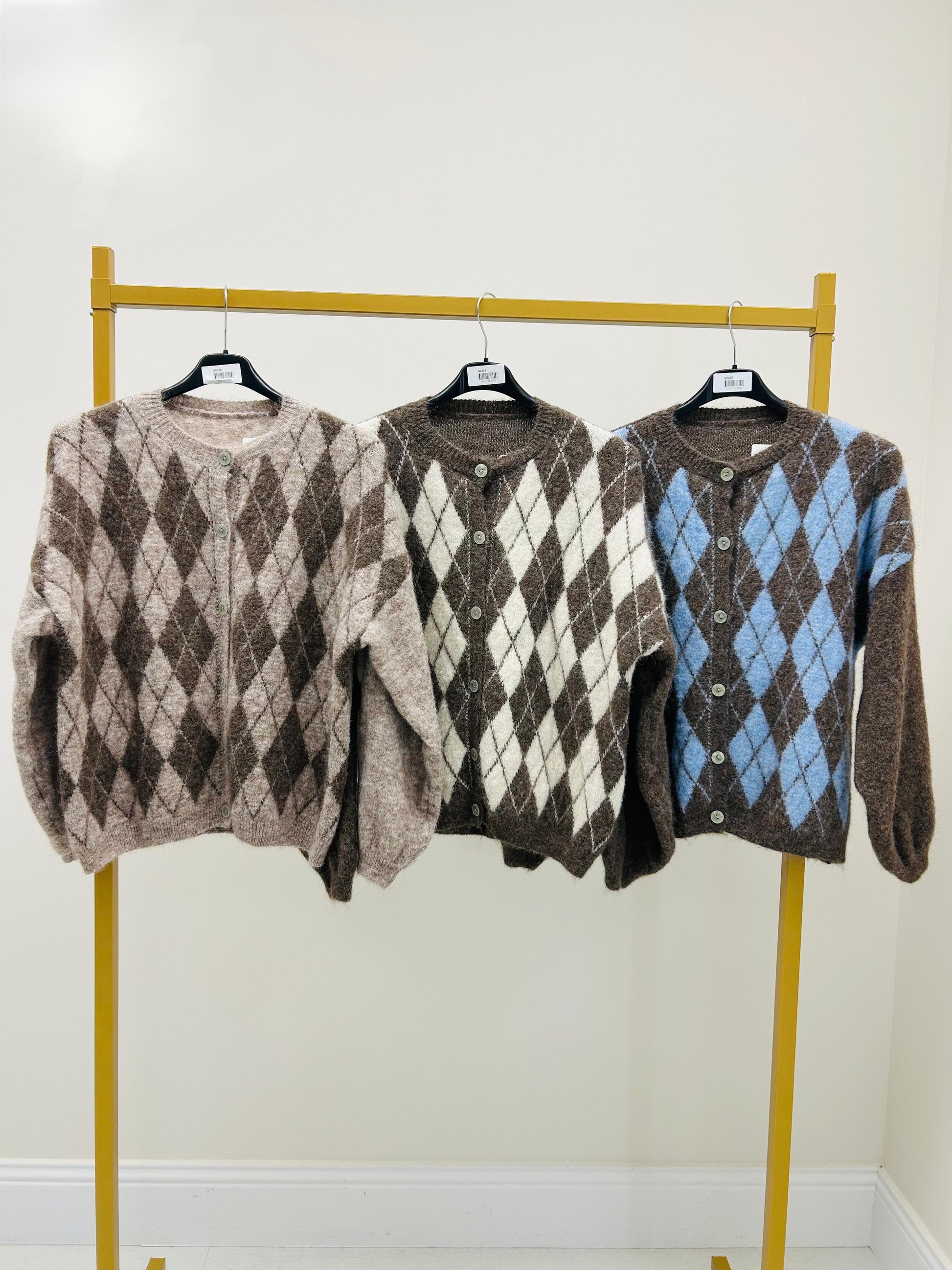 Envolva-se em conforto com este casaco em padrão argyle, uma peça irresistivelmente macia e perfeita para elevar qualquer look de outono/inverno.