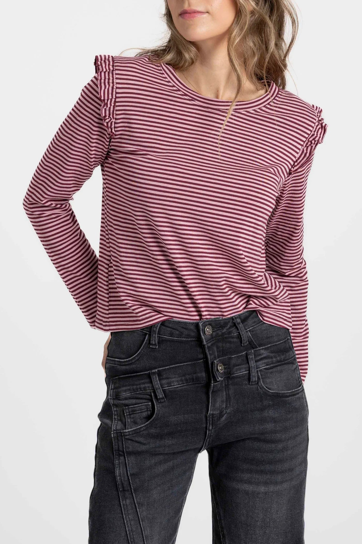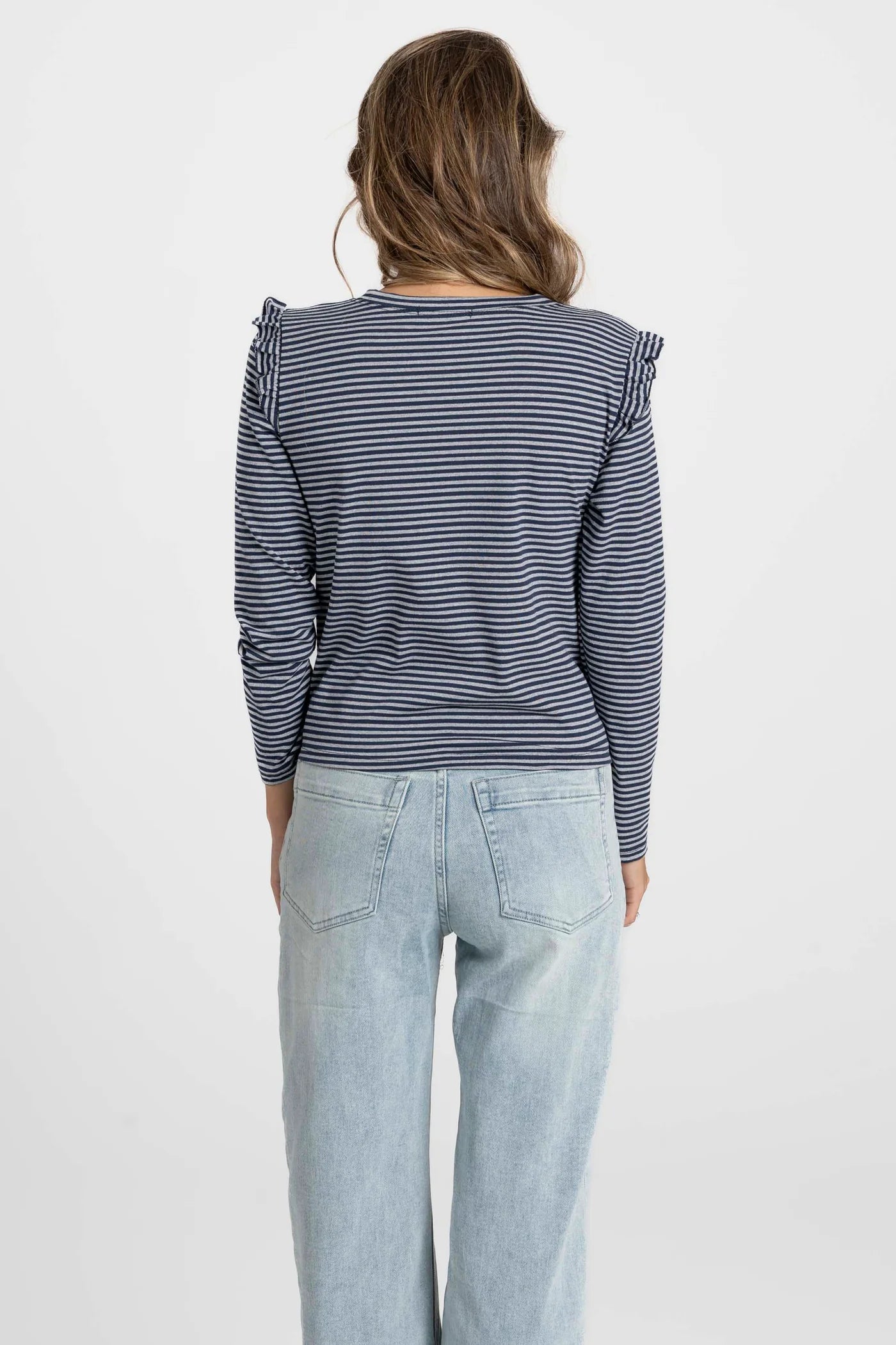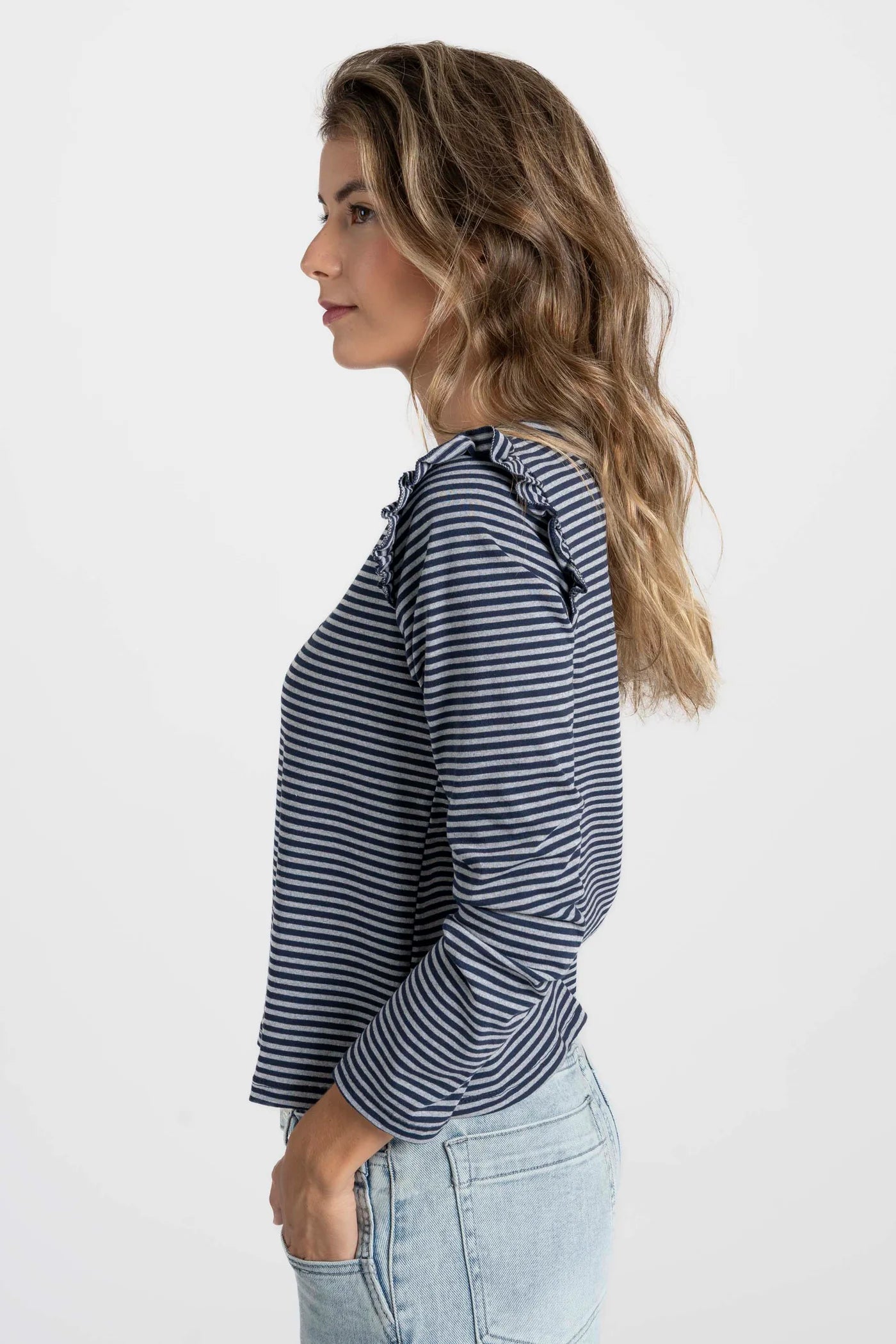 Delicada e feminina, esta camisola às riscas é a escolha ideal para um look casual com um toque de charme. Confeccionada em malha suave de mistura de algodão, oferece conforto, elasticidade e um caimento leve. O detalhe de folhos nos ombros acrescenta movimento e um ar romântico à peça.