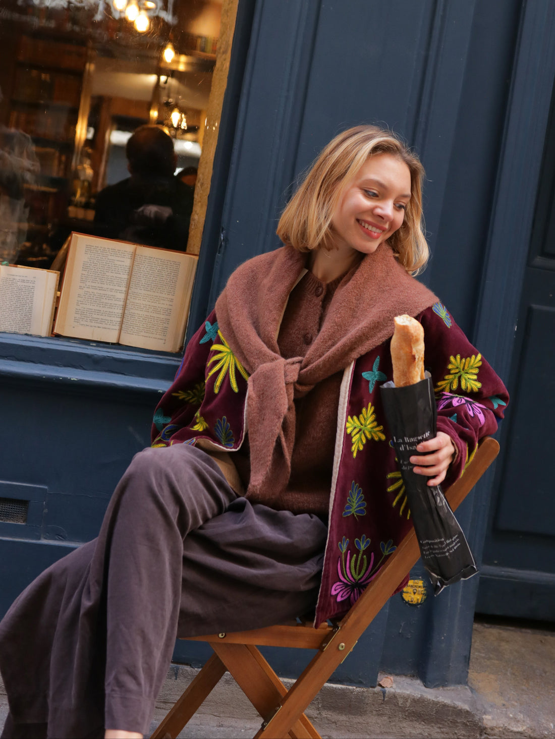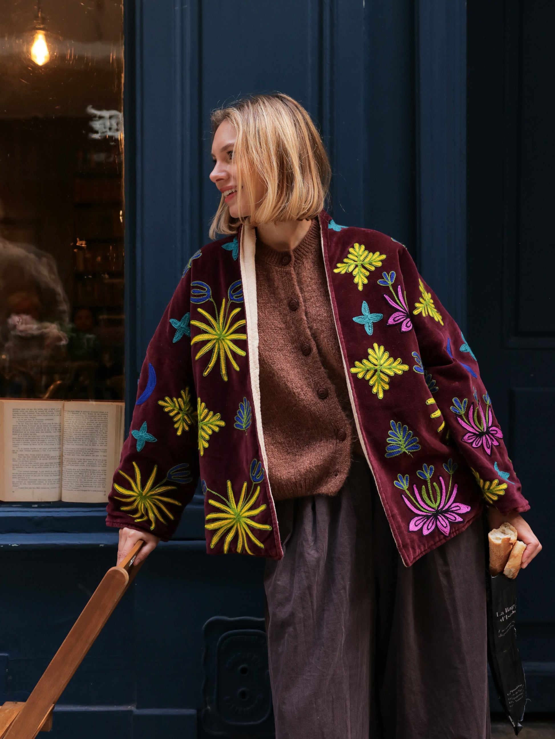 As cores vivas e os detalhes intrincados criam um contraste marcante com o fundo bordô, conferindo ao casaco um charme boêmio e artístico.