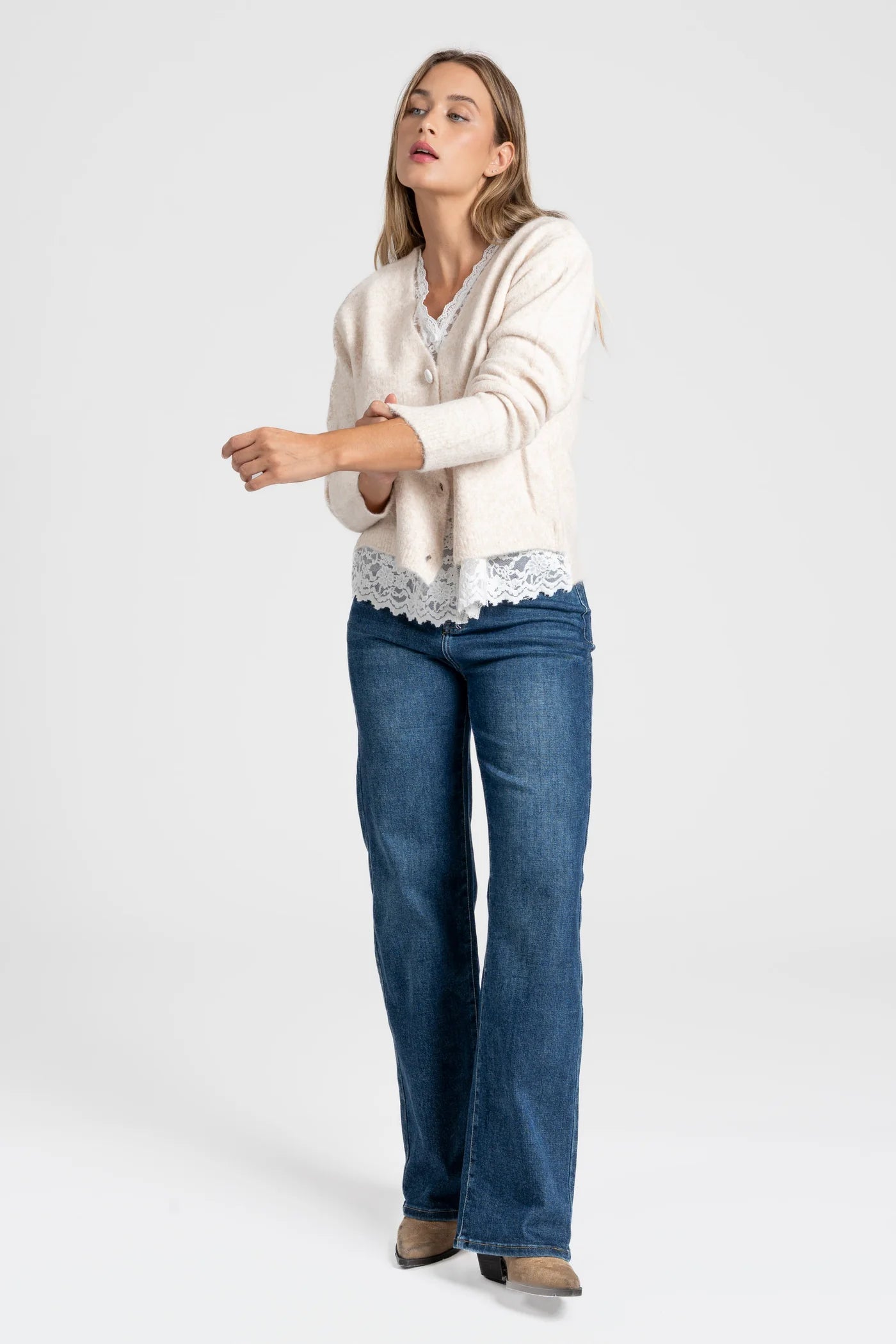 Cardigan de punto suave com design feminino e delicado. Apresenta decote em V com efeito duplo. Fecho frontal com botões forrados.