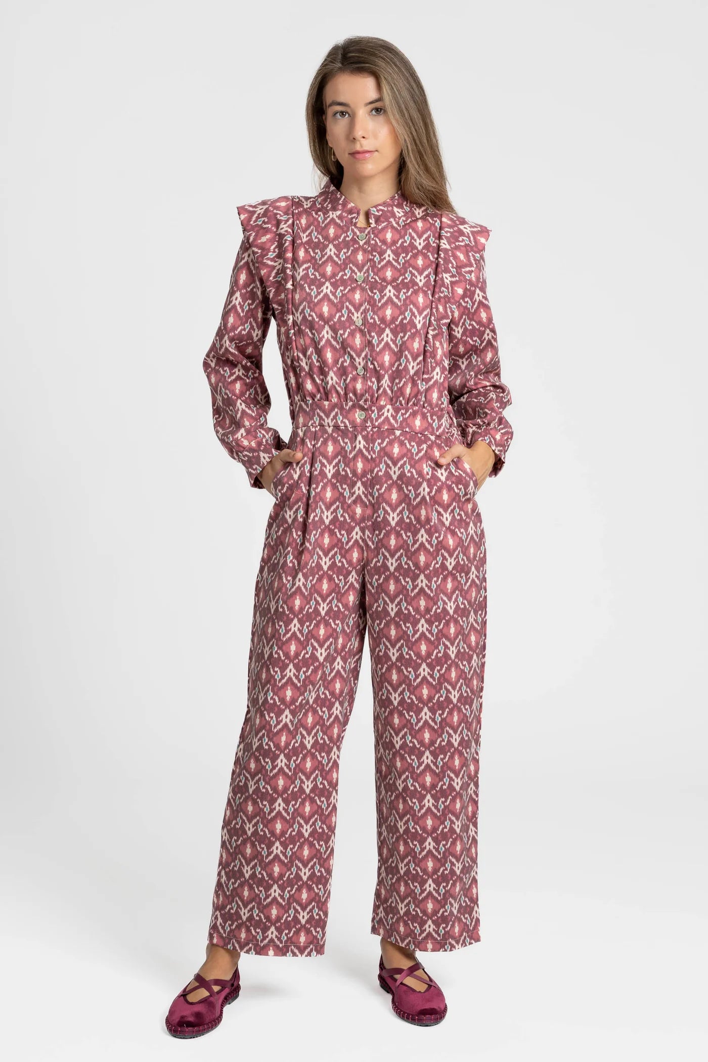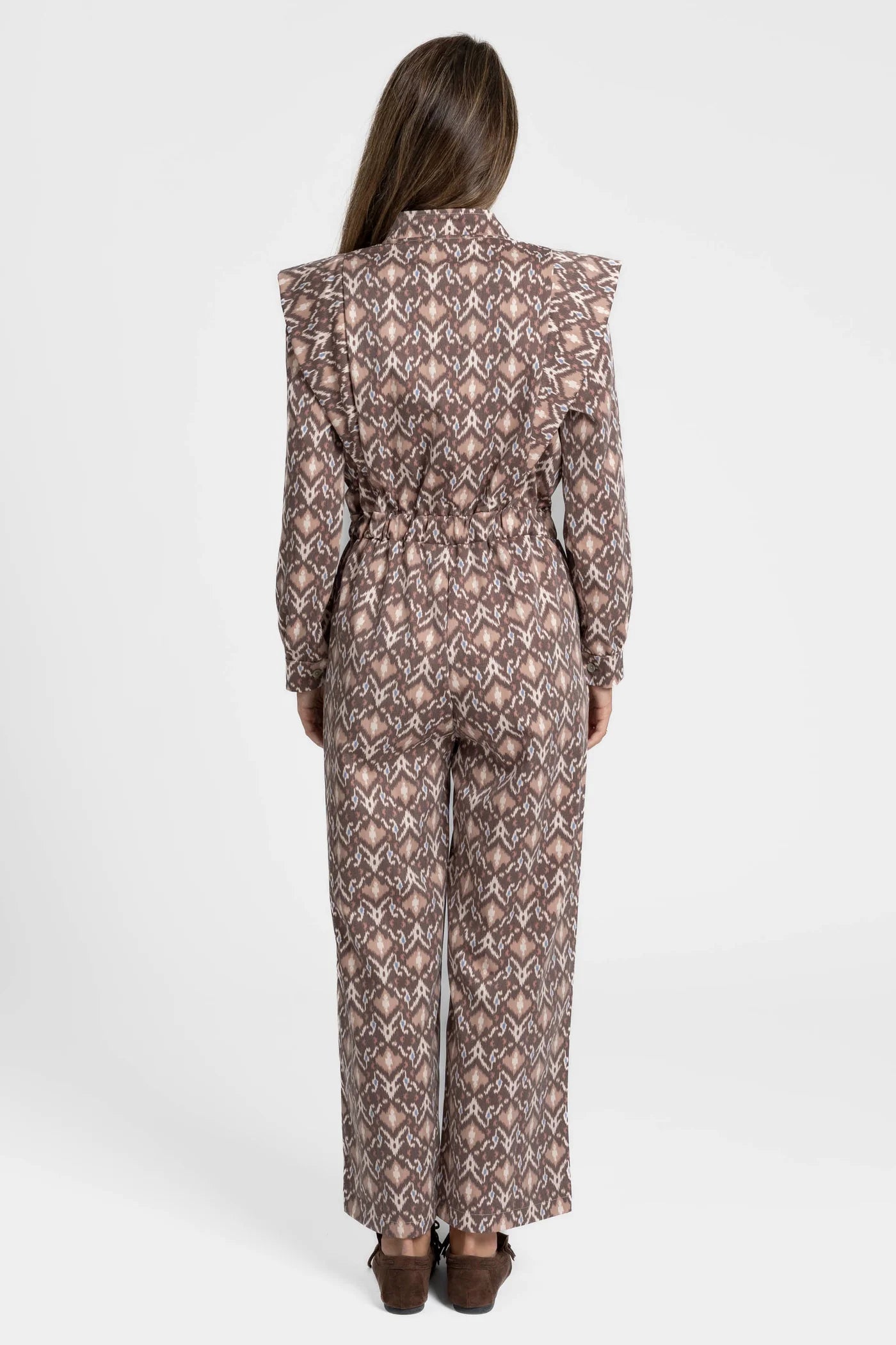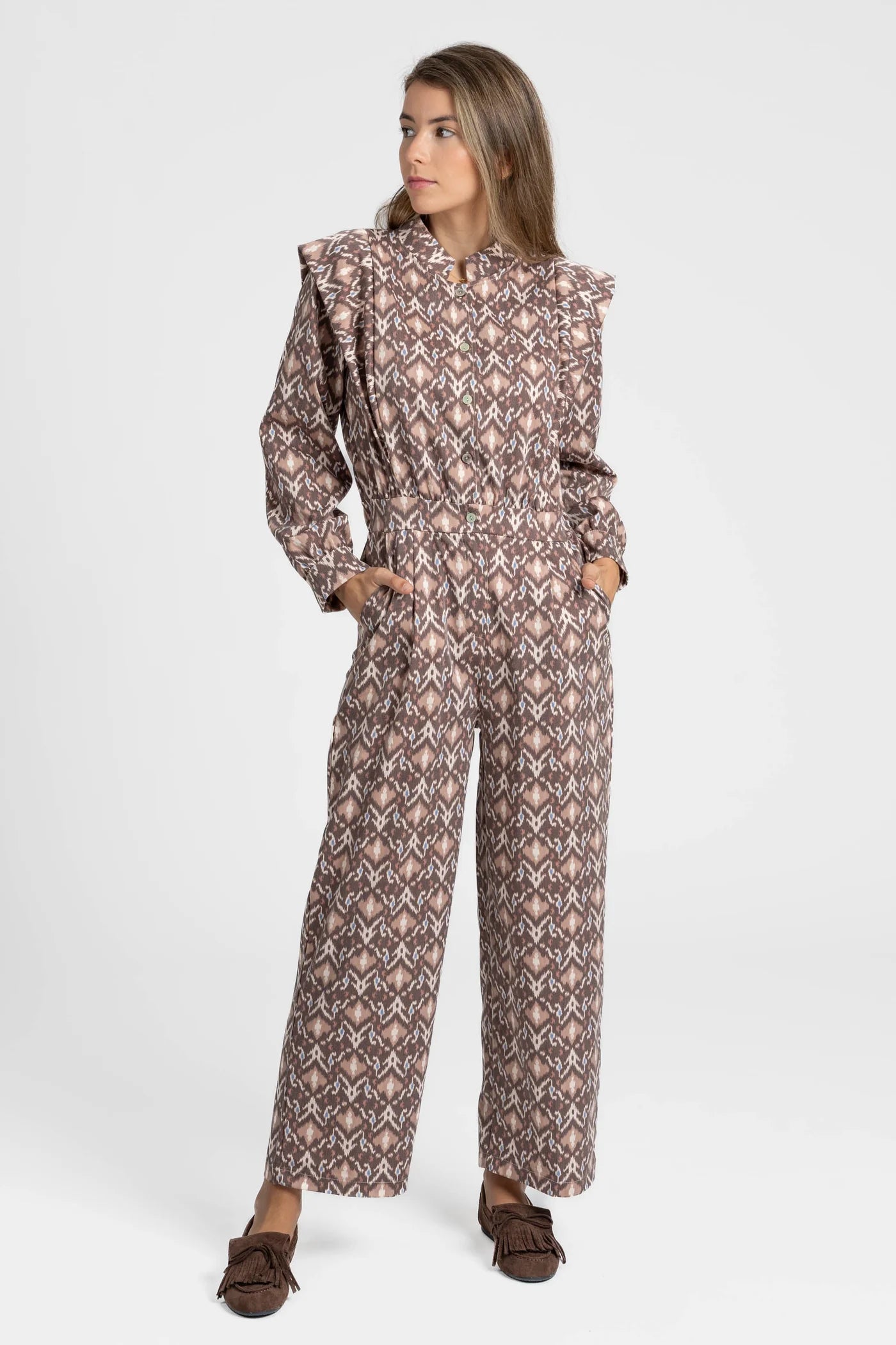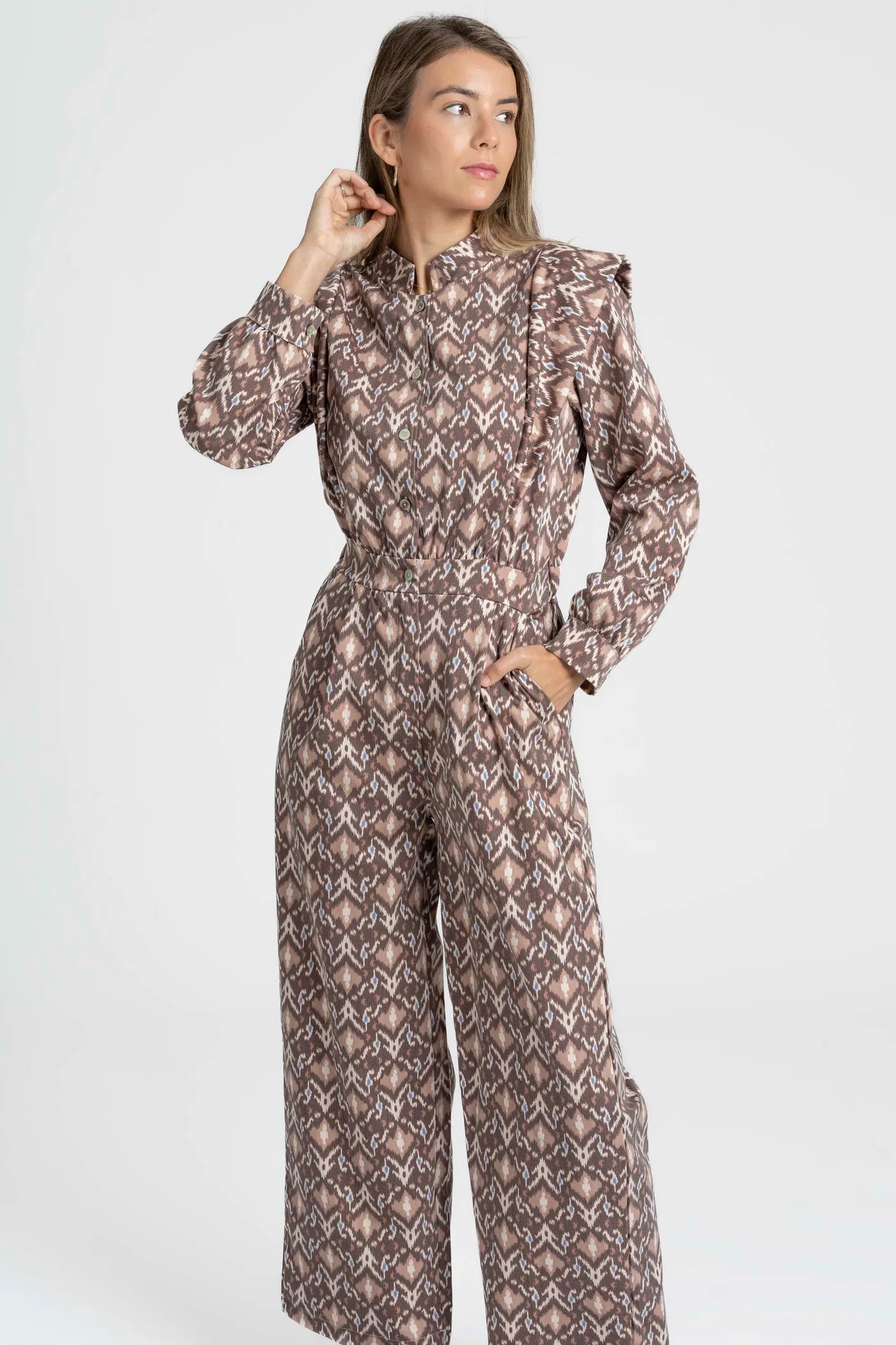 Este macacão destaca-se pelo seu padrão gráfico elegante e moderno, que combina tons quentes com um desenho de inspiração étnica. Confortável e cheio de personalidade, é a escolha ideal para quem procura um look distinto e versátil, perfeito para o dia a dia ou ocasiões especiais.