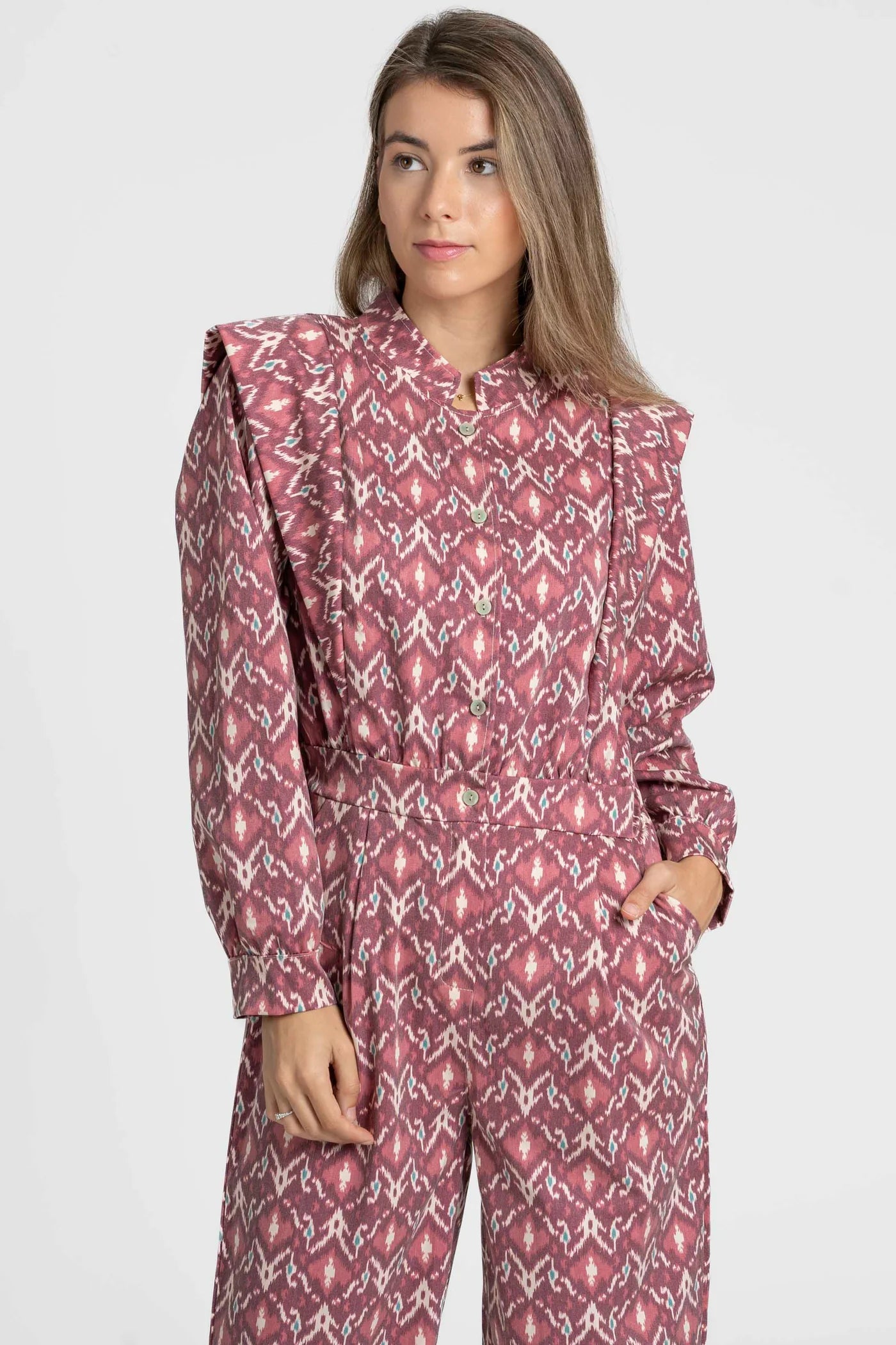 O corte estruturado com ombros marcados acrescenta um toque contemporâneo, equilibrado pelo colarinho redondo e pelo fecho frontal com botões, que reforçam a linha clássica da peça. A cintura elástica com fecho de correr lateral garante conforto e uma silhueta bem definida, enquanto as pernas direitas conferem movimento e leveza.