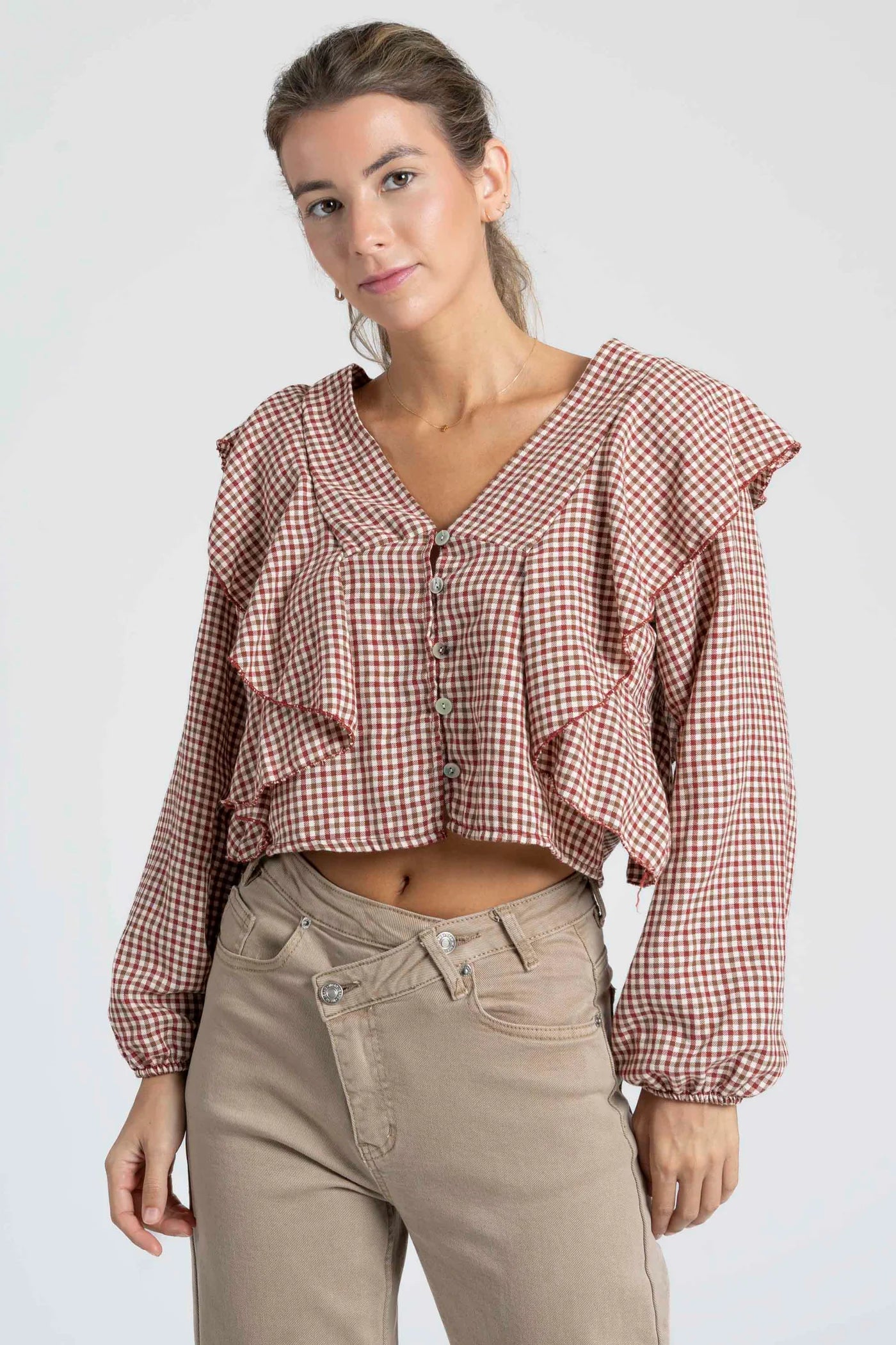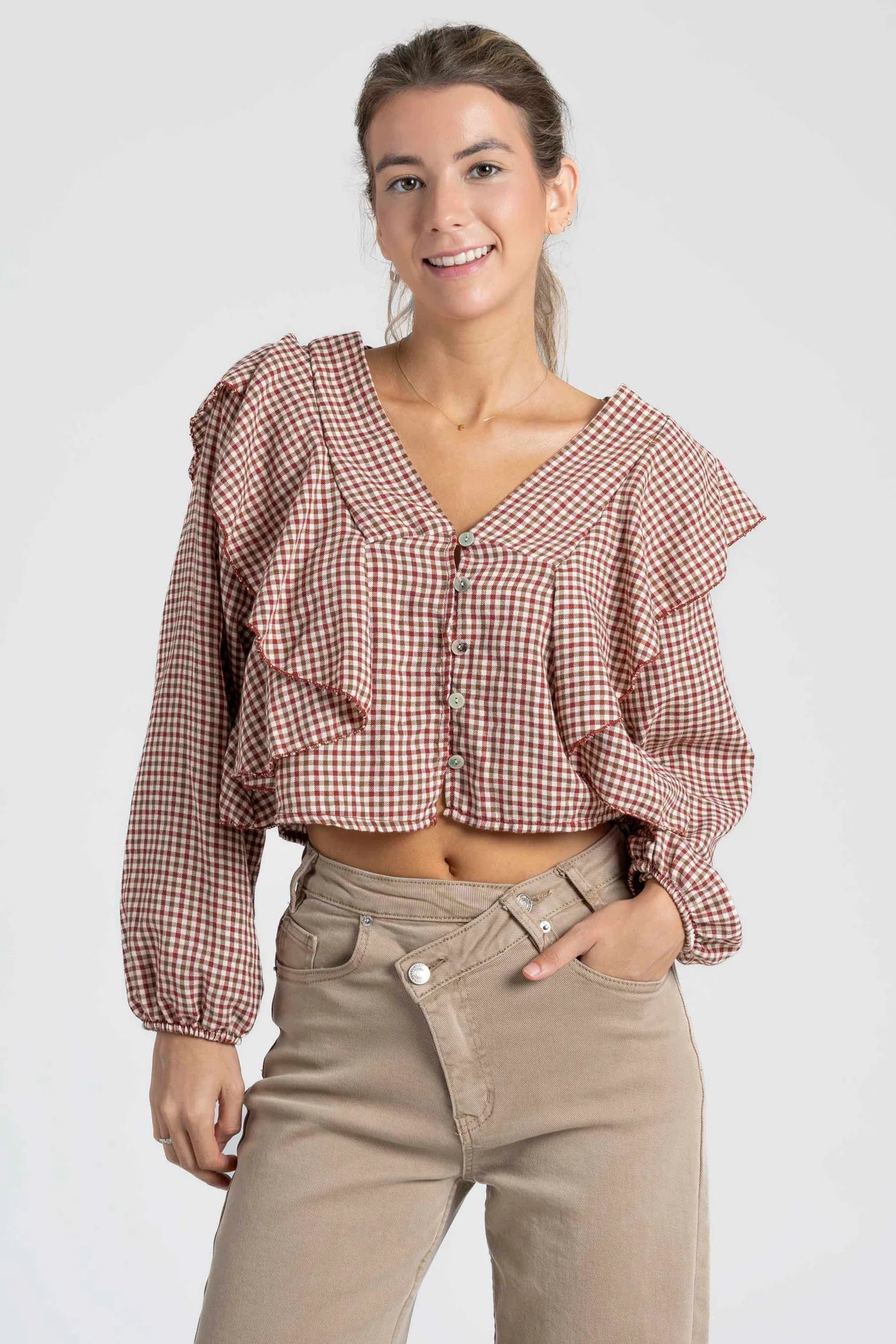 Dê um toque romântico e moderno ao seu look com esta blusa aos quadrados. Com um design leve e feminino, destaca-se pelos volantes elegantes na parte frontal e nos ombros, que adicionam movimento e estilo.