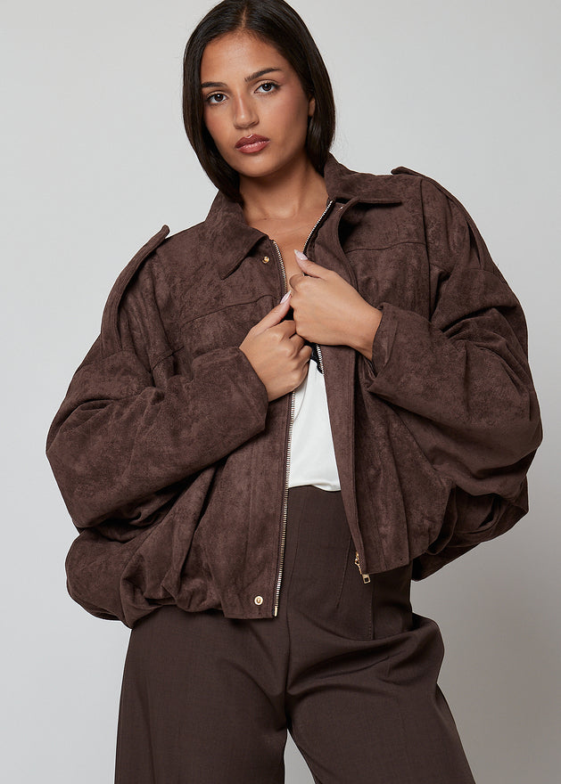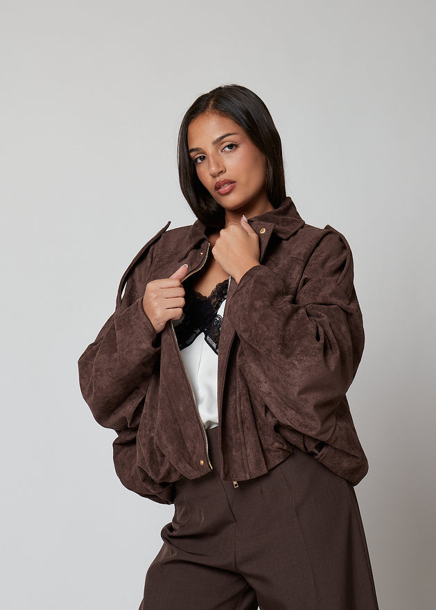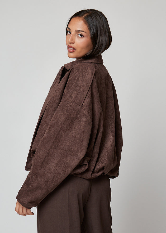 Elegante e versátil, este casaco em camurça sintética é a escolha perfeita para os dias mais frios. Com um corte oversize moderno e confortável, destaca-se pela sua gola clássica, fecho frontal em zip metálico e detalhes estruturados nos ombros, que conferem um toque sofisticado e contemporâneo ao look.