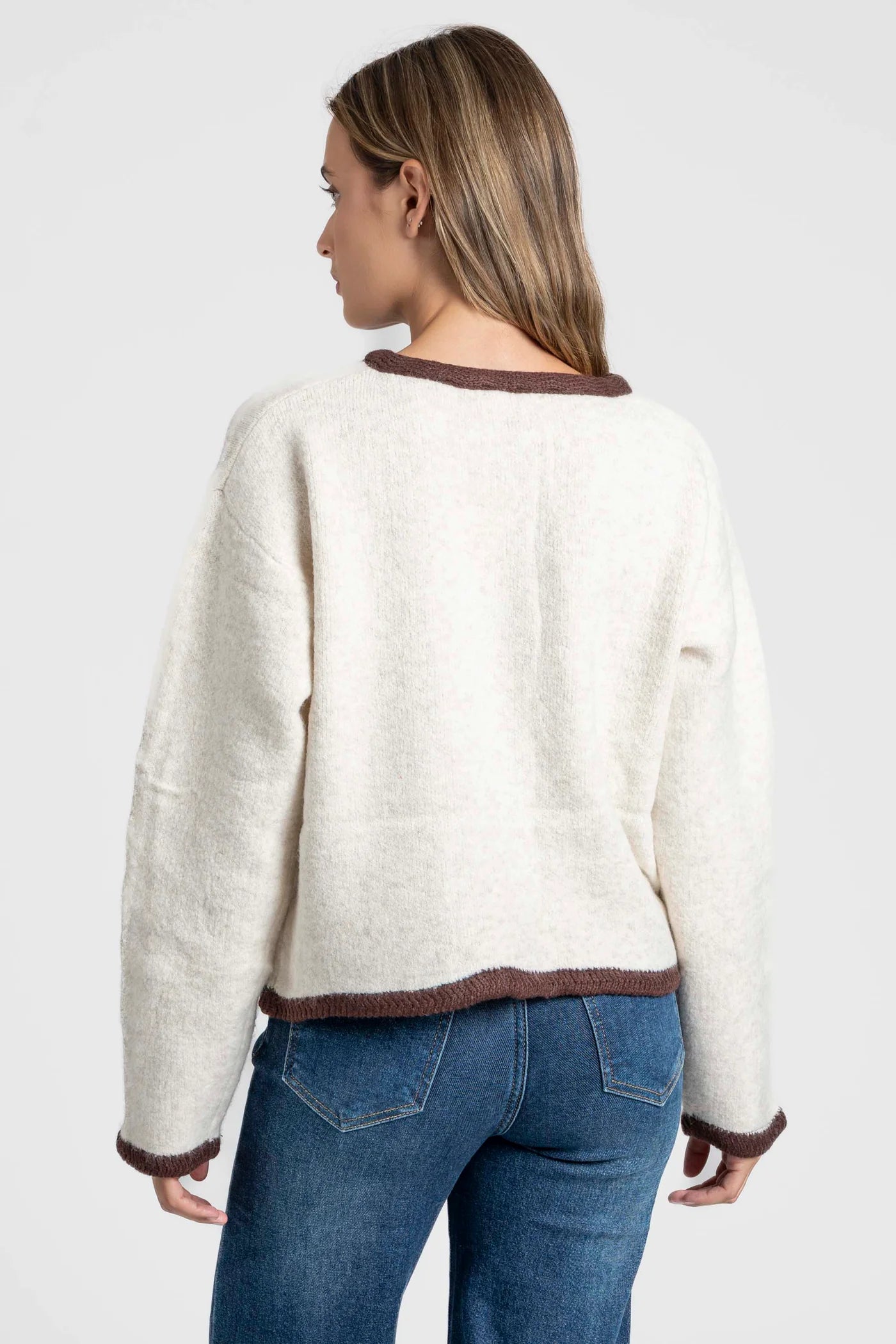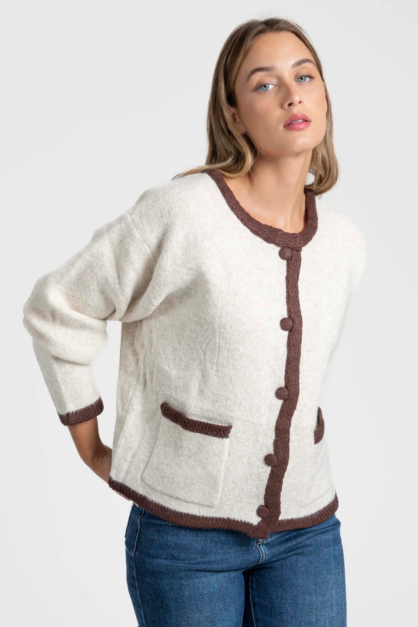 Casaco em malha macia com gola redonda e manga comprida. Apresenta bolsos frontais práticos e vivos em contraste que acrescentam um toque elegante e moderno. O fecho frontal com botões a contraste reforça o estilo clássico com um detalhe contemporâneo.