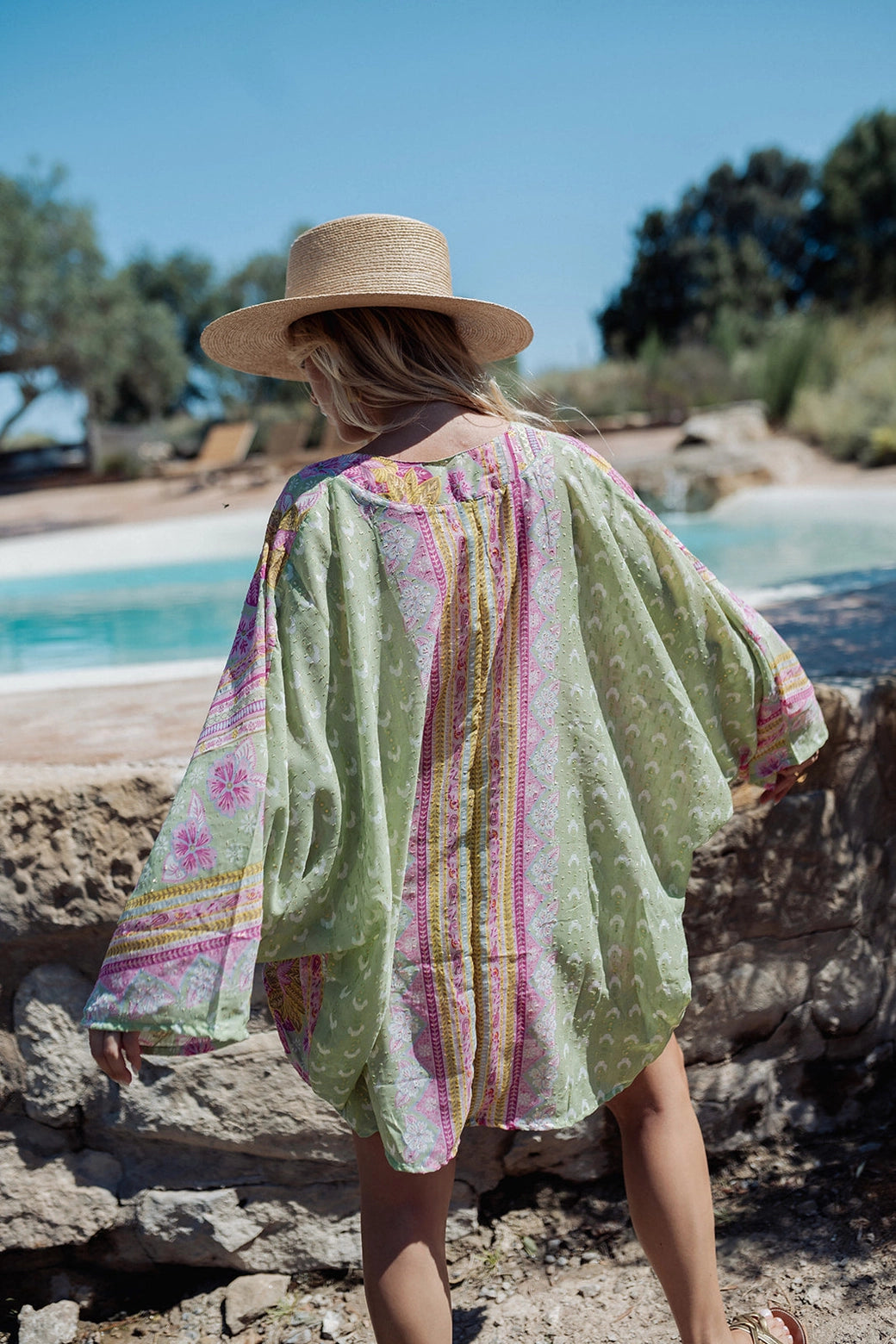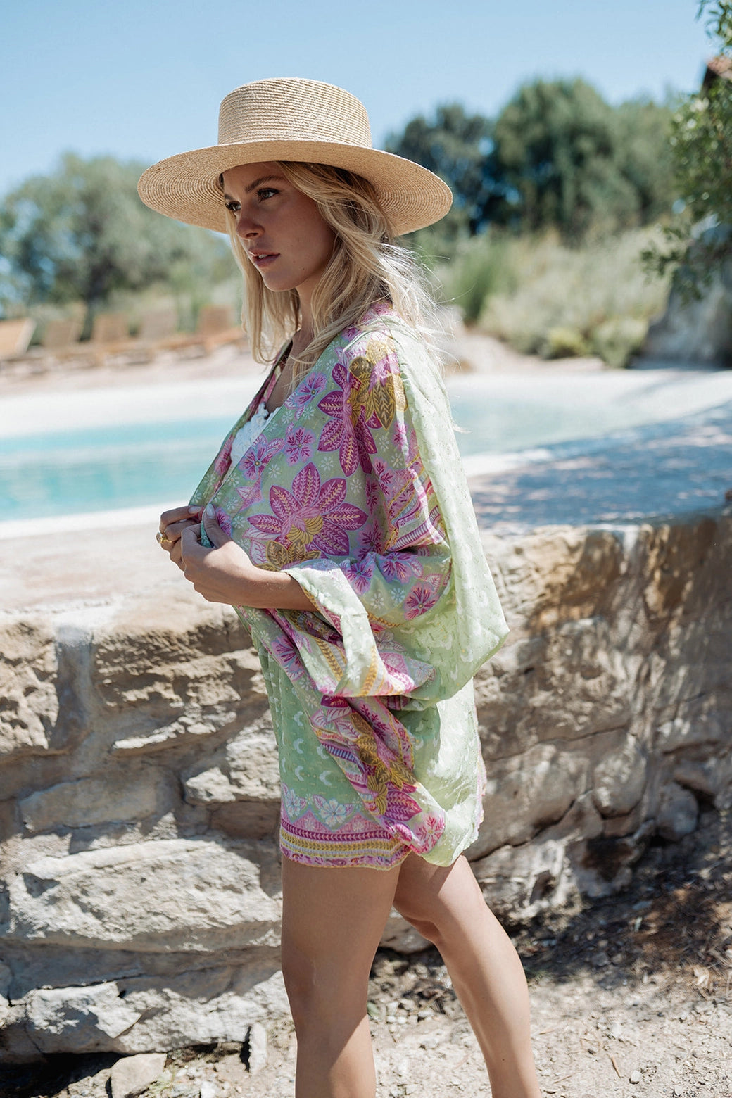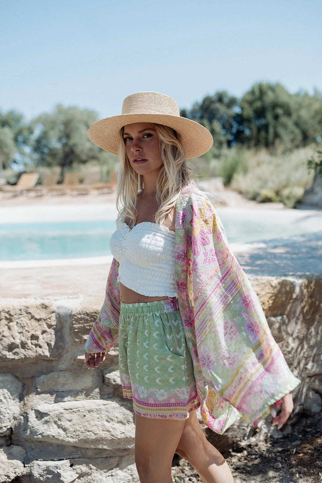 Uma proposta luminosa e versátil, ideal para usar em conjunto ou separar — combine o quimono com swimwear ou denim, ou os calções com um top simples para um look effortless de verão.