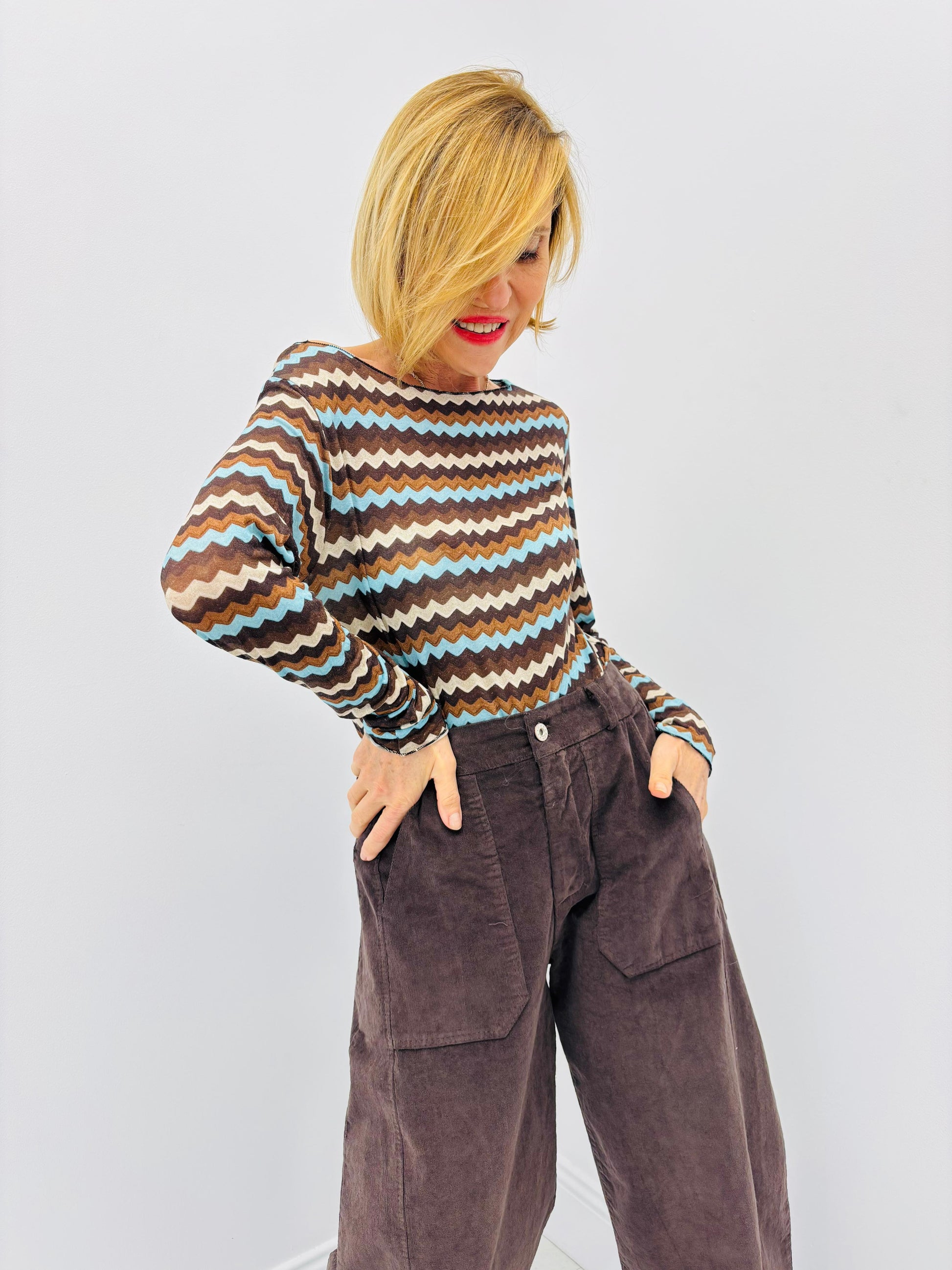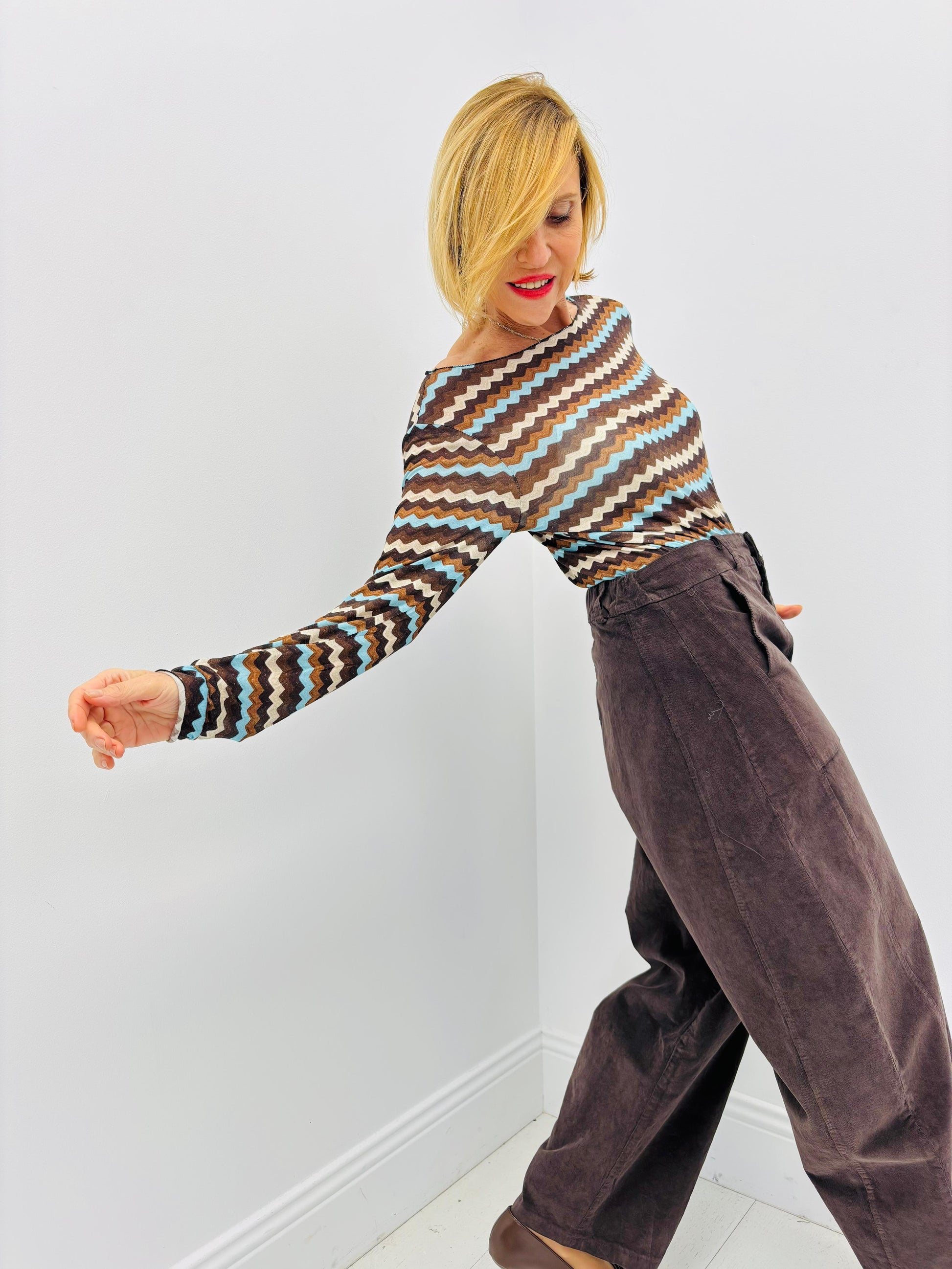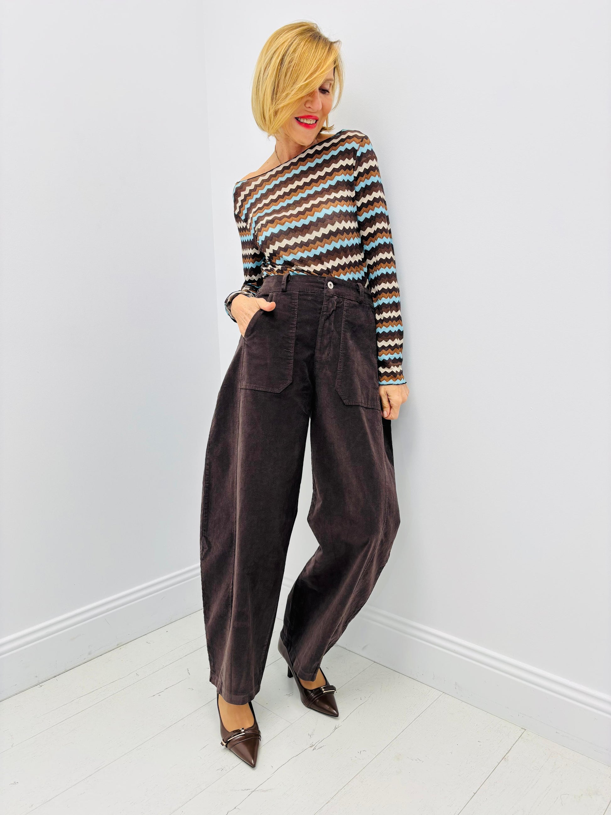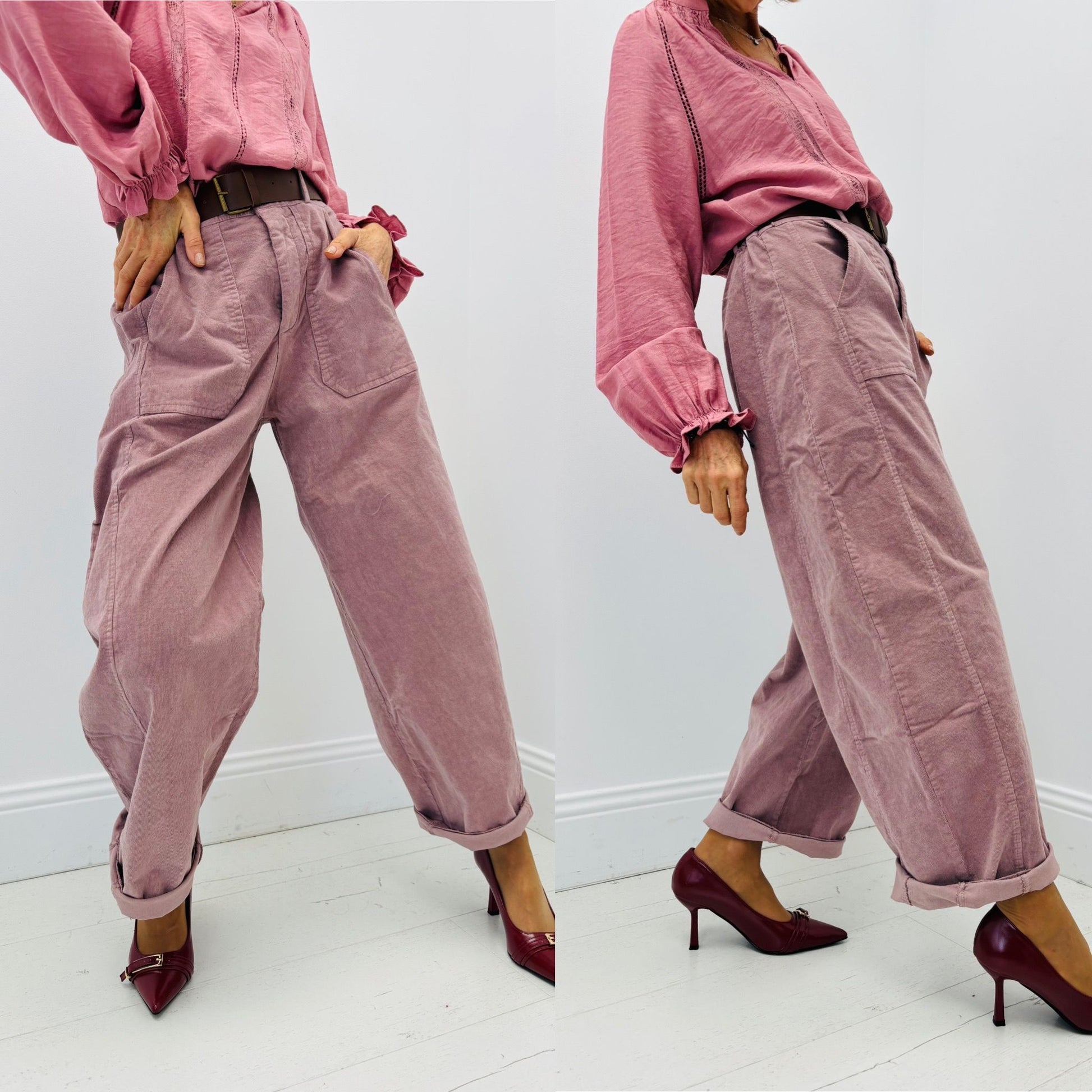 Com um corte balloon descontraído e contemporâneo, estas calças em bombazina envolvem o corpo com suavidade, criando uma silhueta fluida e cheia de carácter.