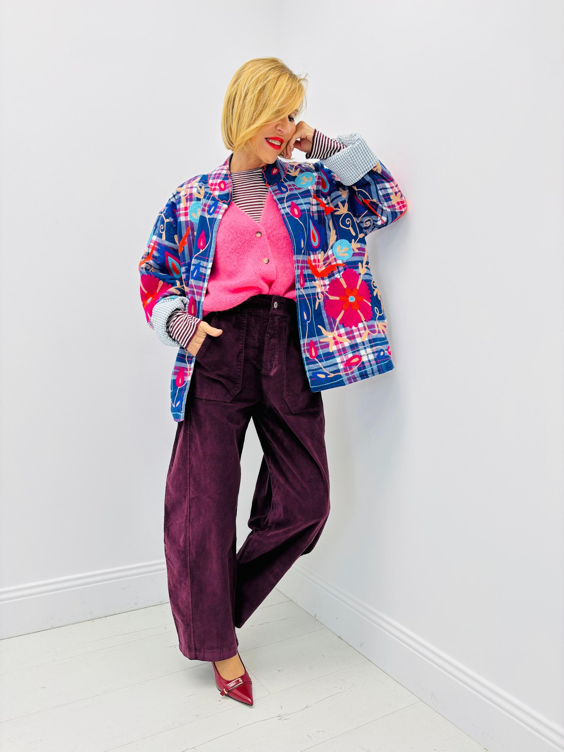 O tecido de bombazina acrescenta textura e profundidade ao look, enquanto o design de cintura subida e perna ampla oferece liberdade de movimento e um encaixe naturalmente favorecedor. O tamanho único adapta-se com facilidade a diferentes corpos, mantendo sempre uma presença forte e elegante.
