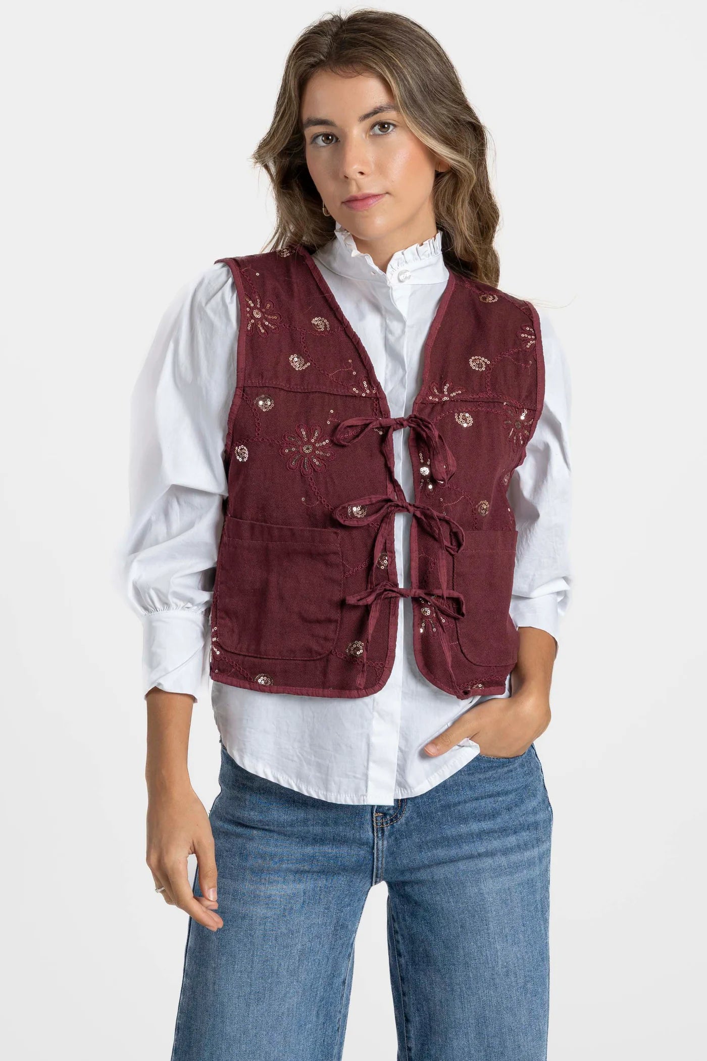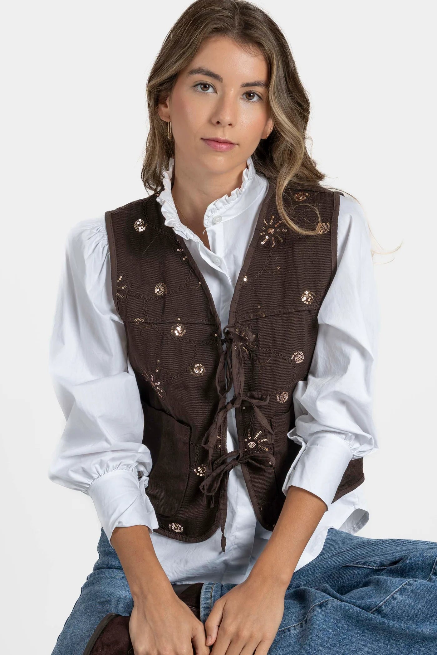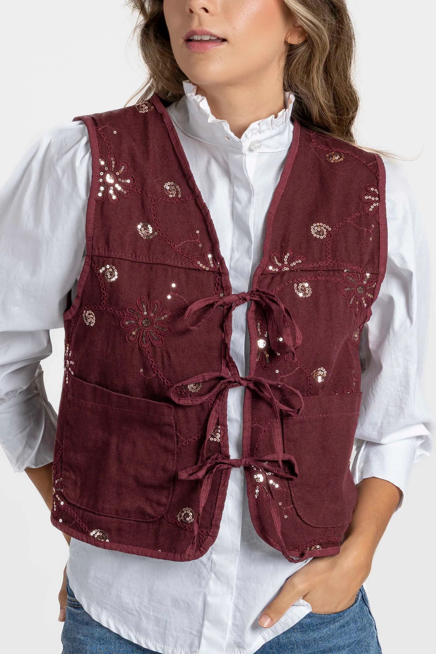 O modelo apresenta um fecho frontal com laços, que permite ajustar o colete ao corpo de forma delicada e feminina, e bolsos frontais funcionais, que combinam praticidade com um toque descontraído. O detalhe de bordados com lantejoulas em padrões florais confere-lhe um charme artesanal e sofisticado, tornando-o numa peça especial e cheia de personalidade.