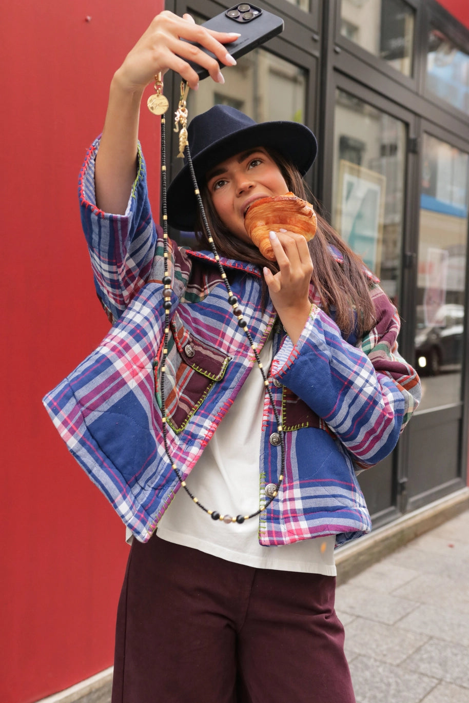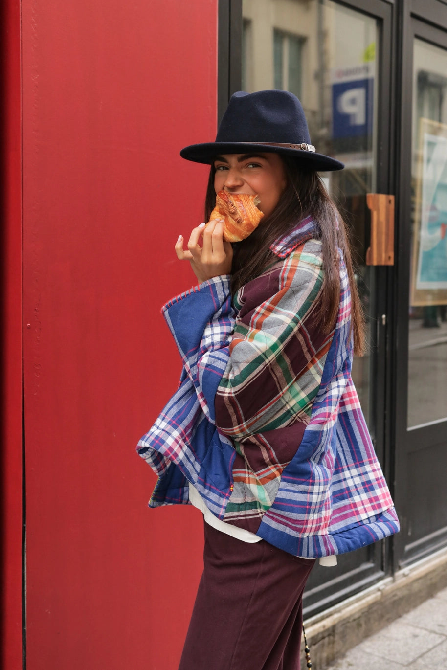 O padrão de xadrez em tons contrastantes confere-lhe um carácter marcante e contemporâneo, mantendo uma estética descontraída e versátil.
