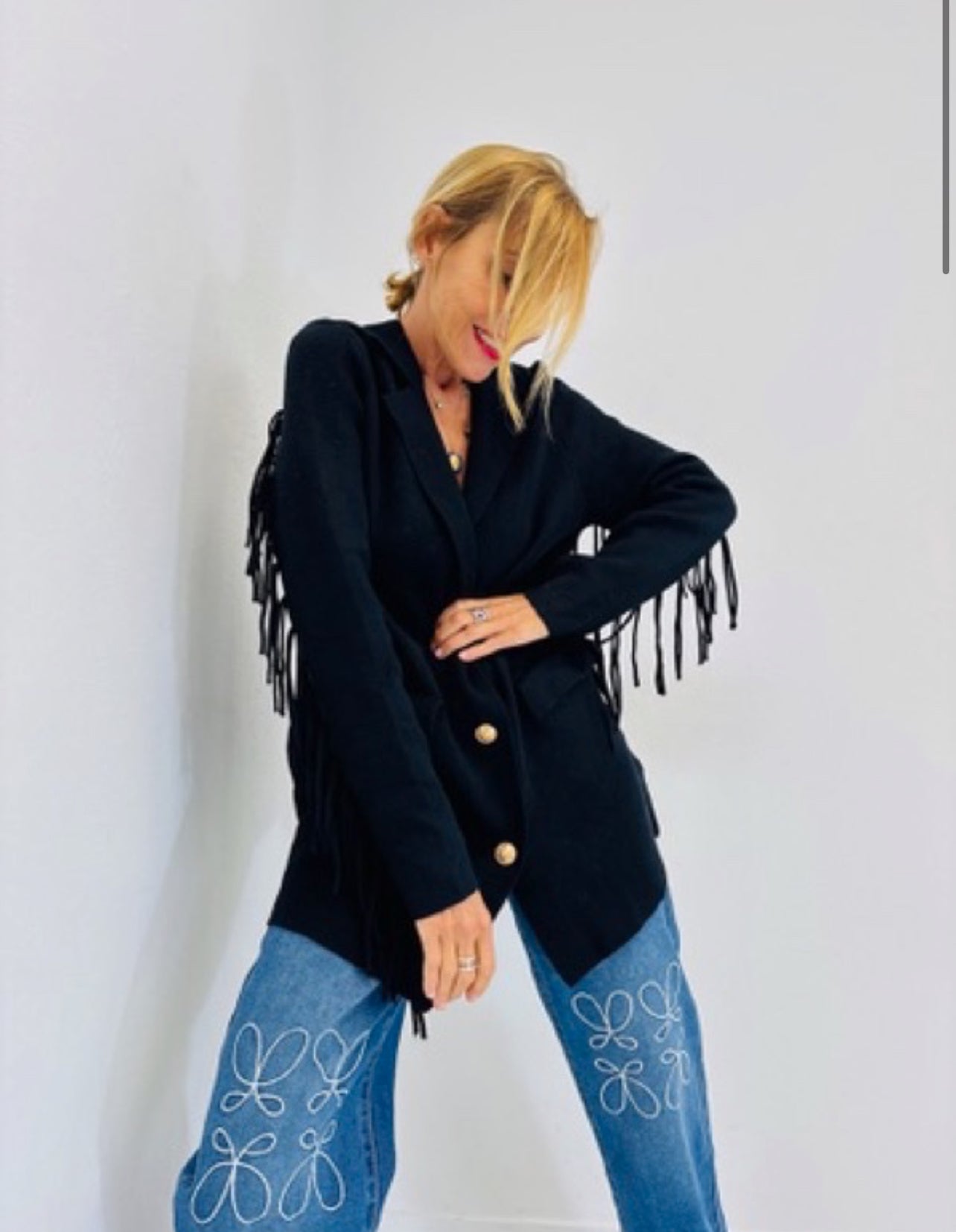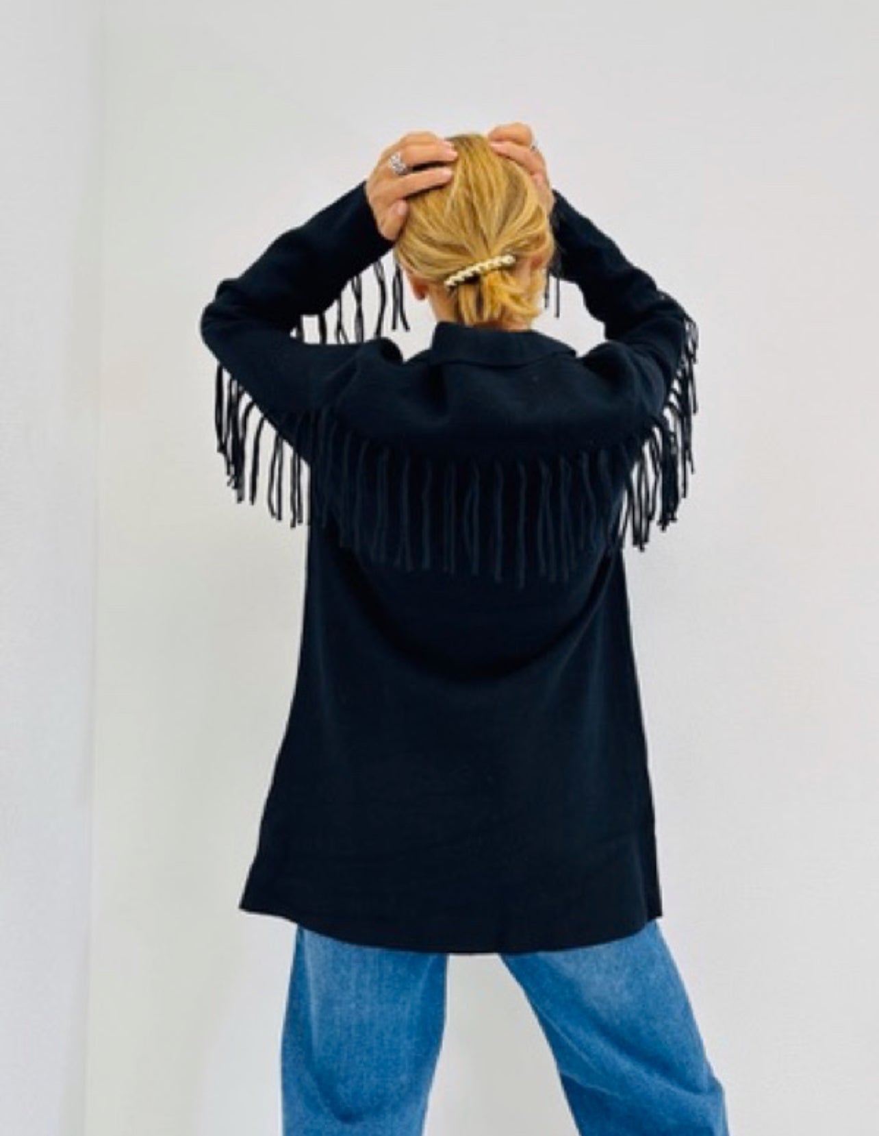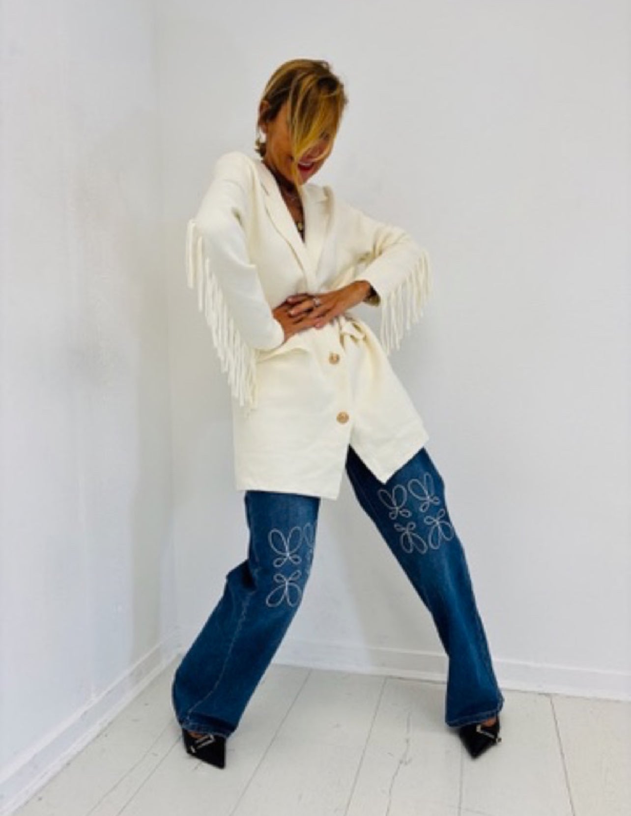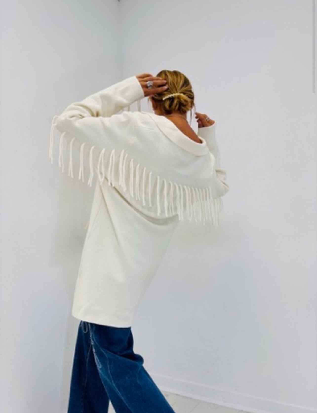 Chic e contemporânea, este blazer em malha comprido em tom marfim distingue-se pelas suas franjas decorativas nas costas e nas mangas, que acrescentam movimento e um toque western subtil e moderno.