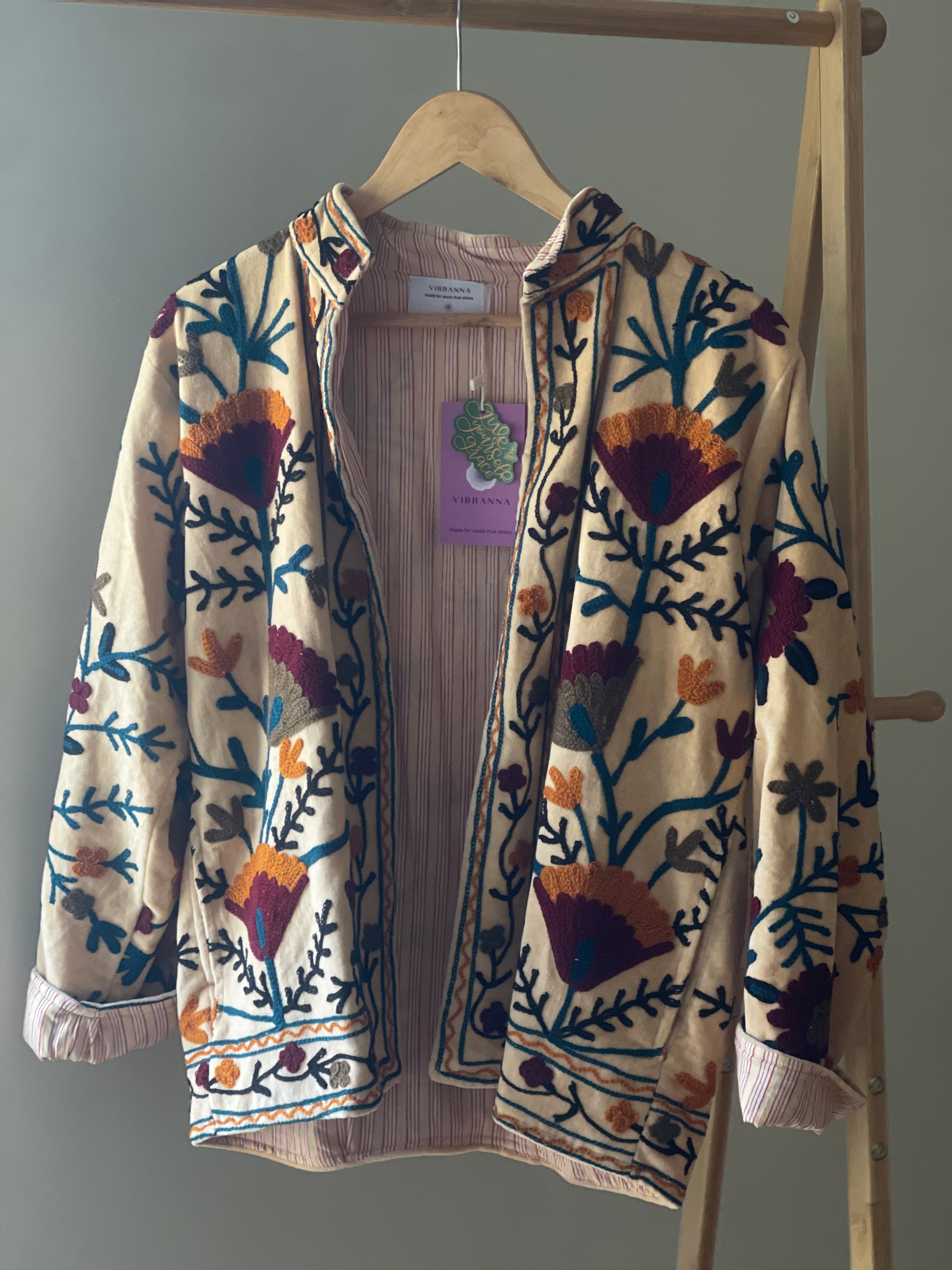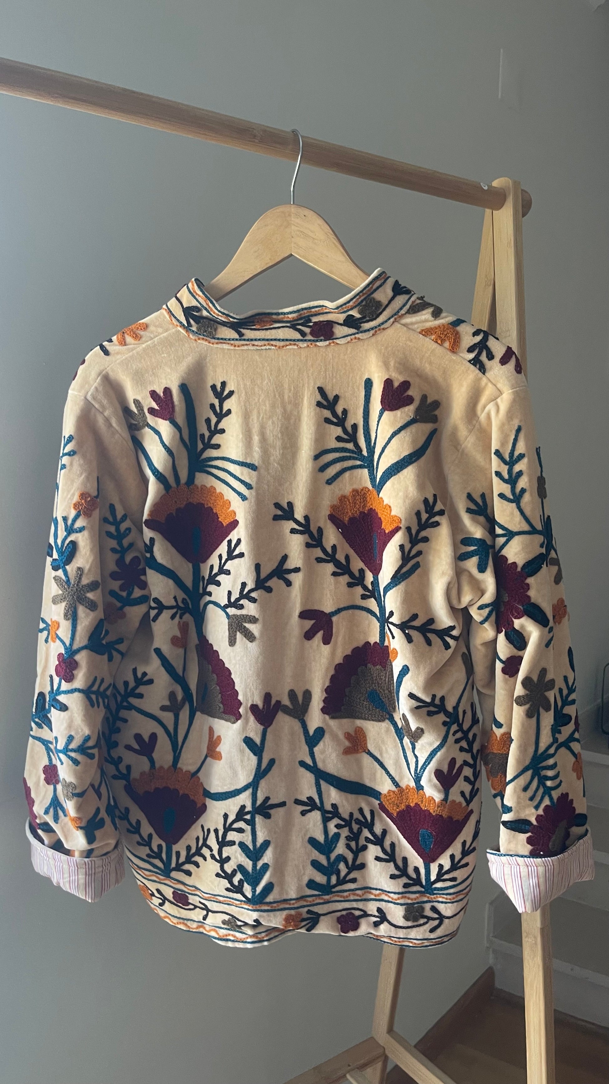 O Golden Meadow Embroidered Jacket é aquele casaco que transforma qualquer look num momento especial. Com base em tom creme e bordados florais multicoloridos cheios de personalidade, é perfeito para quem ama peças únicas, com alma e história.