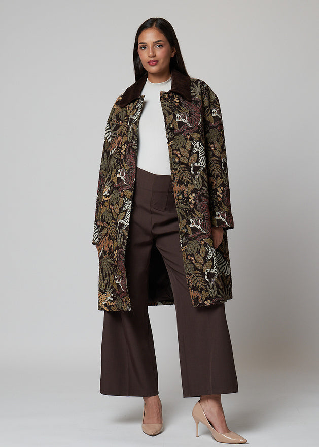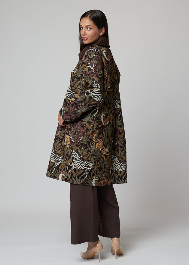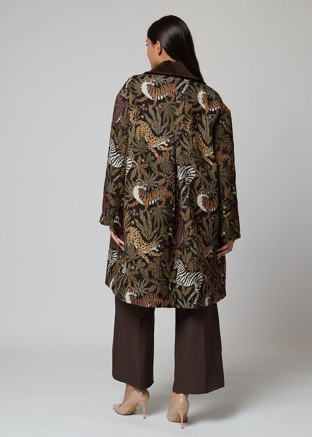 O casaco JUNGLE é uma peça statement que combina sofisticação, conforto e um toque de ousadia. Confecionado em tecido encorpado de alta qualidade, apresenta um padrão jacquard inspirado na selva, com motivos de folhas tropicais e animais selvagens em tons terrosos — uma verdadeira celebração da natureza.