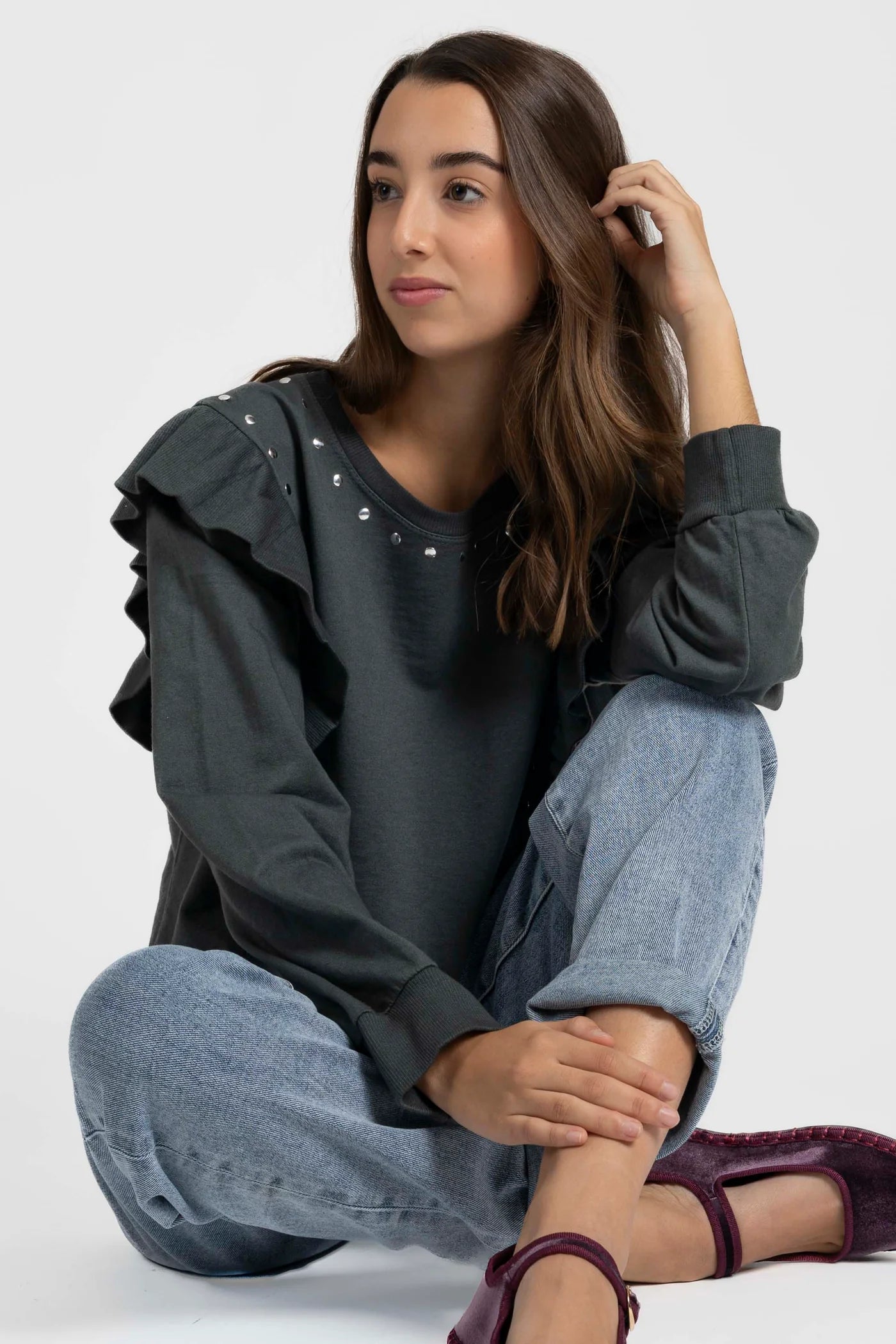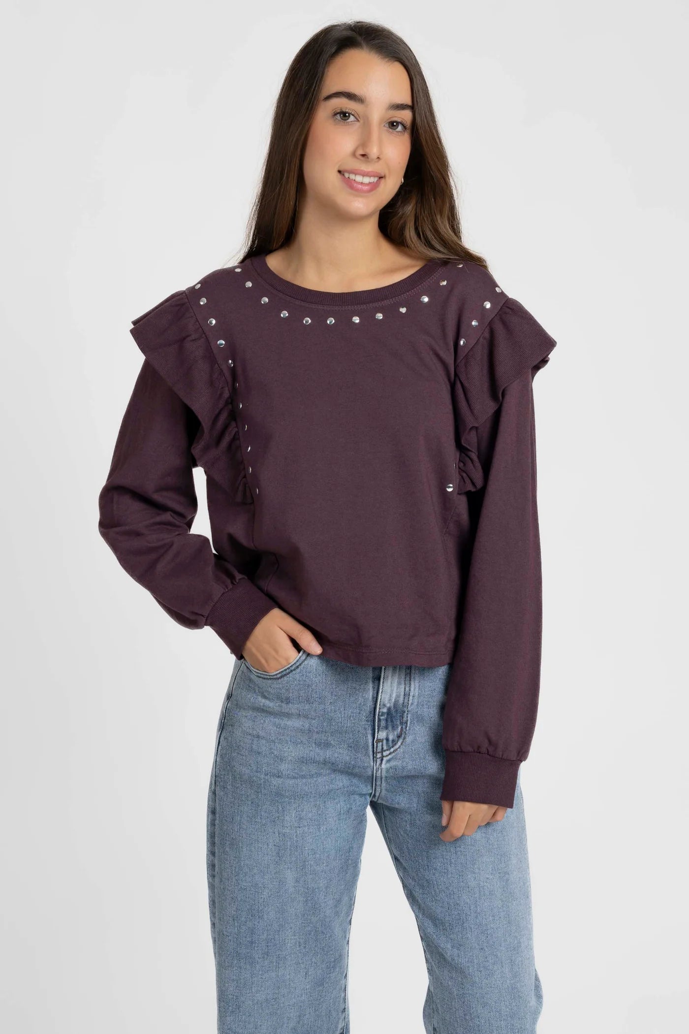 Sweatshirt em tecido suave de algodão, ideal para um look casual com um toque sofisticado. O seu design com gola redonda e mangas compridas é realçado por aplicações de tachas metálicas na parte frontal e nos ombros, que acrescentam brilho e modernidade.