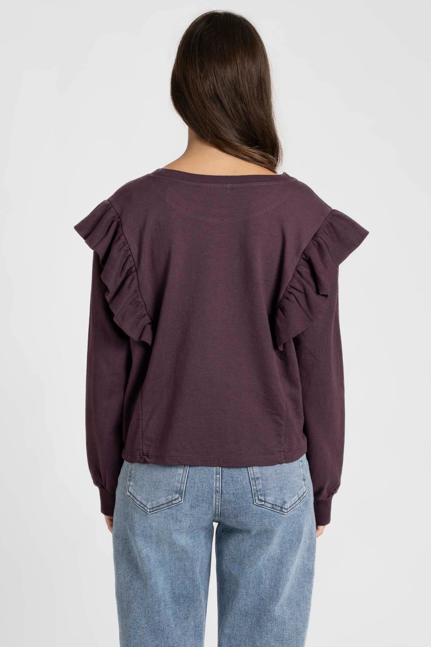 Os folhos laterais criam um movimento delicado e feminino, contrastando com o estilo descontraído da peça. Um modelo confortável, versátil e cheio de personalidade — perfeito para combinar com calças de ganga ou saias para um look effortless.
