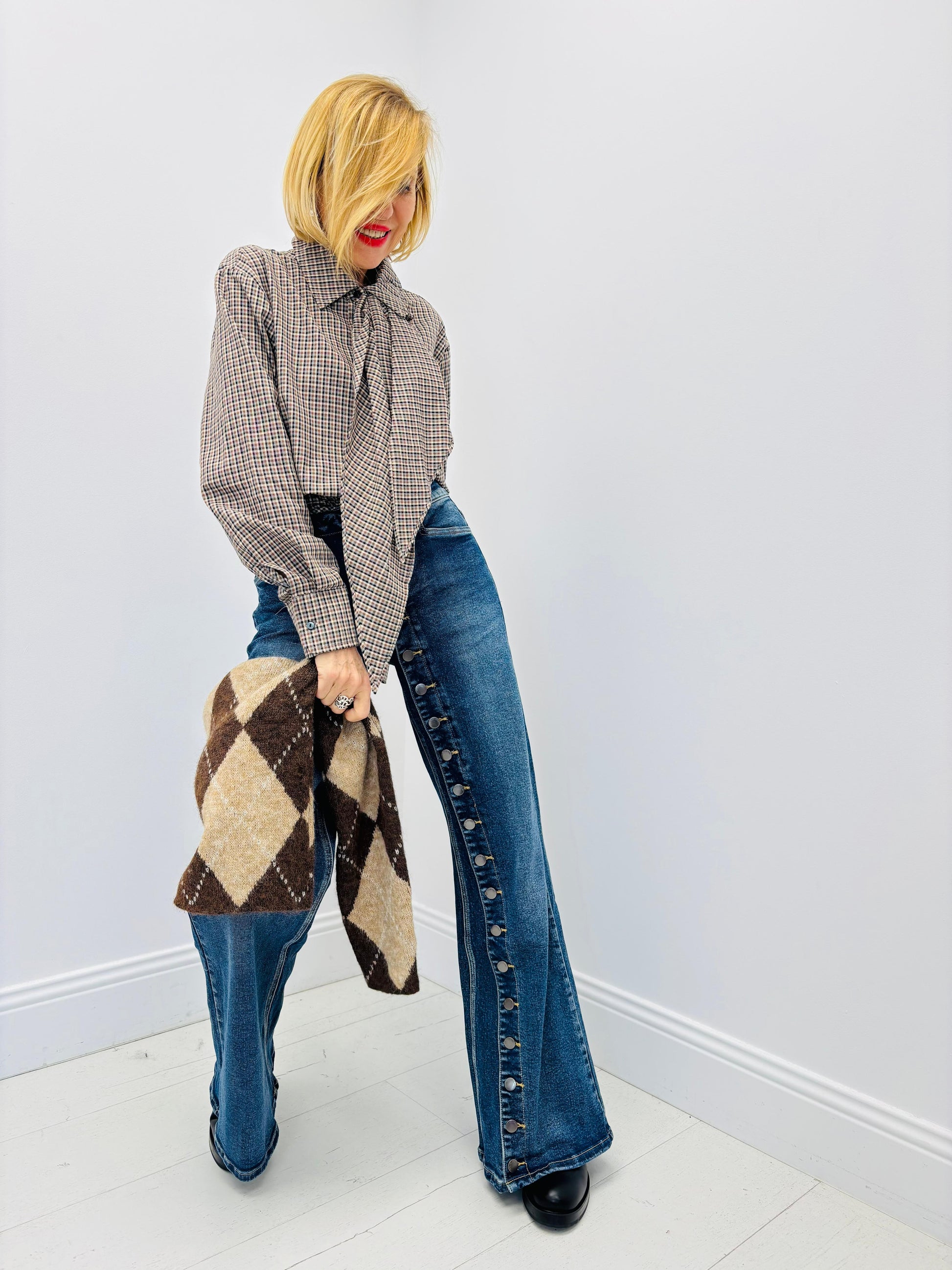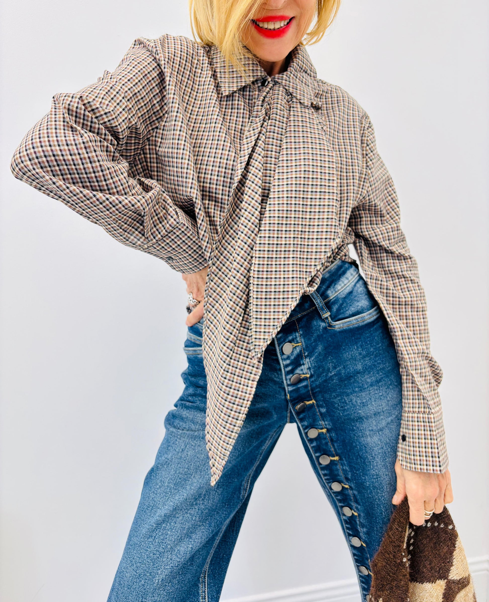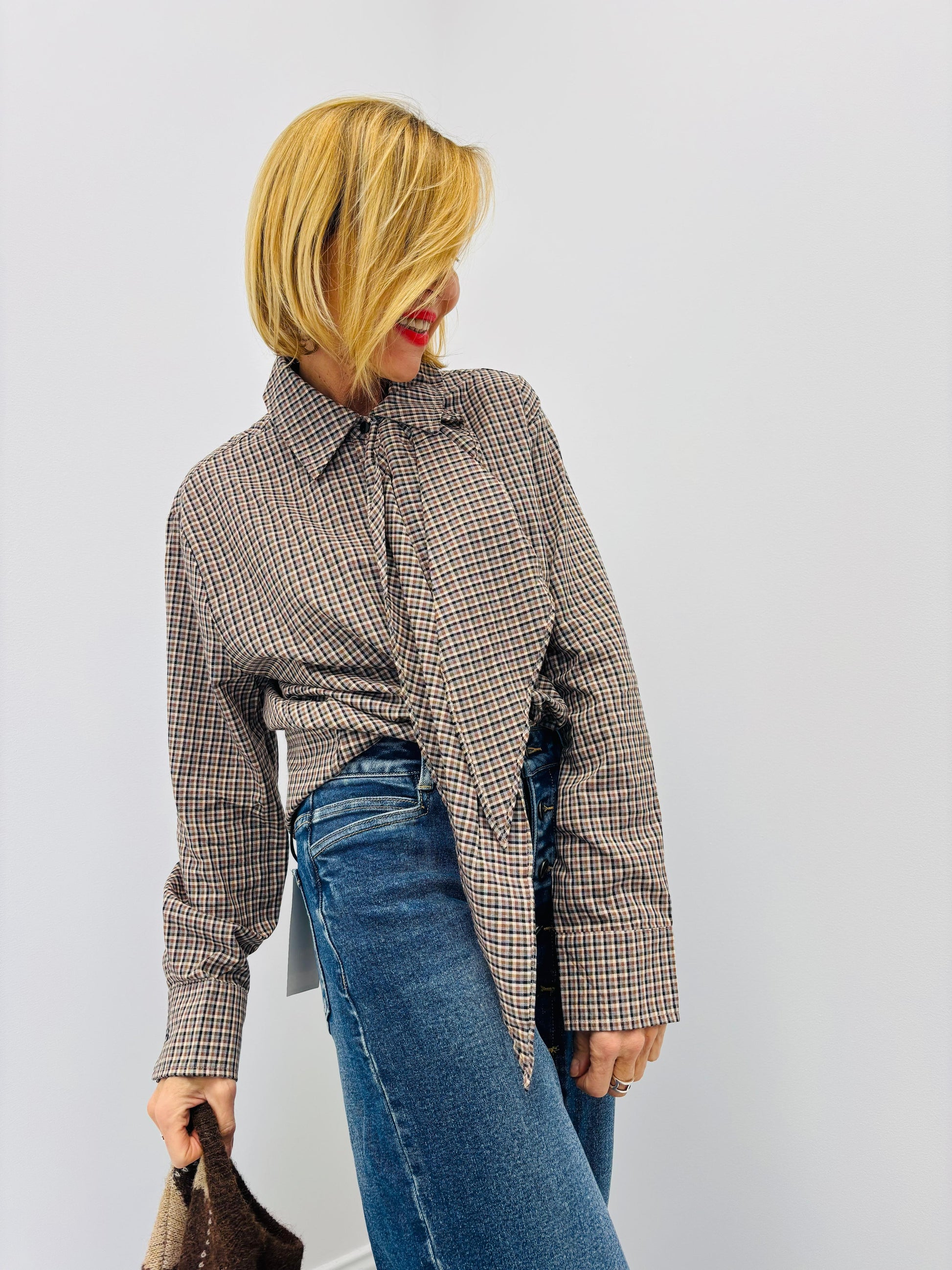 Camisa em 100% algodão, com padrão xadrez pequeno multicolorido, ideal para looks modernos e descontraídos. O modelo destaca-se pelo seu detalhe frontal com laço ou nó, que pode ser ajustado para criar diferentes estilos.