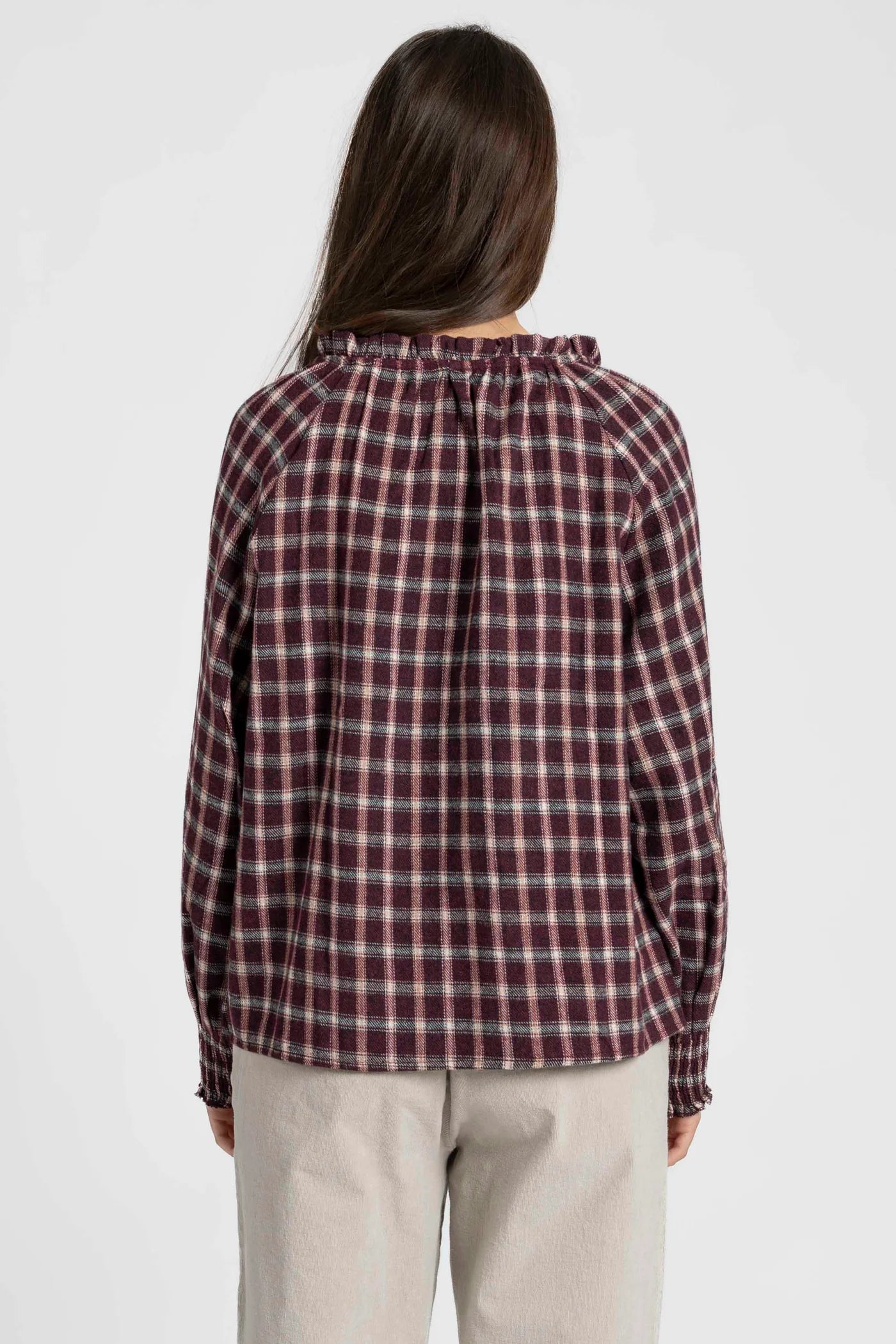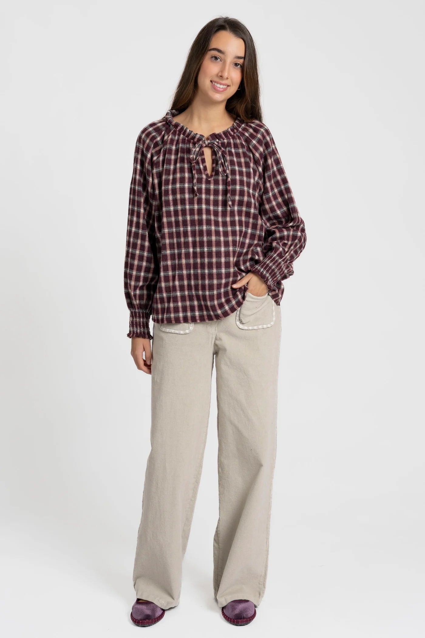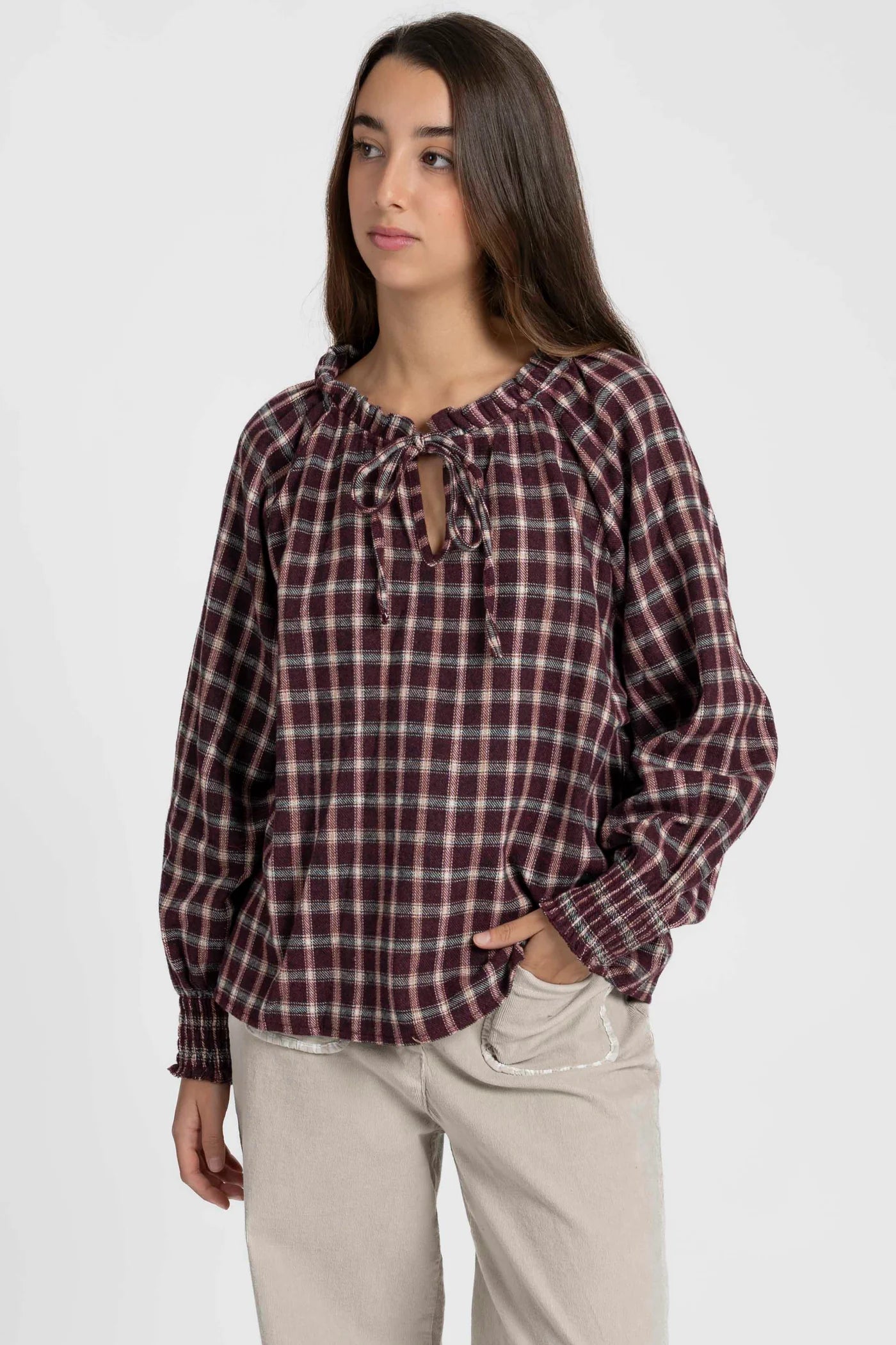 Com mangas compridas e punhos elásticos franzidos, esta blusa garante conforto e liberdade de movimento, mantendo um visual descontraído e elegante para o dia a dia.