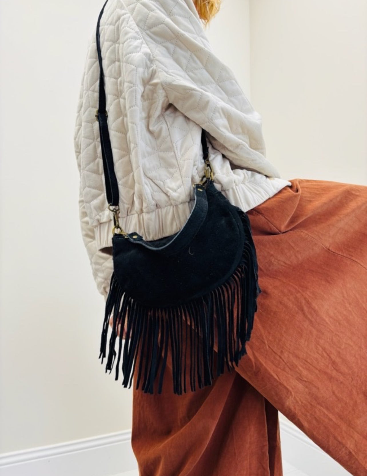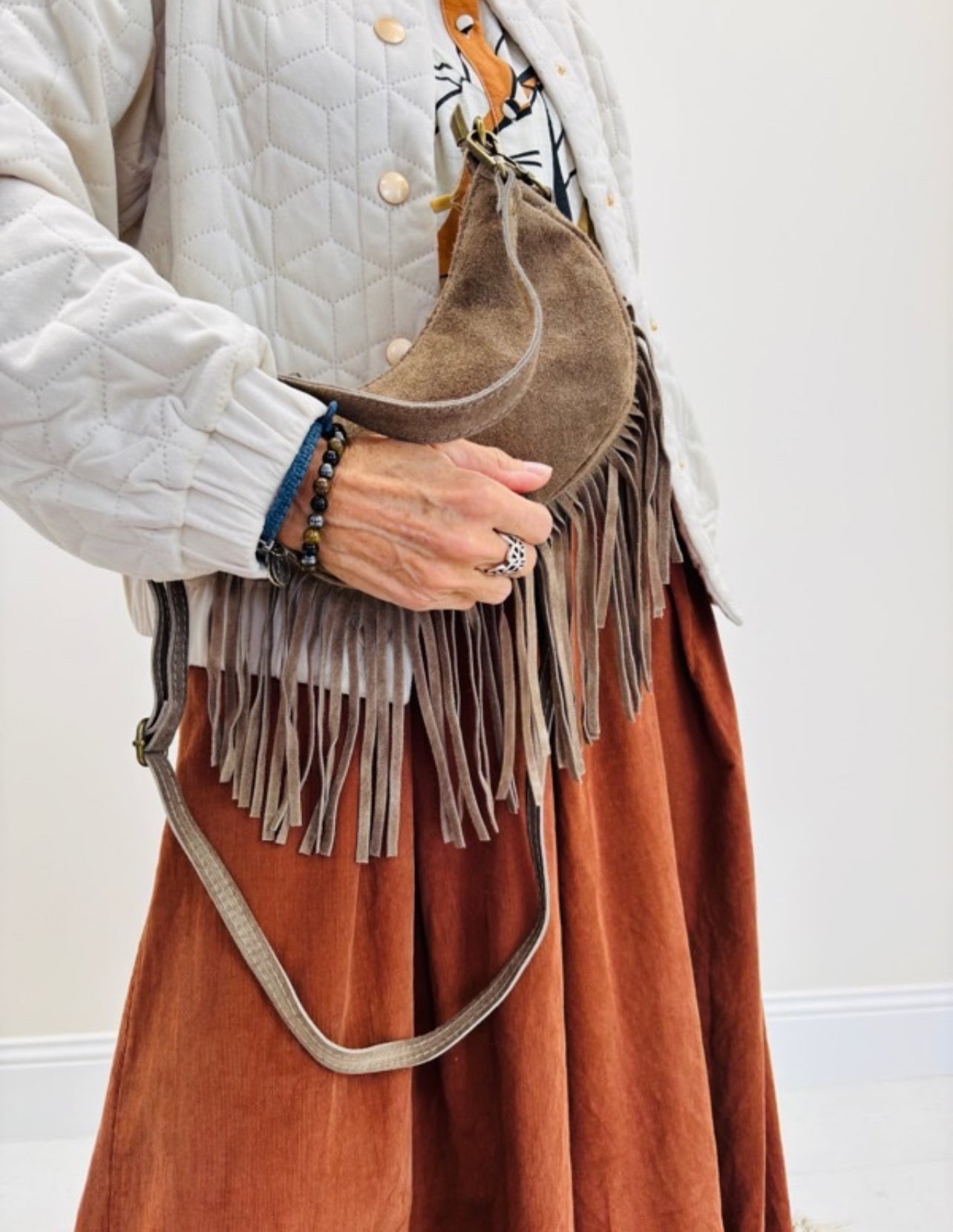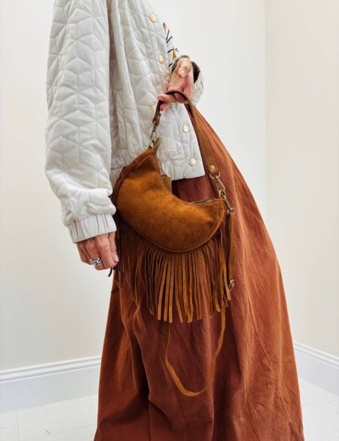 Confeccionada em pele verdadeira, destaca-se pela sua forma arredondada e pelas franjas longas que lhe conferem movimento e um charme irresistível.
