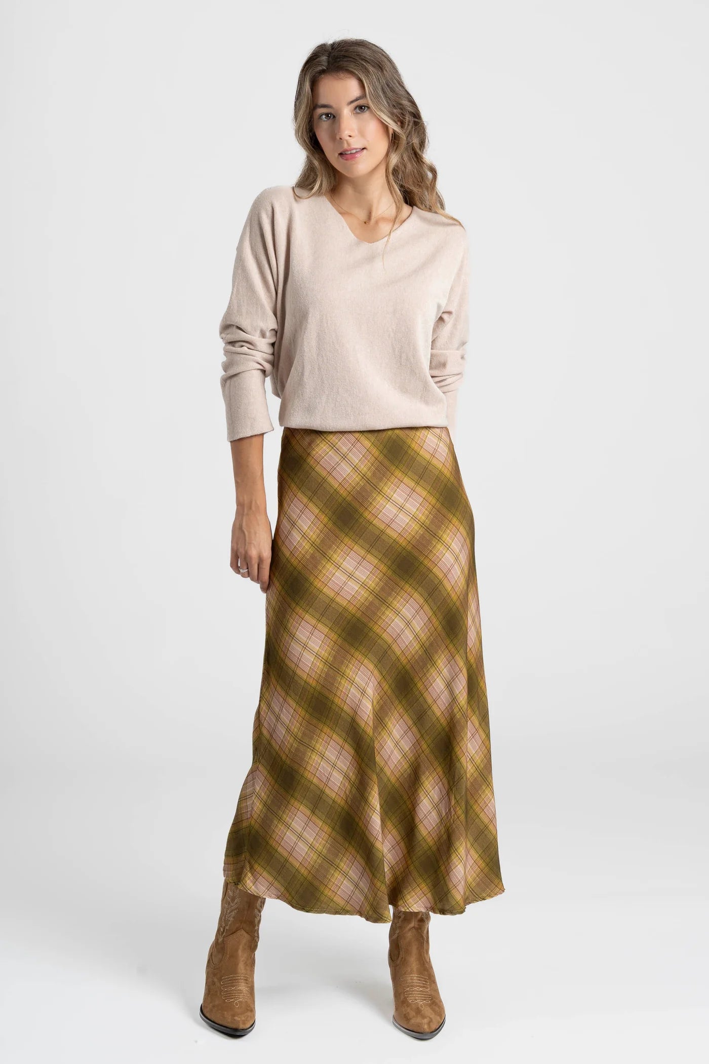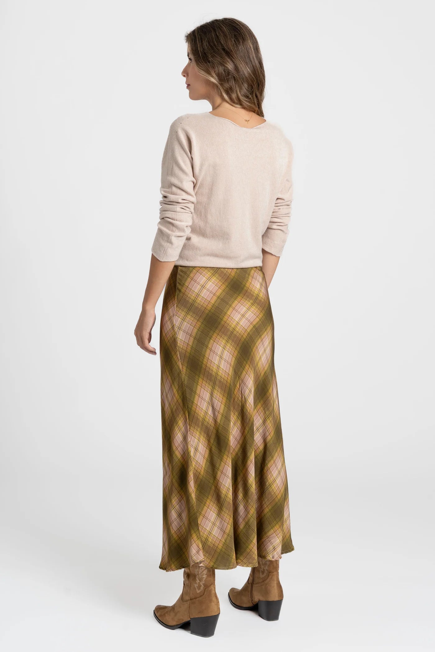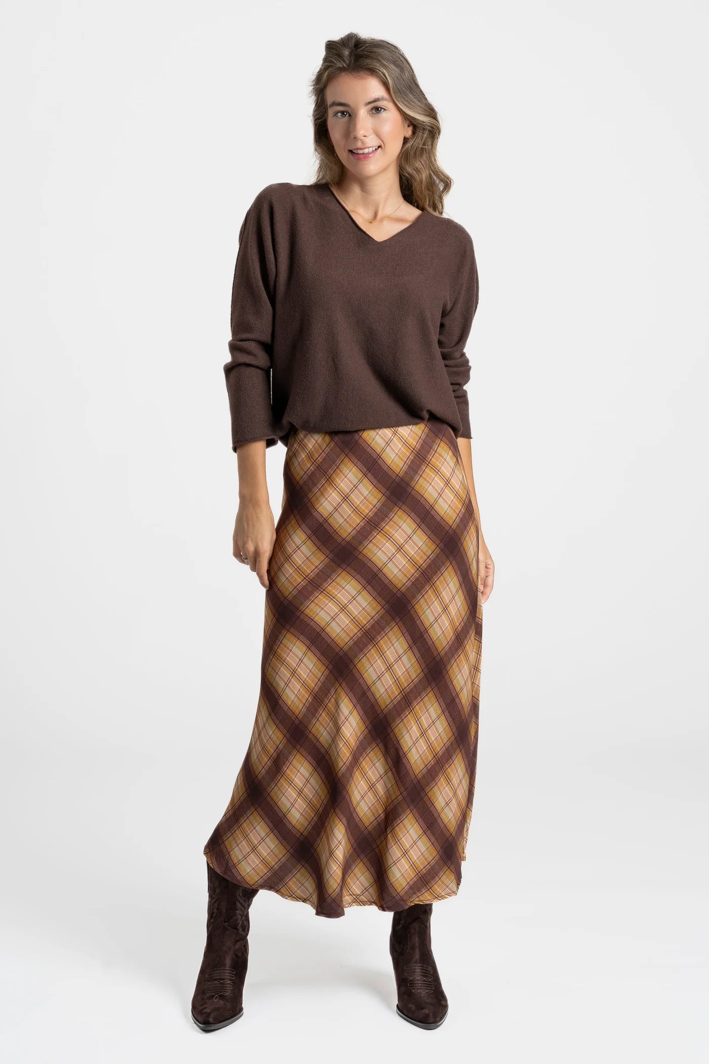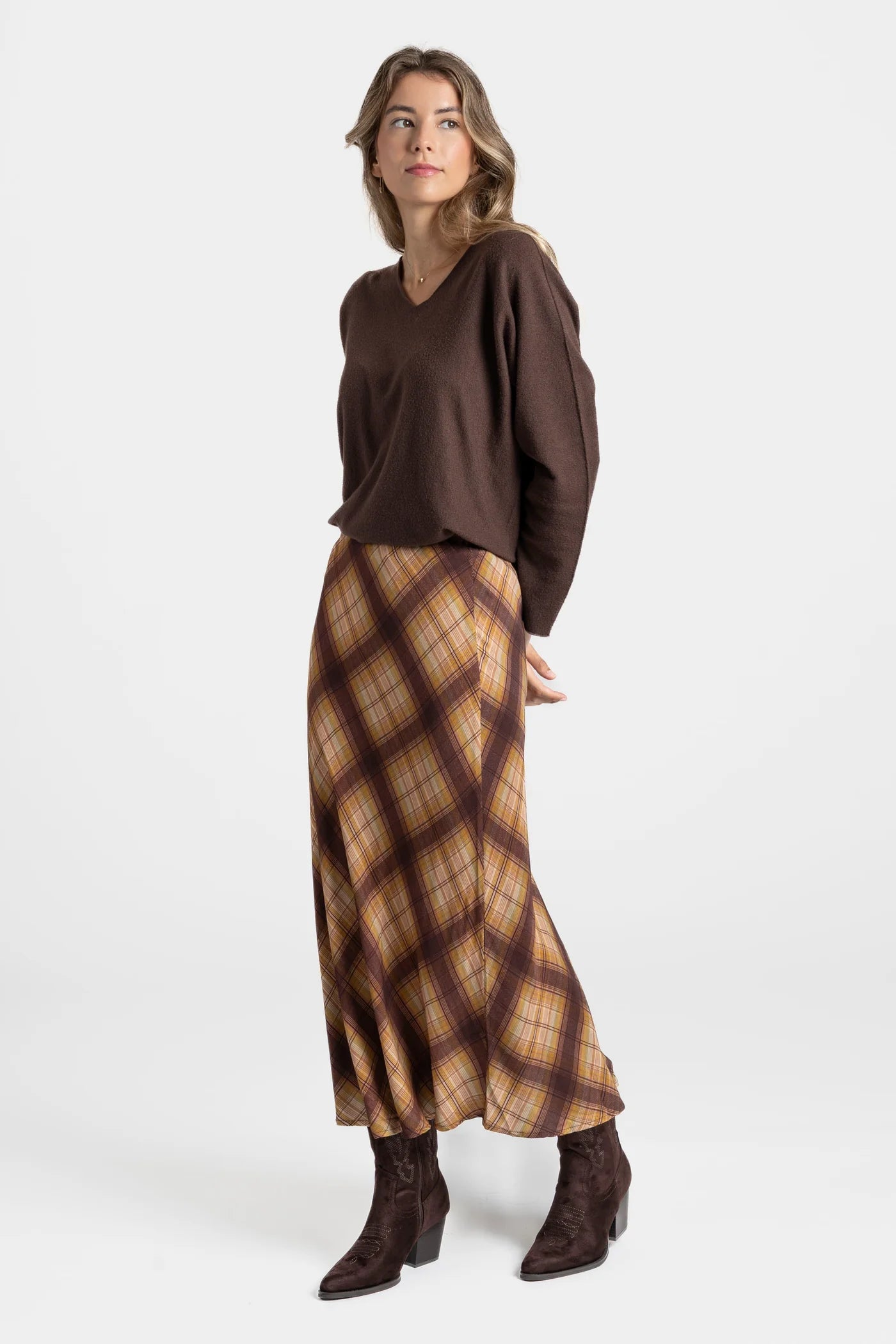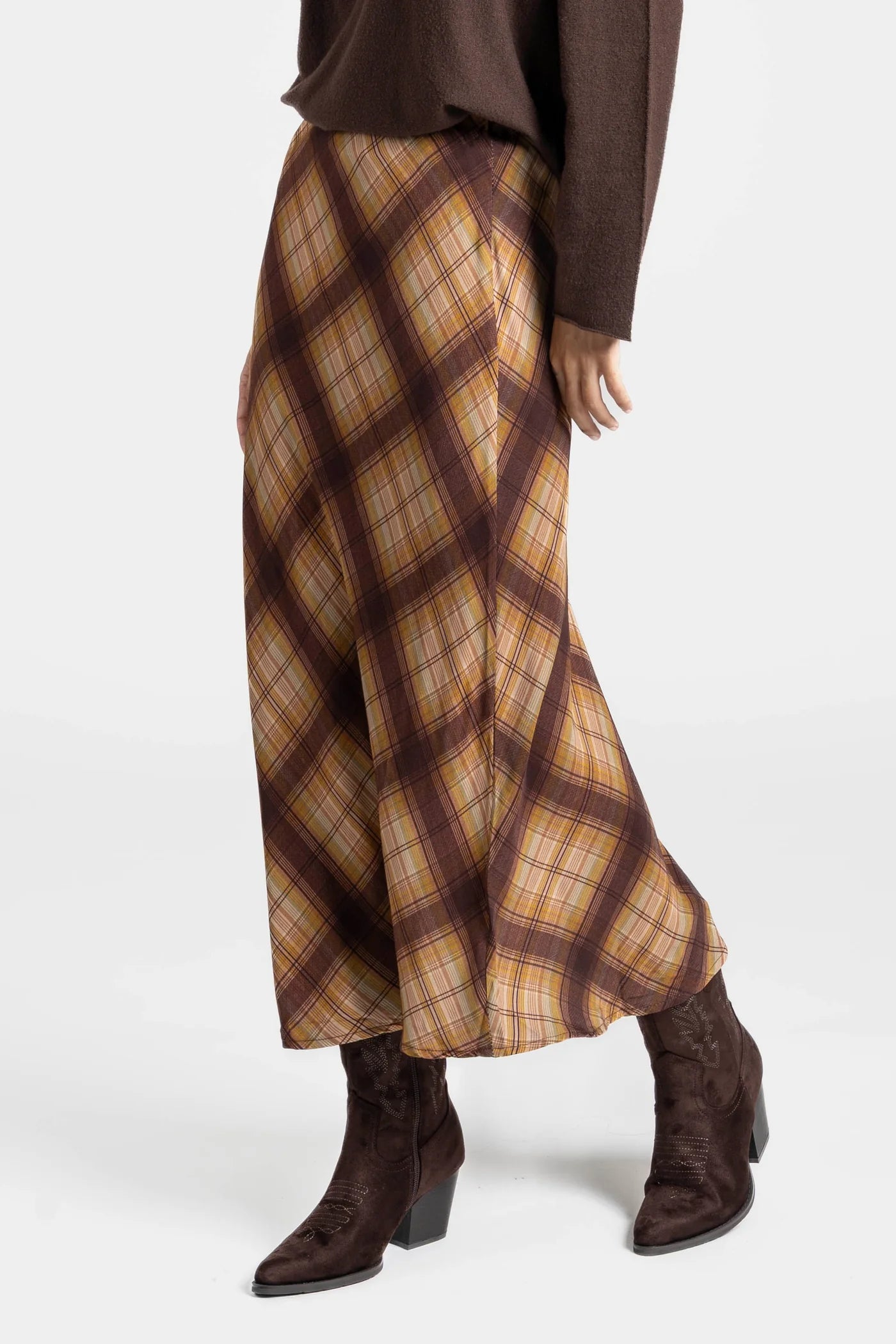 Saia midi de tecido fluido com estampado xadrez em tons quentes, perfeita para dar um toque vintage e sofisticado ao look.