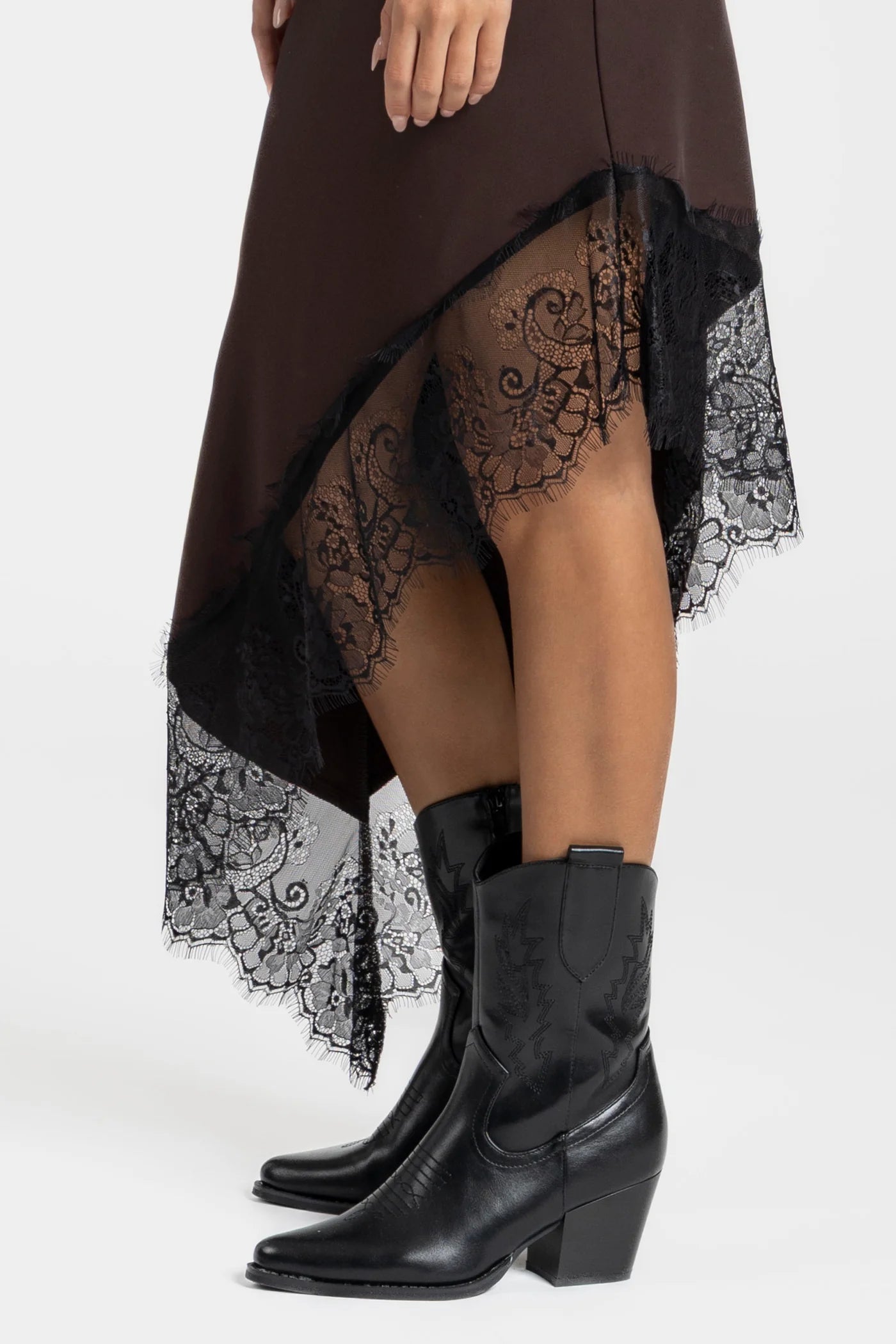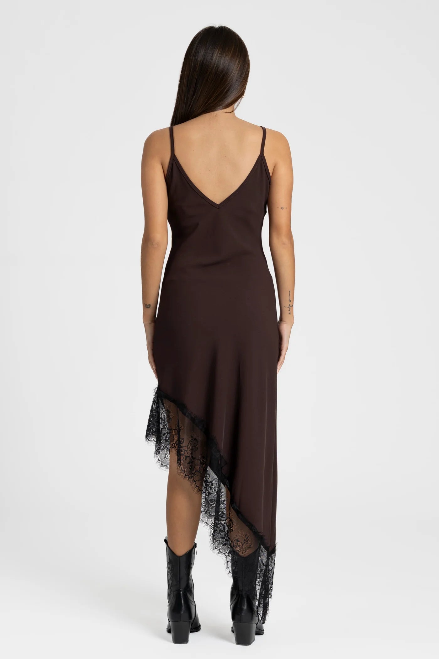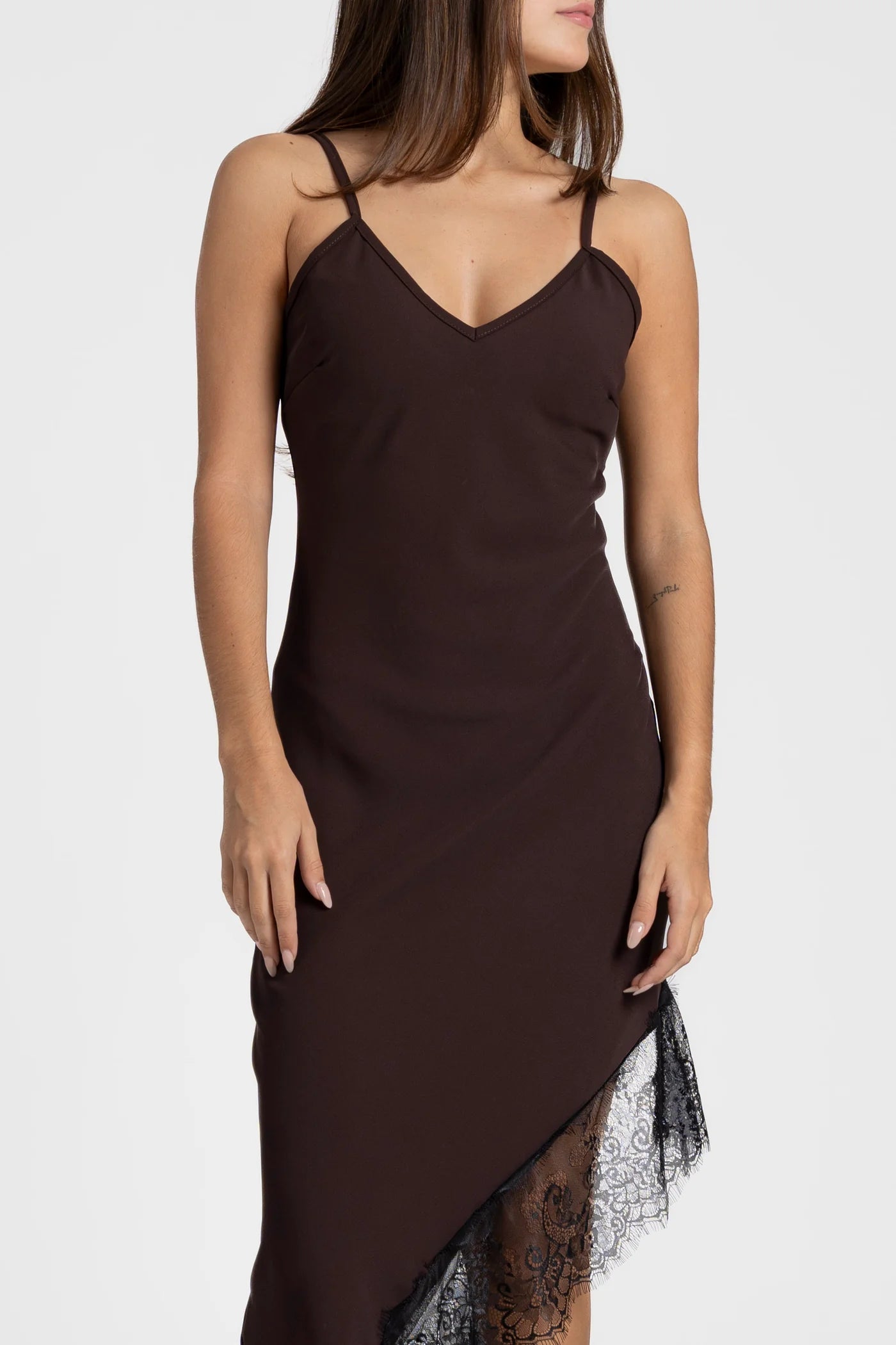 O seu design minimalista é realçado pelos finos tirantes e pelo decote em V, que alonga a linha do pescoço e valoriza o colo de forma subtil. O corte assimétrico confere dinamismo à peça, enquanto o detalhe em renda na bainha acrescenta um toque romântico e delicado, elevando o vestido a um nível de elegância única.