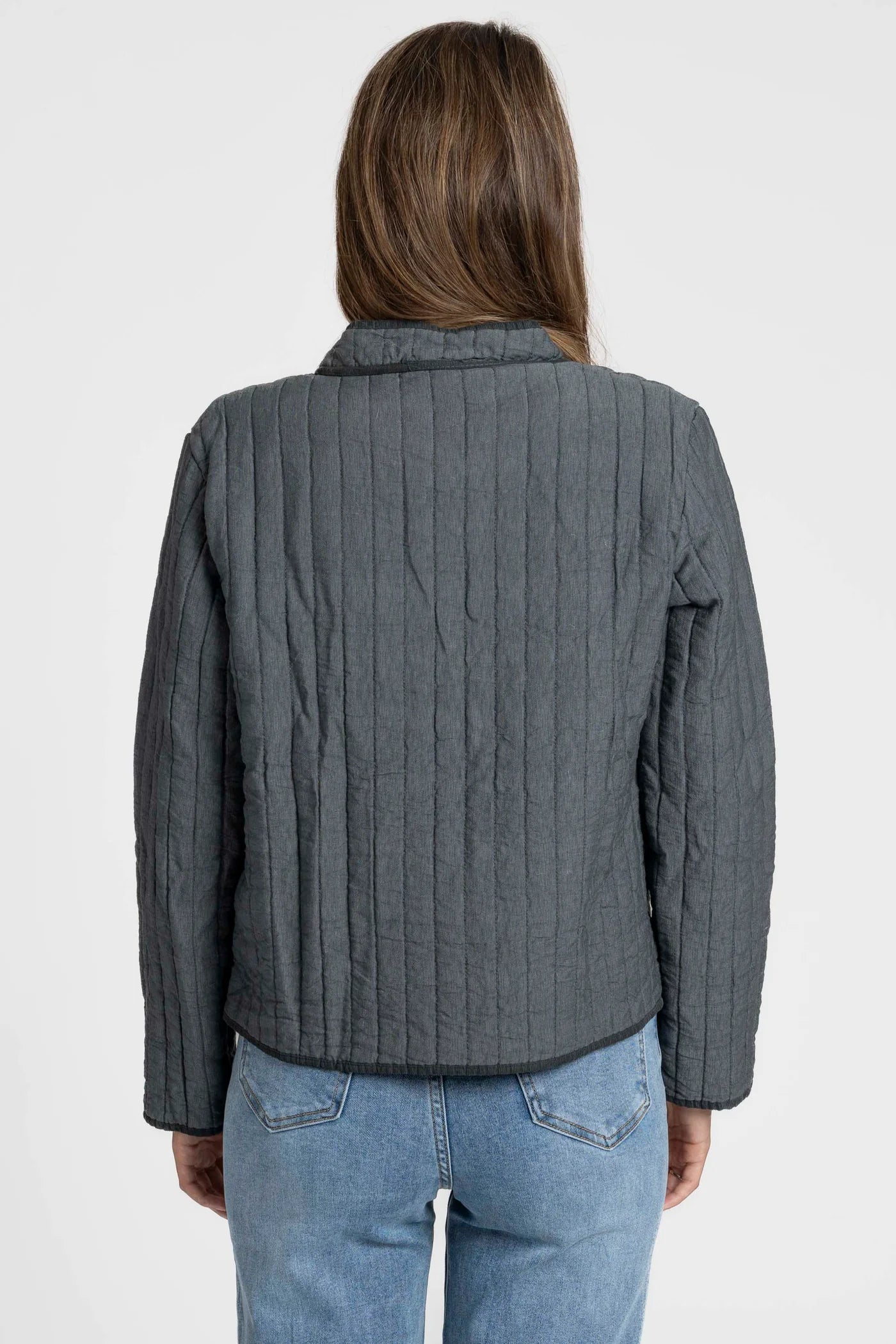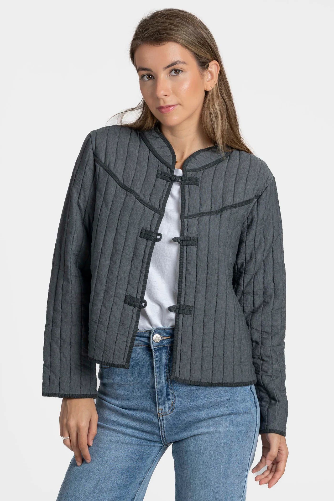 O design estruturado com pespontos verticais realça a textura do tecido, enquanto o fecho com laçadas decorativas confere um charme artesanal e distintivo. O colarinho redondo subido e as mangas compridas completam a silhueta elegante, perfeita para sobrepor a camisolas leves ou camisas.