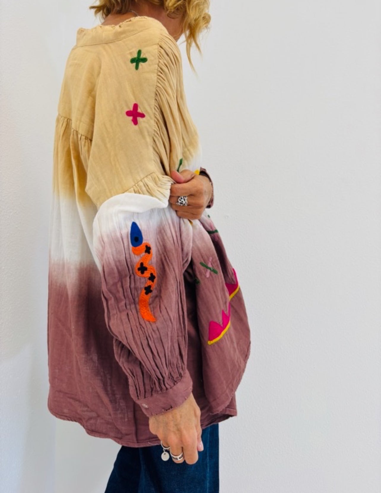 A sua corte amplo e fluido oferece máximo conforto, enquanto o degradé de tons suaves ganha vida através de bordados gráficos e coloridos que trazem uma vibração boémia e contemporânea.