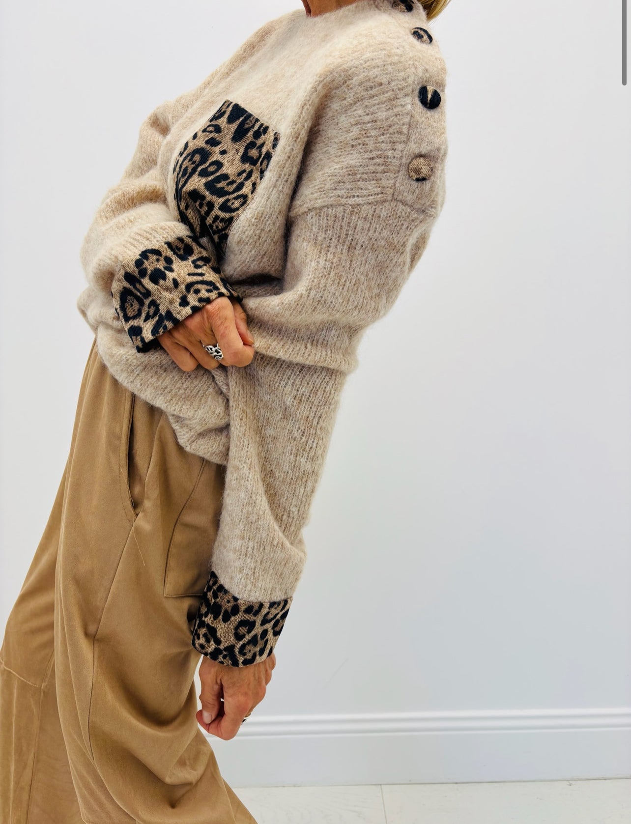 O design destaca-se pelos detalhes em padrão leopardo — presentes no bolso frontal, nos punhos e nos botões decorativos no ombro — que acrescentam uma nota sofisticada e moderna ao visual. A silueta ligeiramente ampla adapta-se harmoniosamente a diferentes tipos de corpo, oferecendo liberdade de movimento e um caimento natural.