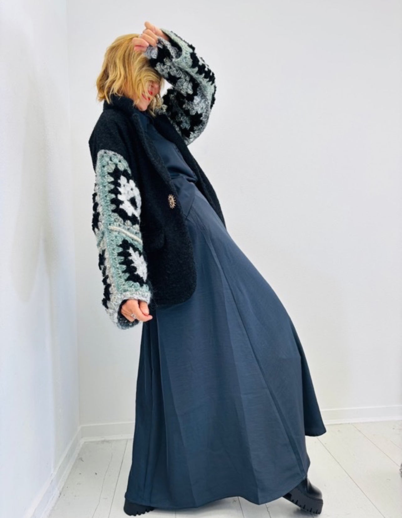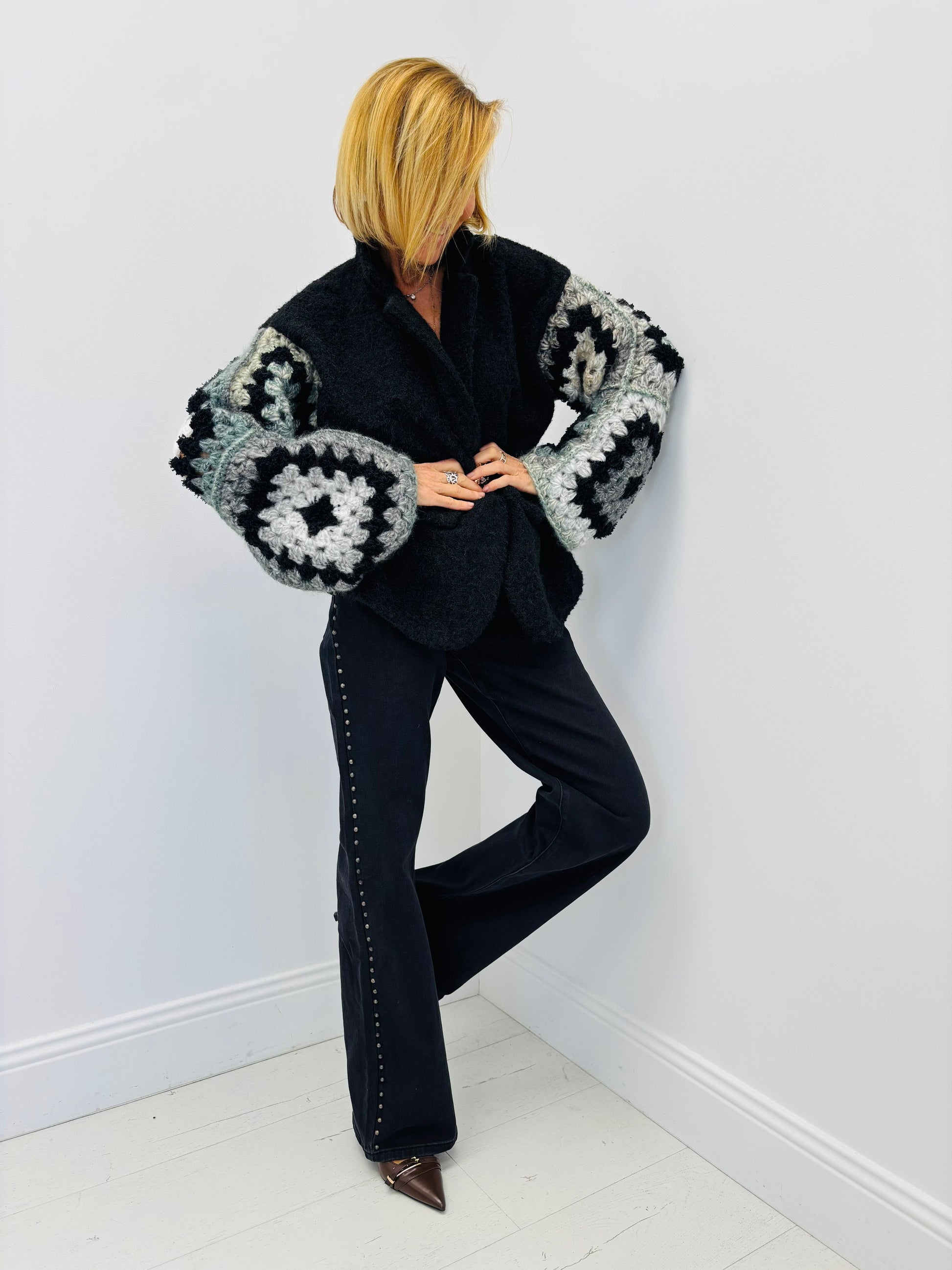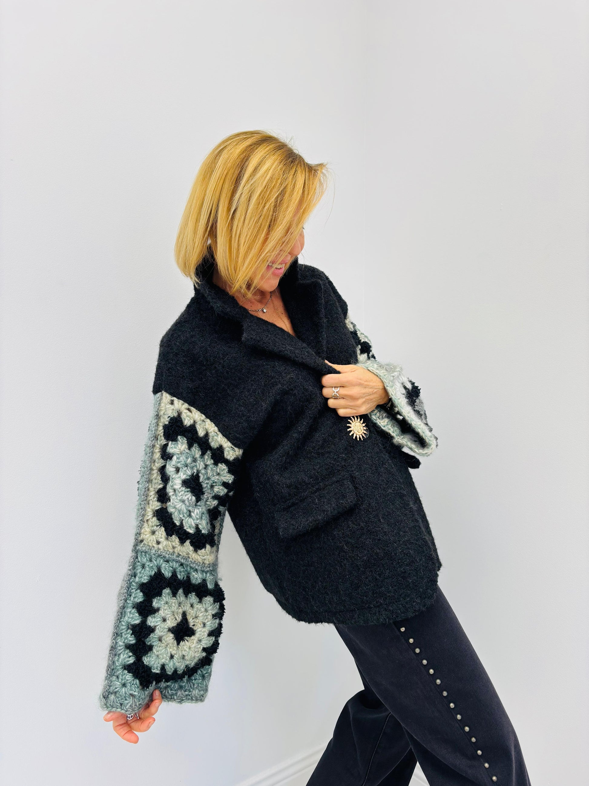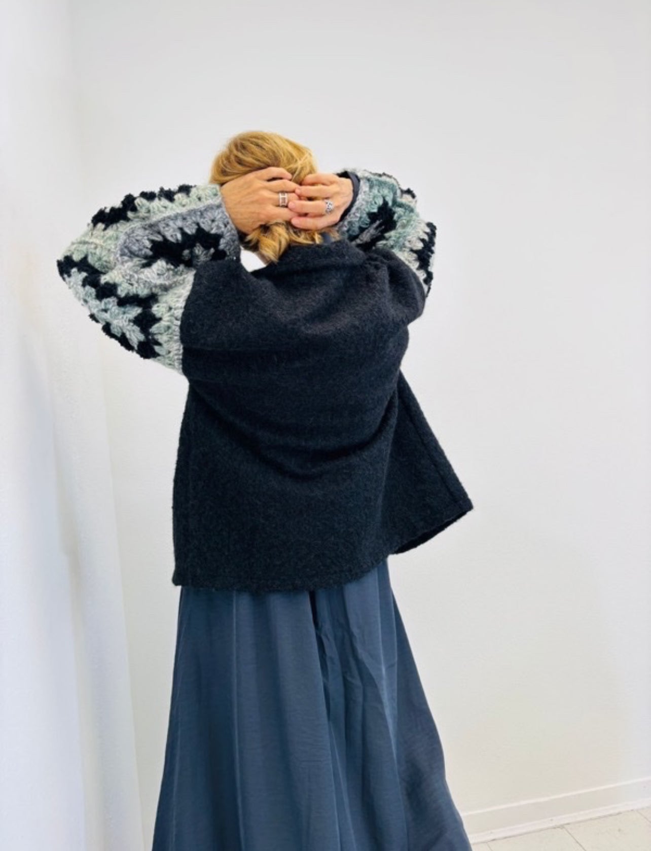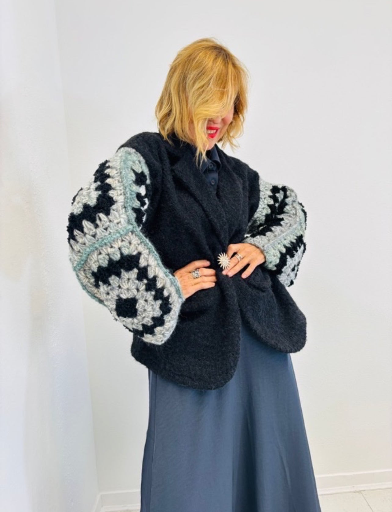 Com corpo em malha preta macia e mangas em croché colorido, cria um contraste sofisticado que o torna uma peça de destaque.