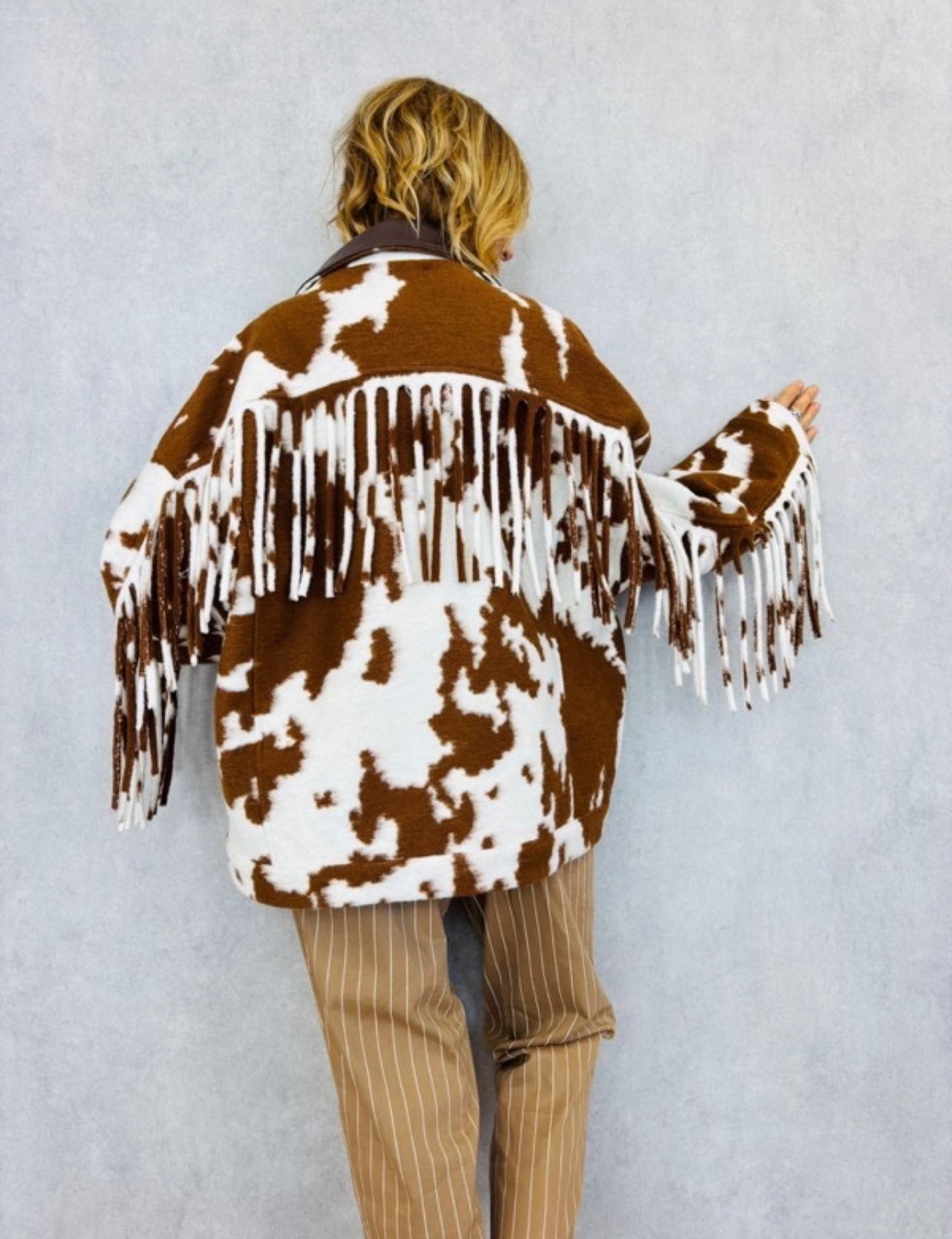 Original e cheia de personalidade, esta veste distingue-se pelo seu padrão “vachette” contrastante e pelas franjas decorativas que lhe conferem um espírito western moderno e arrojado.