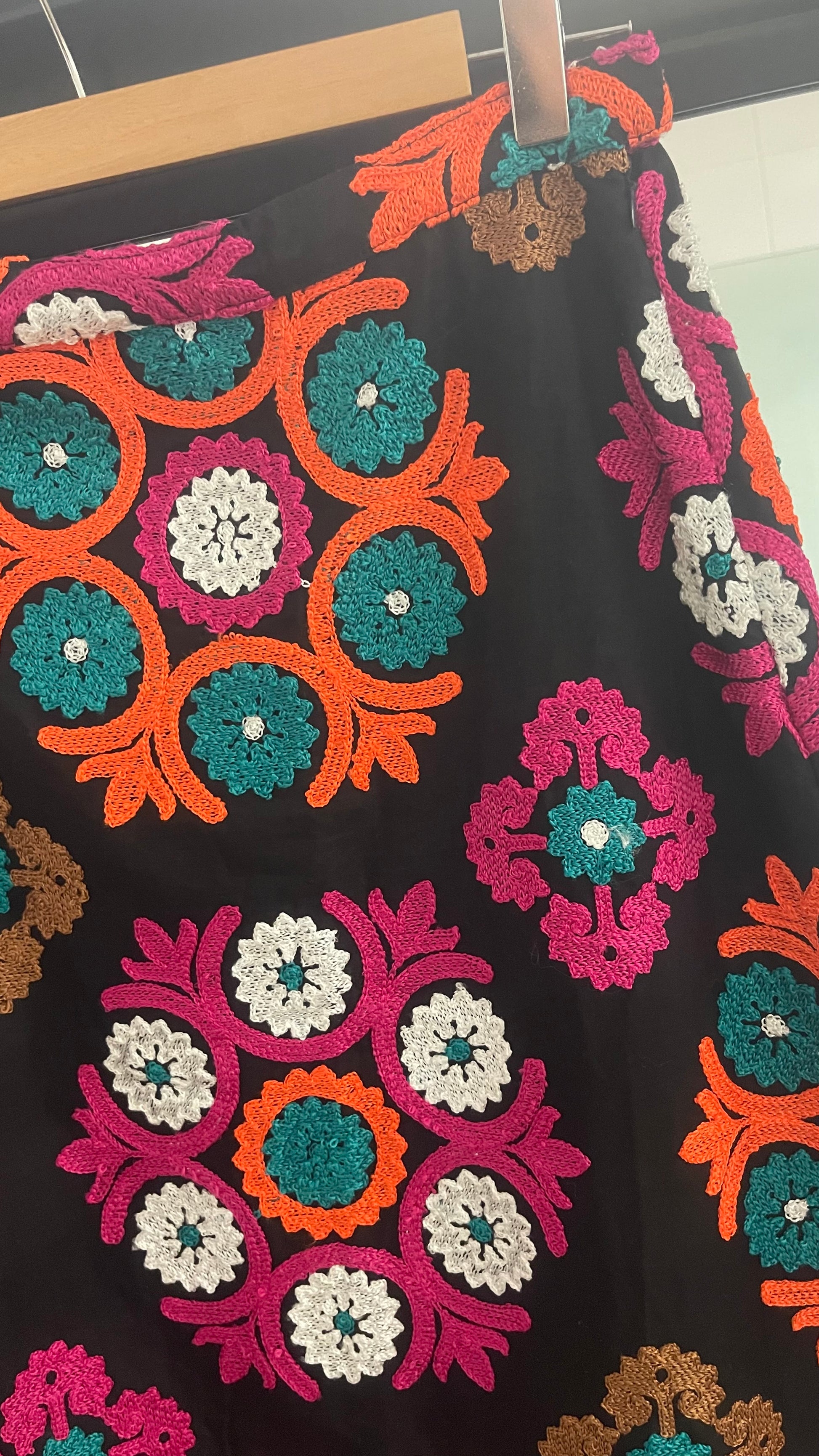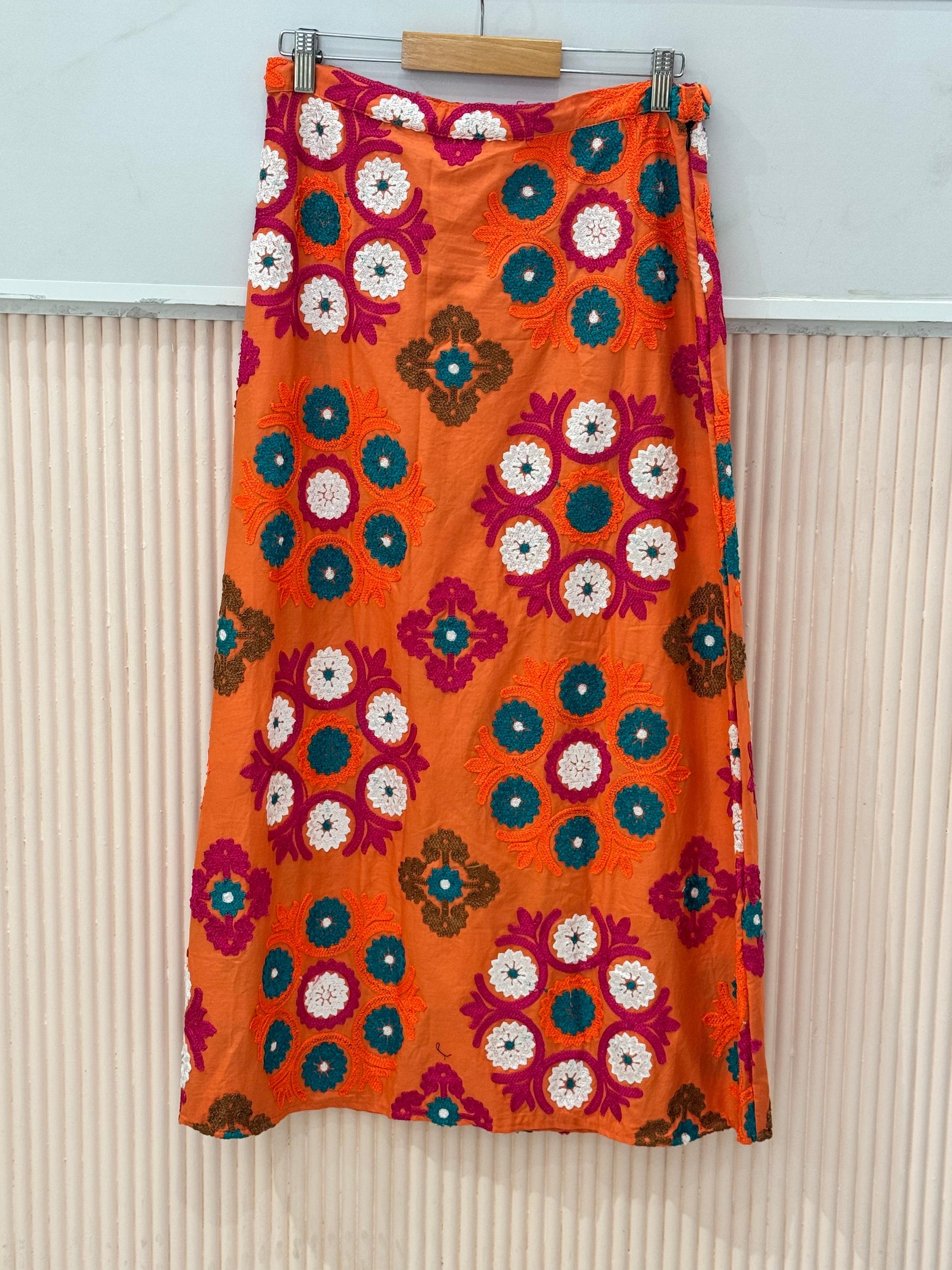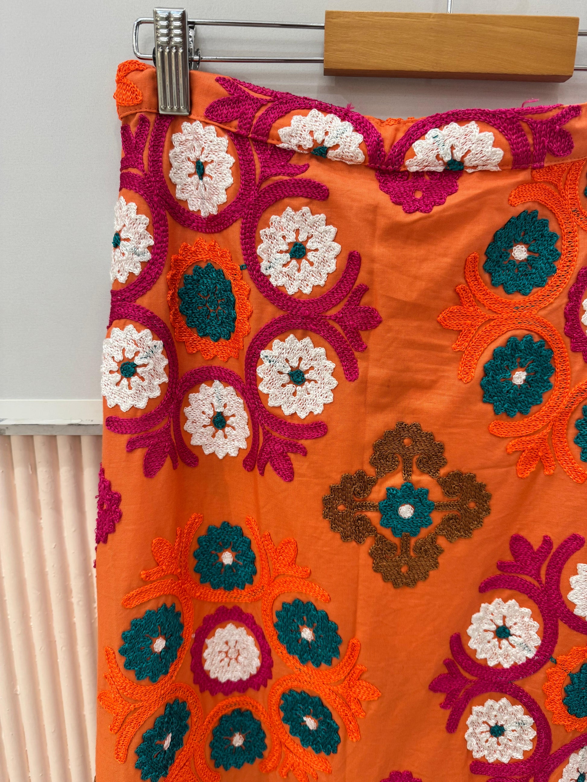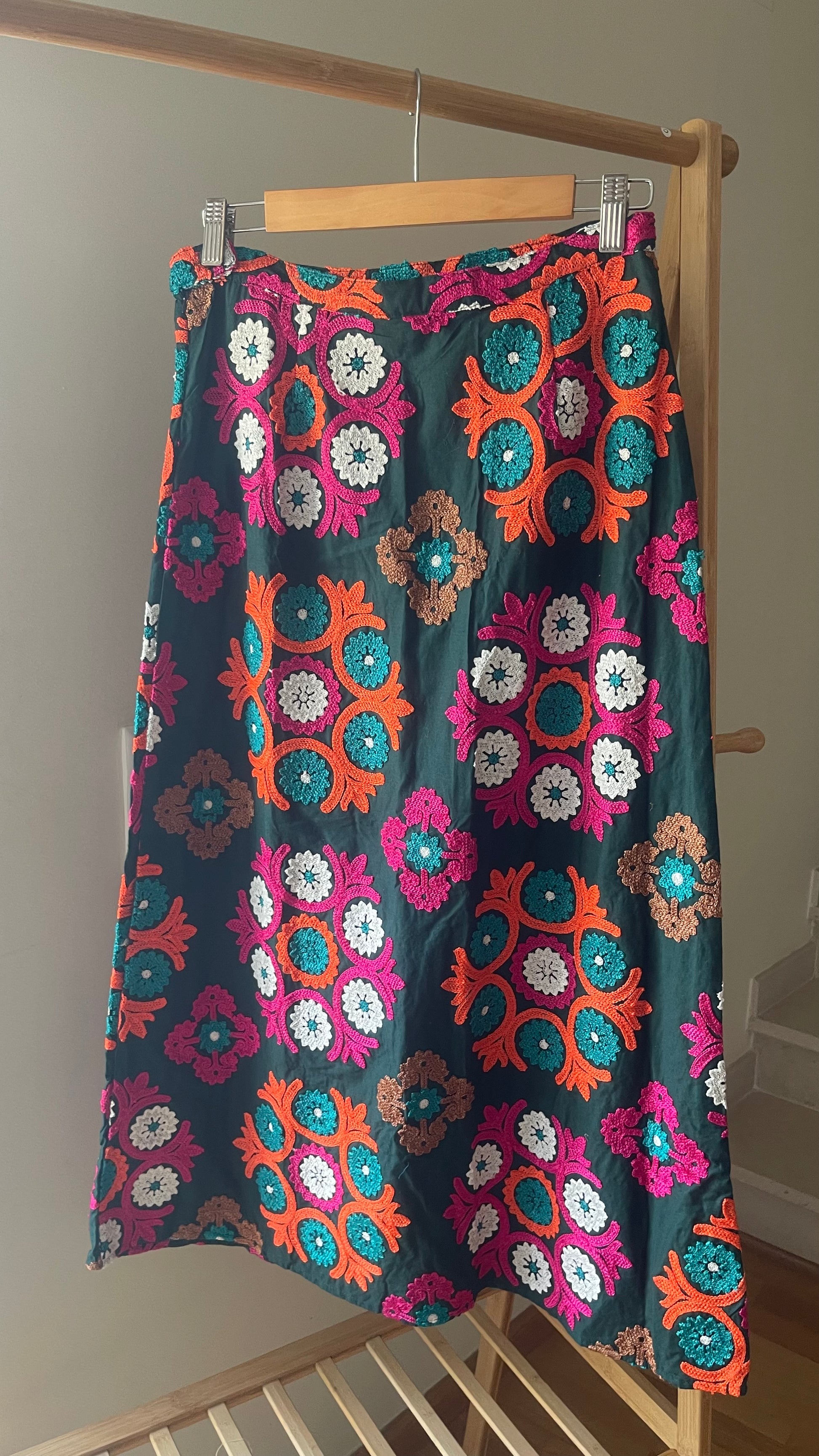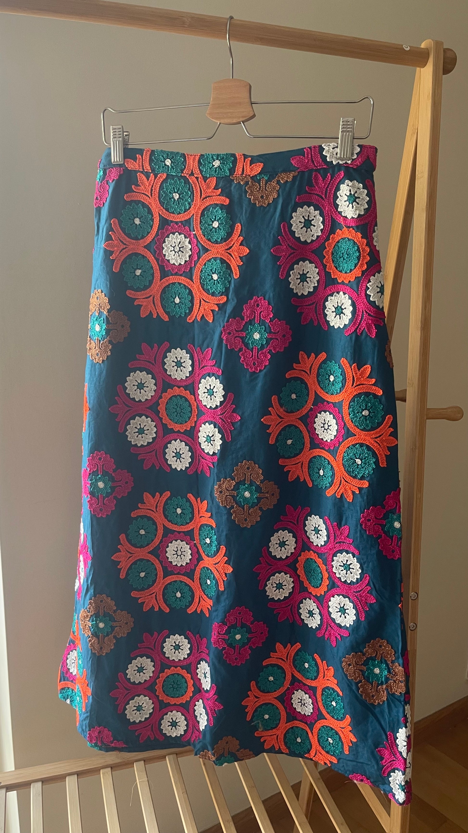 Uma saia que celebra a cor, a arte e a liberdade. Confeccionada em algodão, esta saia de tamanho único destaca-se pelos bordados coloridos ricos em detalhe, criando um visual vibrante, expressivo e cheio de personalidade.