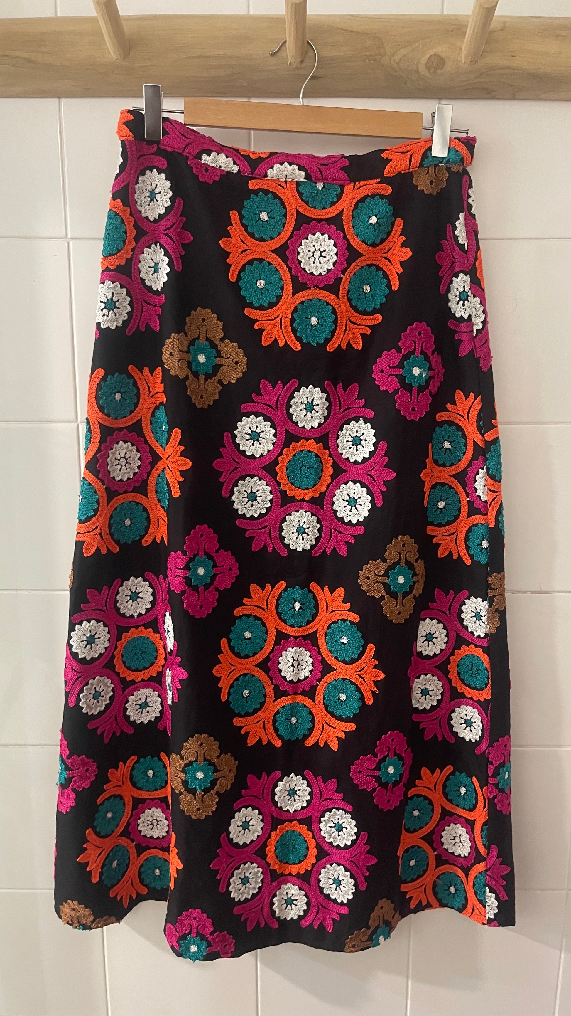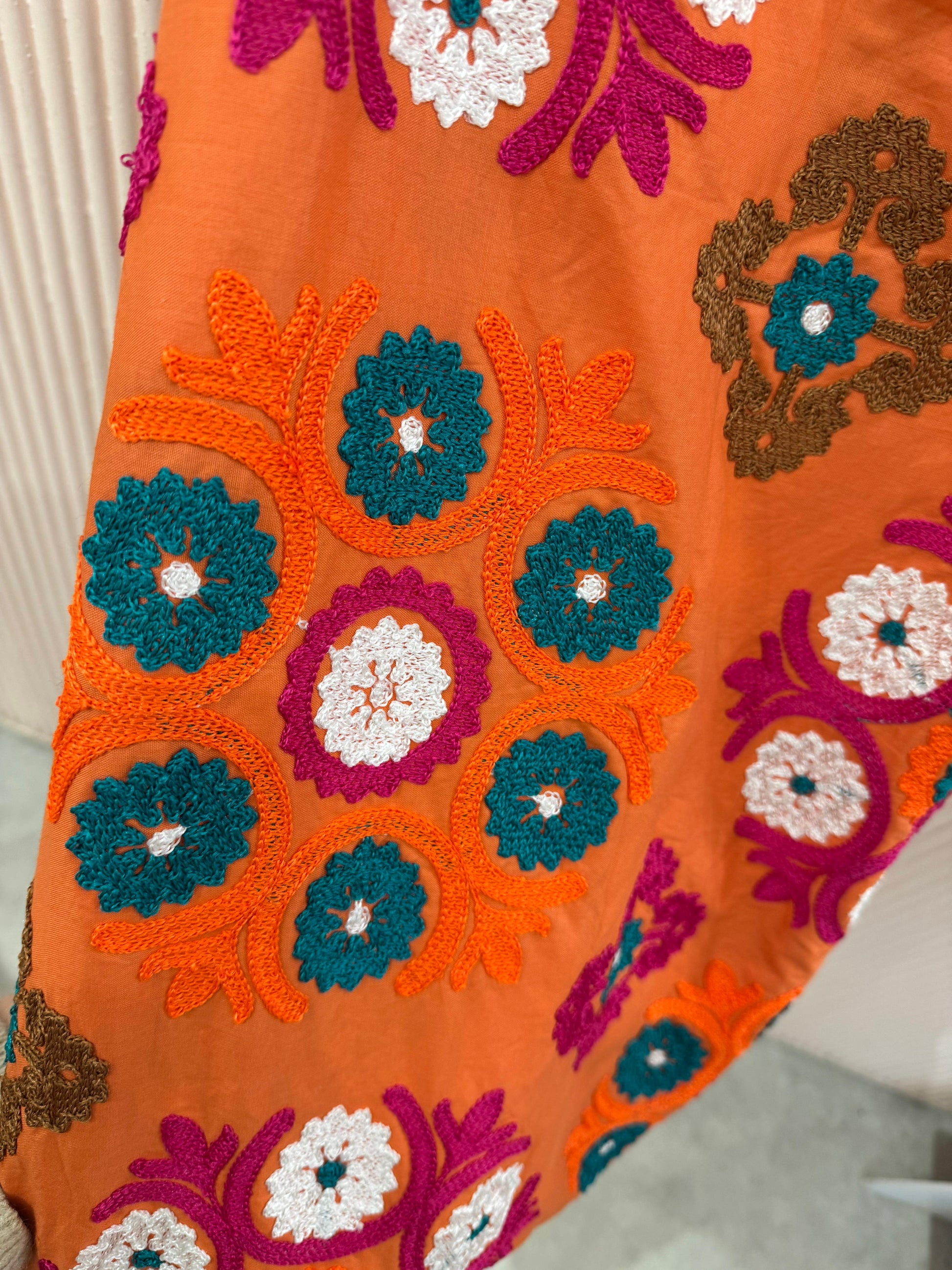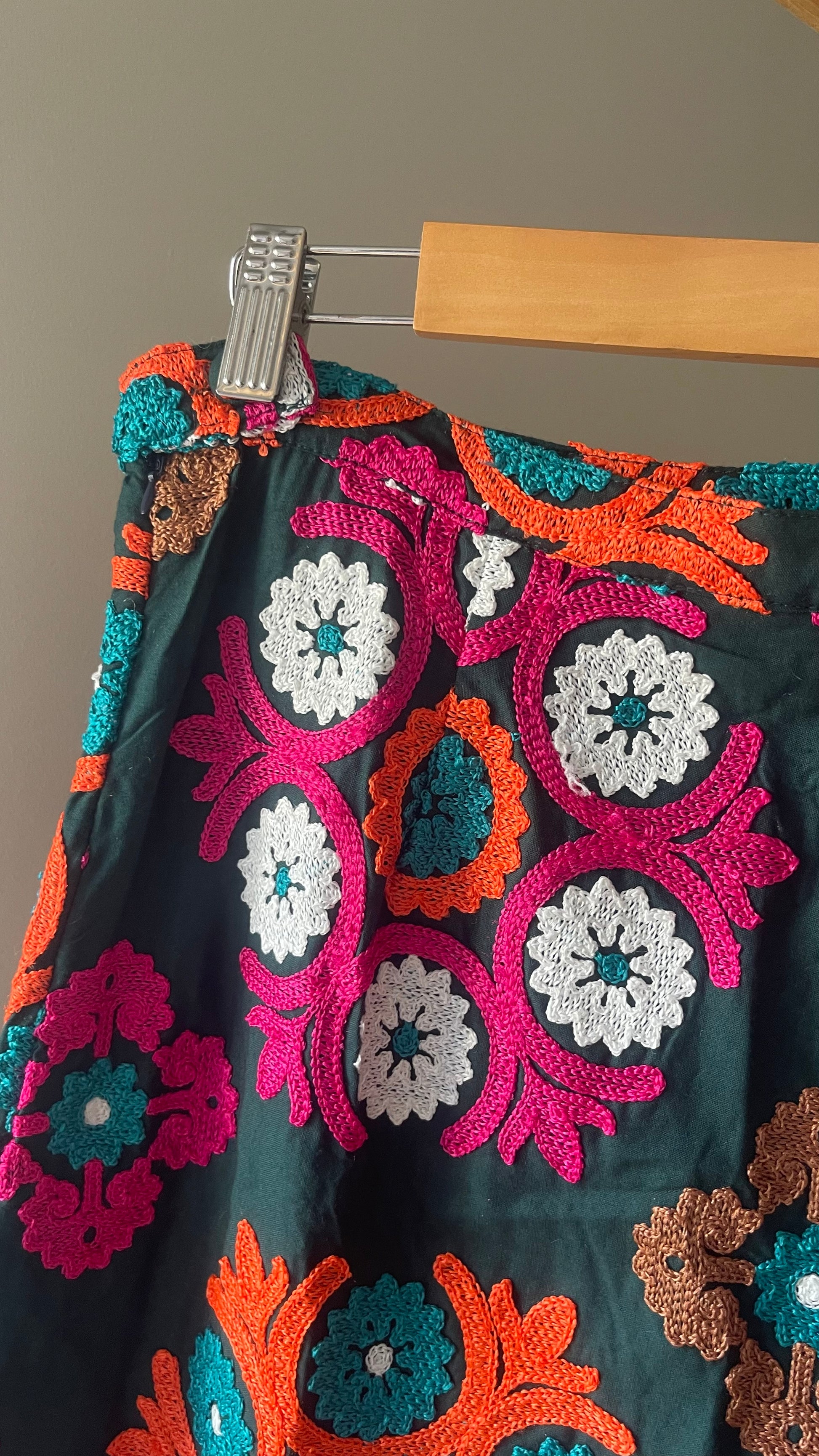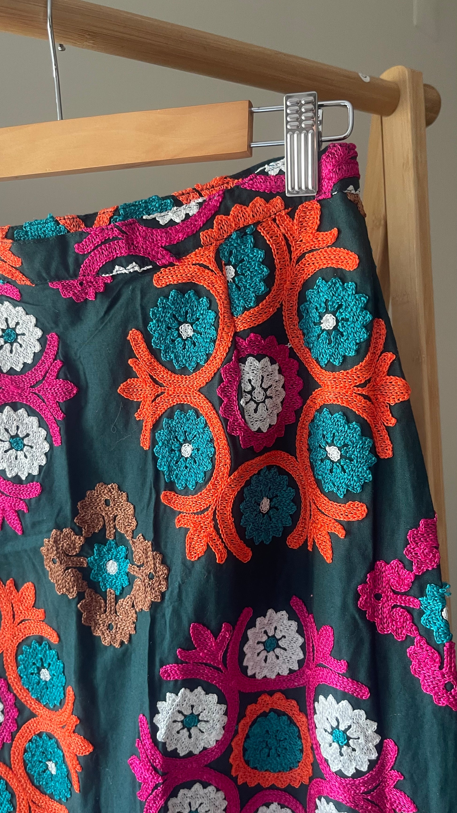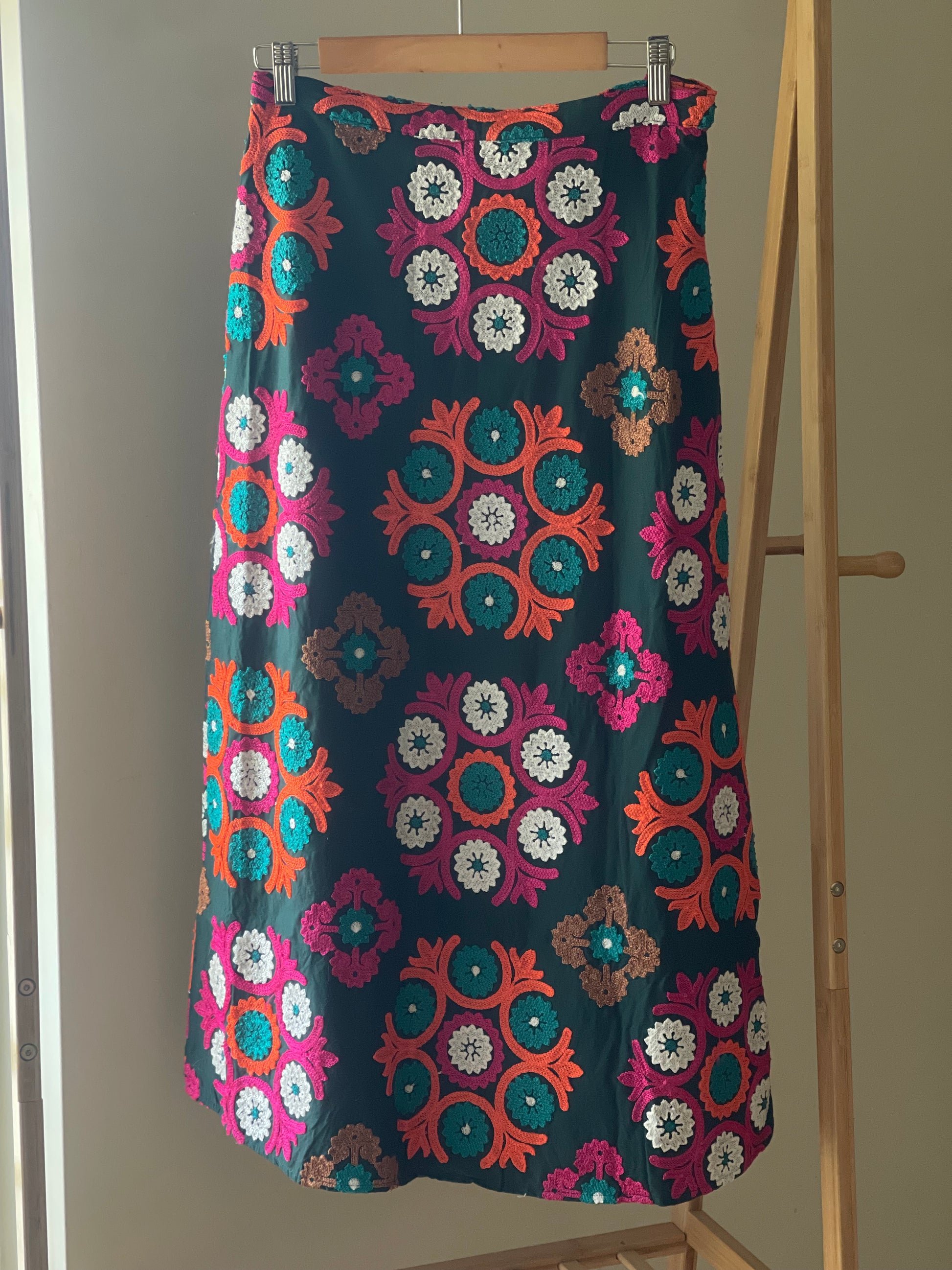 Uma saia que celebra a cor, a arte e a liberdade. Confeccionada em algodão, esta saia de tamanho único destaca-se pelos bordados coloridos ricos em detalhe, criando um visual vibrante, expressivo e cheio de personalidade.