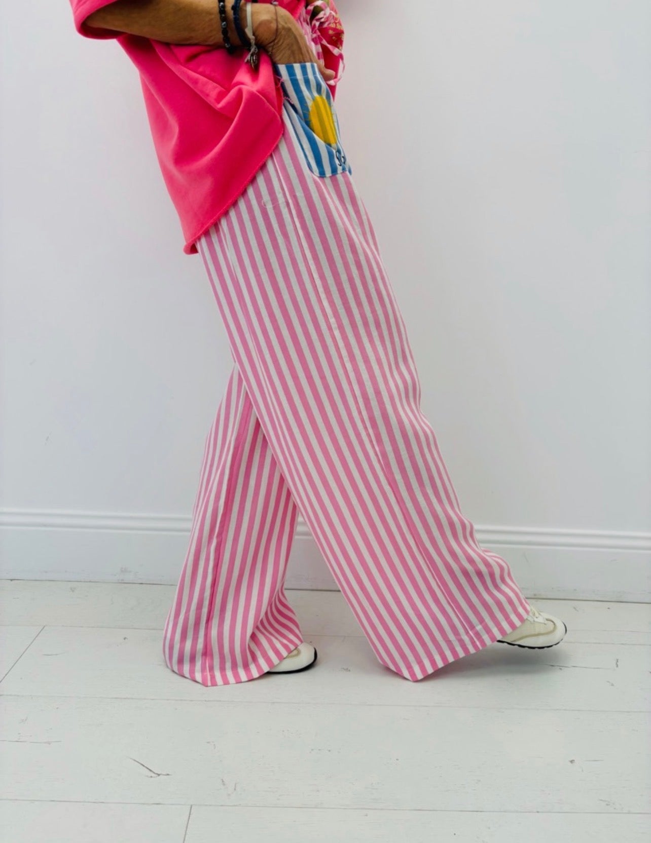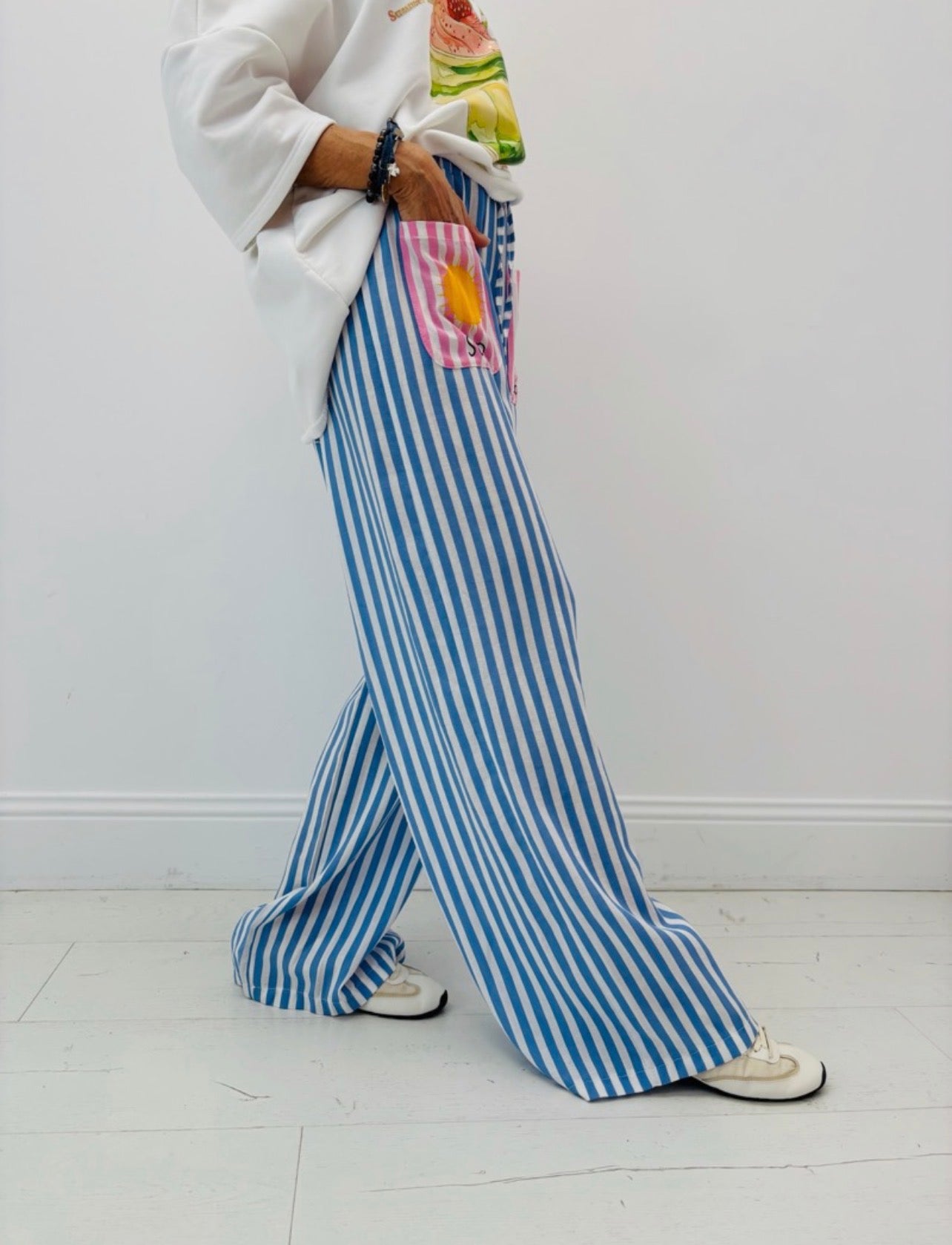 Com padrão às riscas em tons vibrantes e bolsos bordados com detalhes “sun” e “love”, são aquela peça que transforma qualquer look em algo especial e divertido.