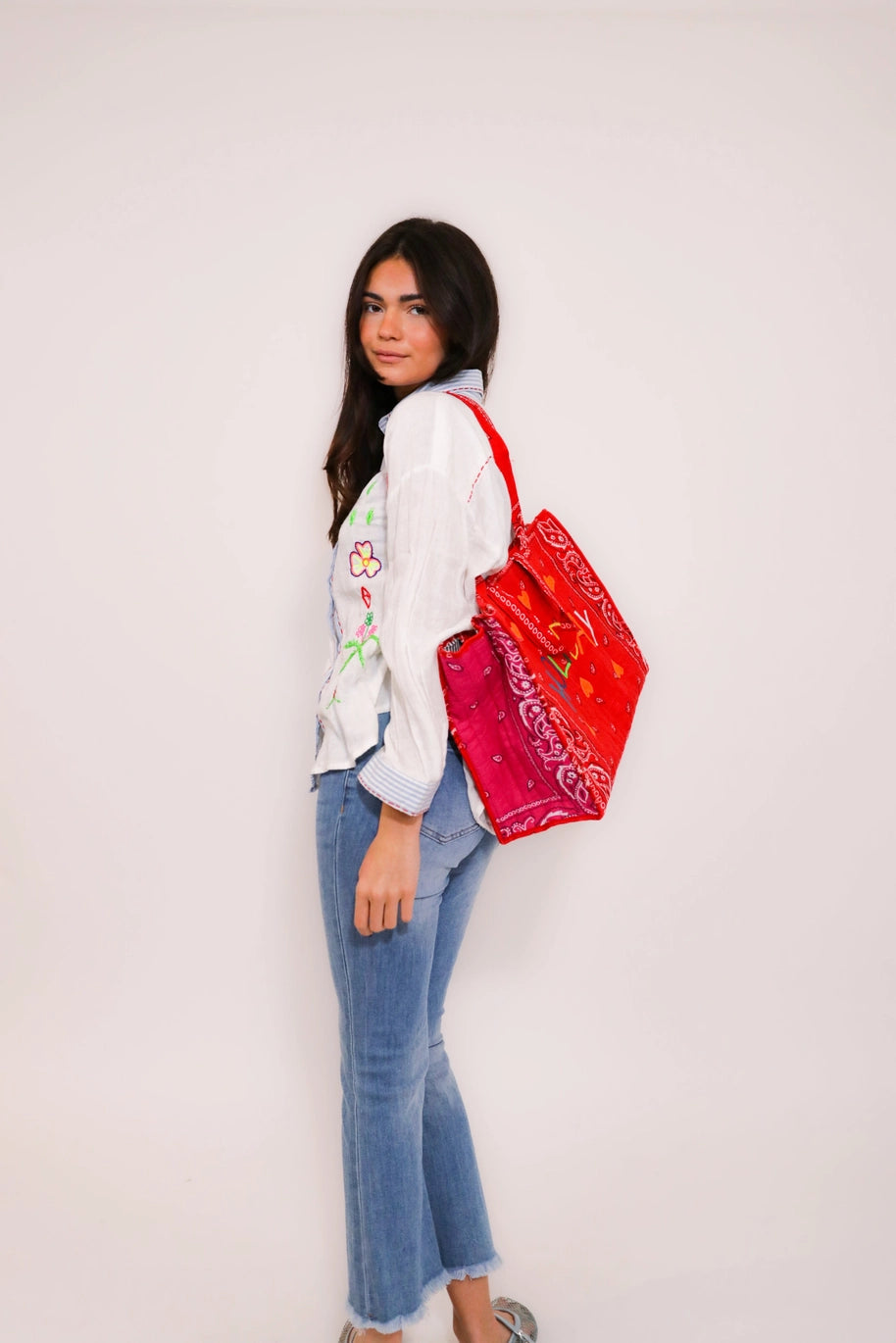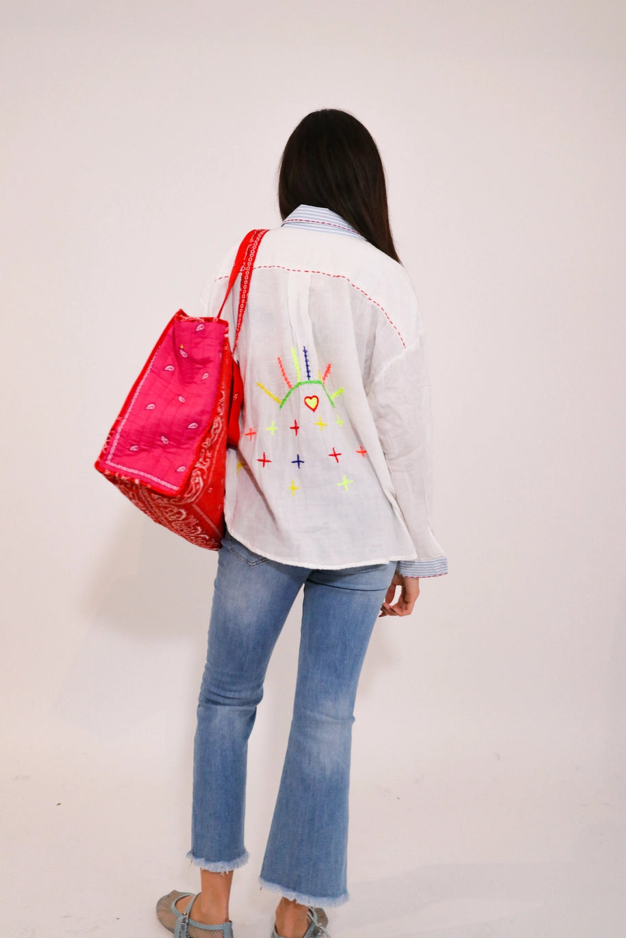 Bordada à mão com motivos florais coloridos, esta peça evoca paisagens solares e um imaginário folk delicado, pensado para ser usado sem esforço.