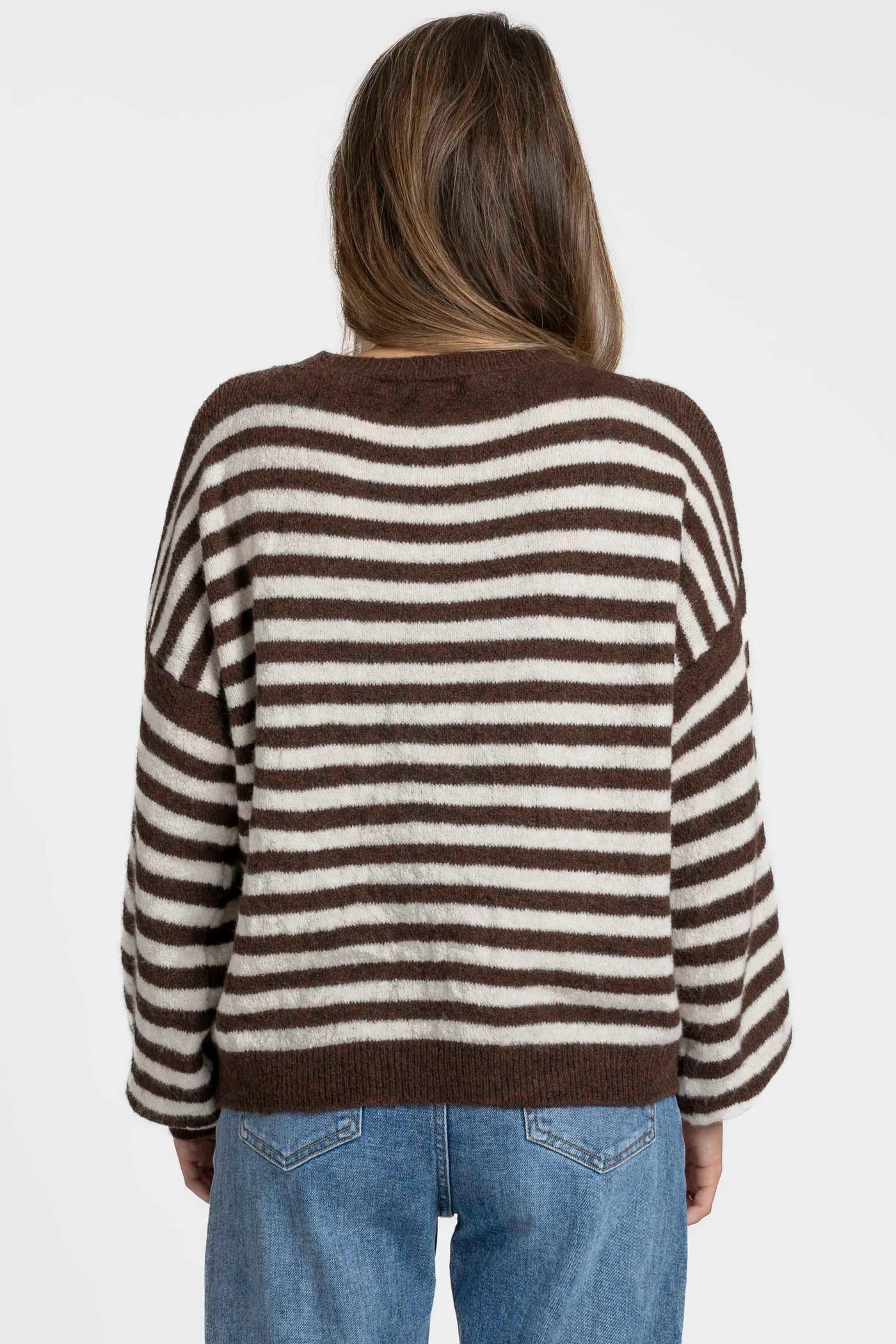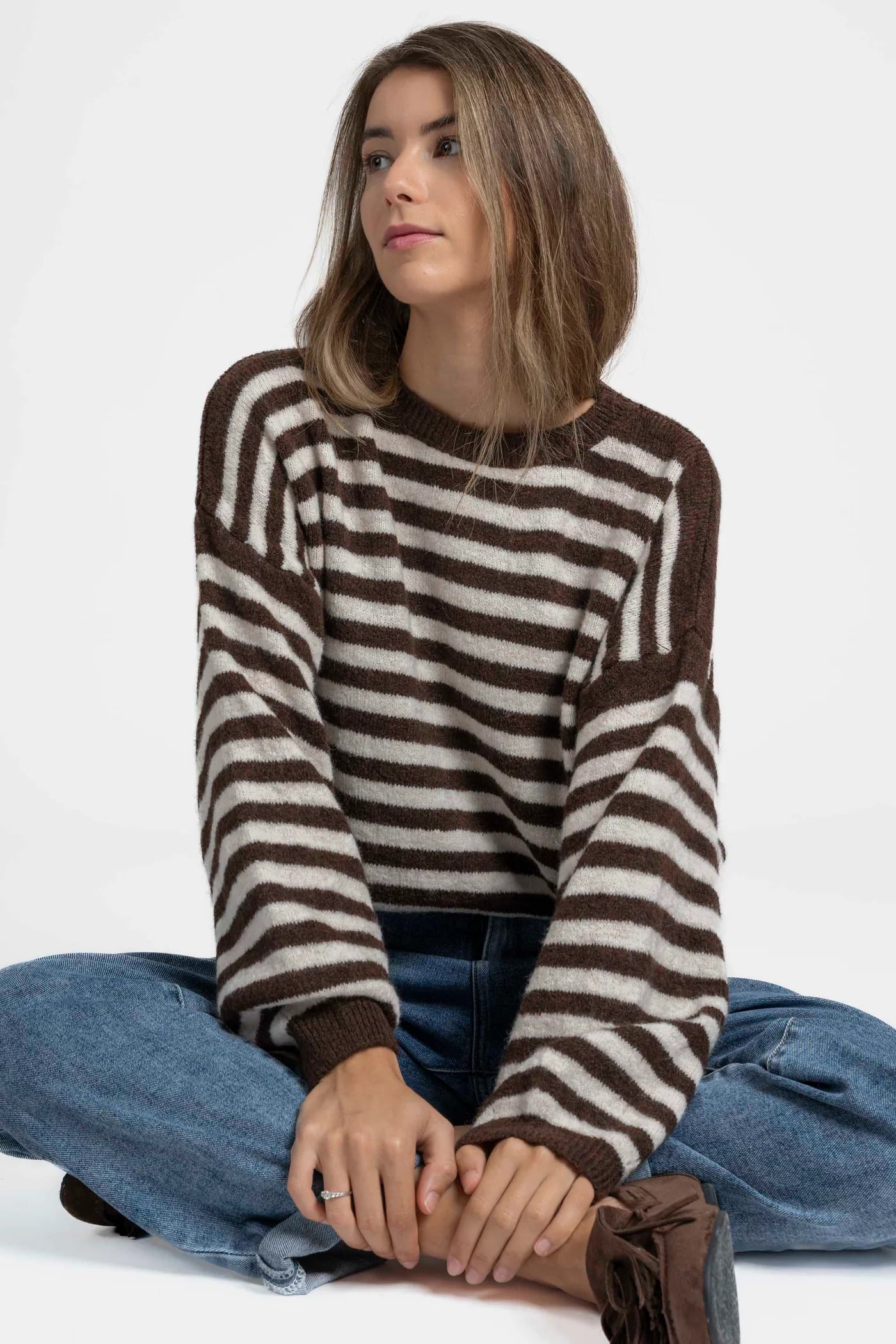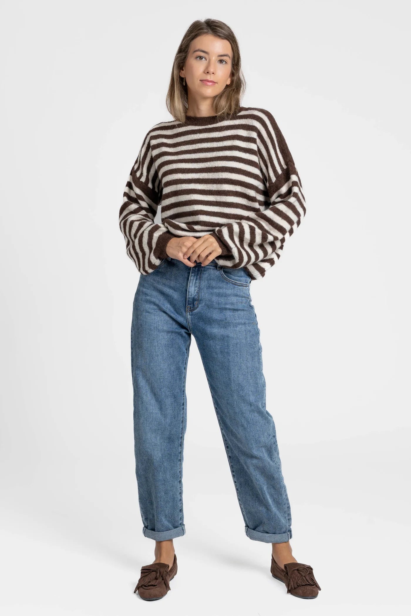 Um clássico renovado que combina conforto e estilo. Esta camisola às riscas, confecionada em malha suave e quente, é perfeita para os dias mais frios, mantendo um toque leve e agradável sobre a pele.