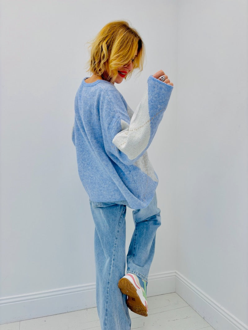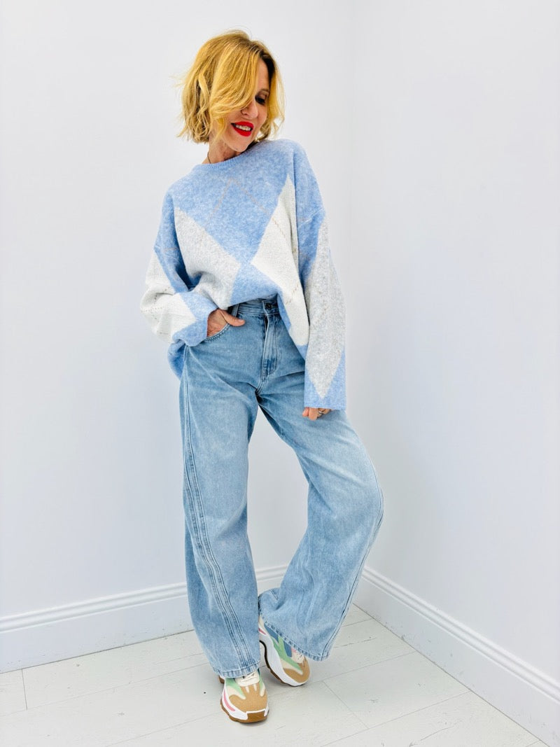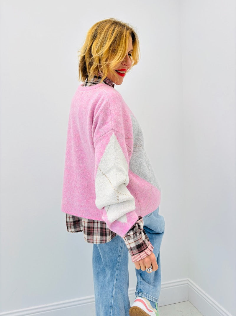 A combinação delicada de tons pastel — azul, rosa, creme e cinza — cria um jogo de losangos subtil, luminoso e intemporal, perfeito para atravessar estações com leveza.