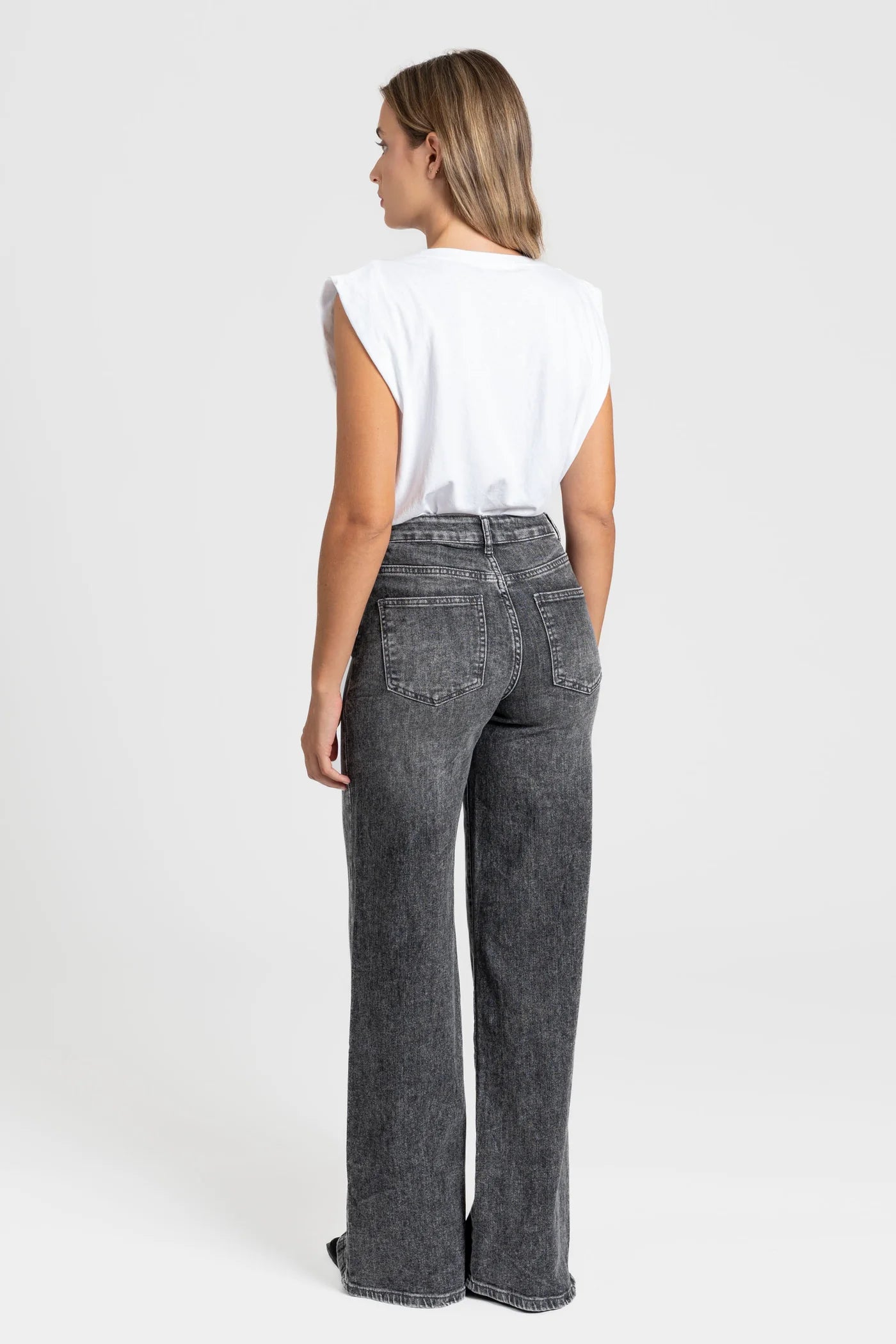 Calças em tecido de mistura de algodão com ligeira elasticidade, garantindo conforto e liberdade de movimentos. Modelo de corte reto e perna comprida, ideal para um visual moderno e alongado. Cintura subida, que valoriza a silhueta. Design clássico de cinco bolsos funcionais. Cós com passadeiras para cinto. Fecho frontal com botão metálico e braguilha de fecho éclair.
